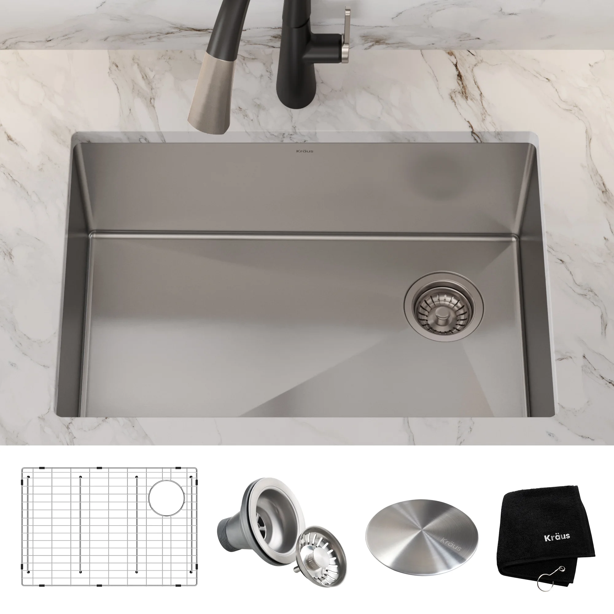 STAINLESS STEEL KITCHEN SINK with sleek universal design and easy-to-clean tightly rounded corners works with any decor style, from traditional to modern EXTERNAL DIMENSIONS: 27 in. L x 19 in. W x 10 1/2 in. D – BOWL DIMENSIONS: 25 in. L x 17 in. W x 10 in. D – Minimum Cabinet Size: 30 in. KIT INCLUDES: Kitchen sink, protective bottom grid, drain assembly with decorative cover, Kraus kitchen towel, mounting hardware, cutout template DURABLE 16 GAUGE SINK: Heavy-duty TRU16 gauge stainless steel sink offers long-lasting durability with great resistance to corrosion, dents, and damage SINGLE BOWL KITCHEN SINK with rear-offset drain offers a modern look and uninterrupted work surface for large cookware; maximizes storage space in the base cabinet – DEEP KITCHEN SINK bowl helps contain mess and splatter