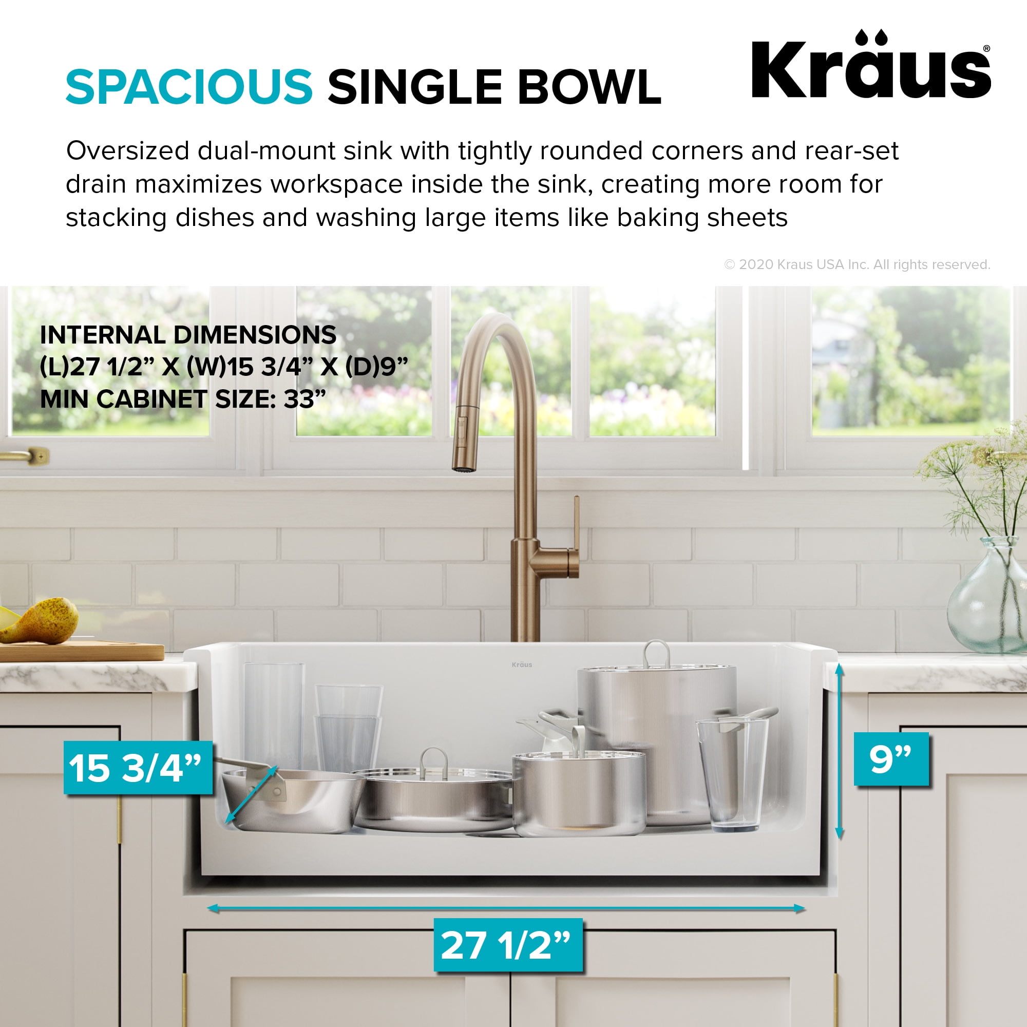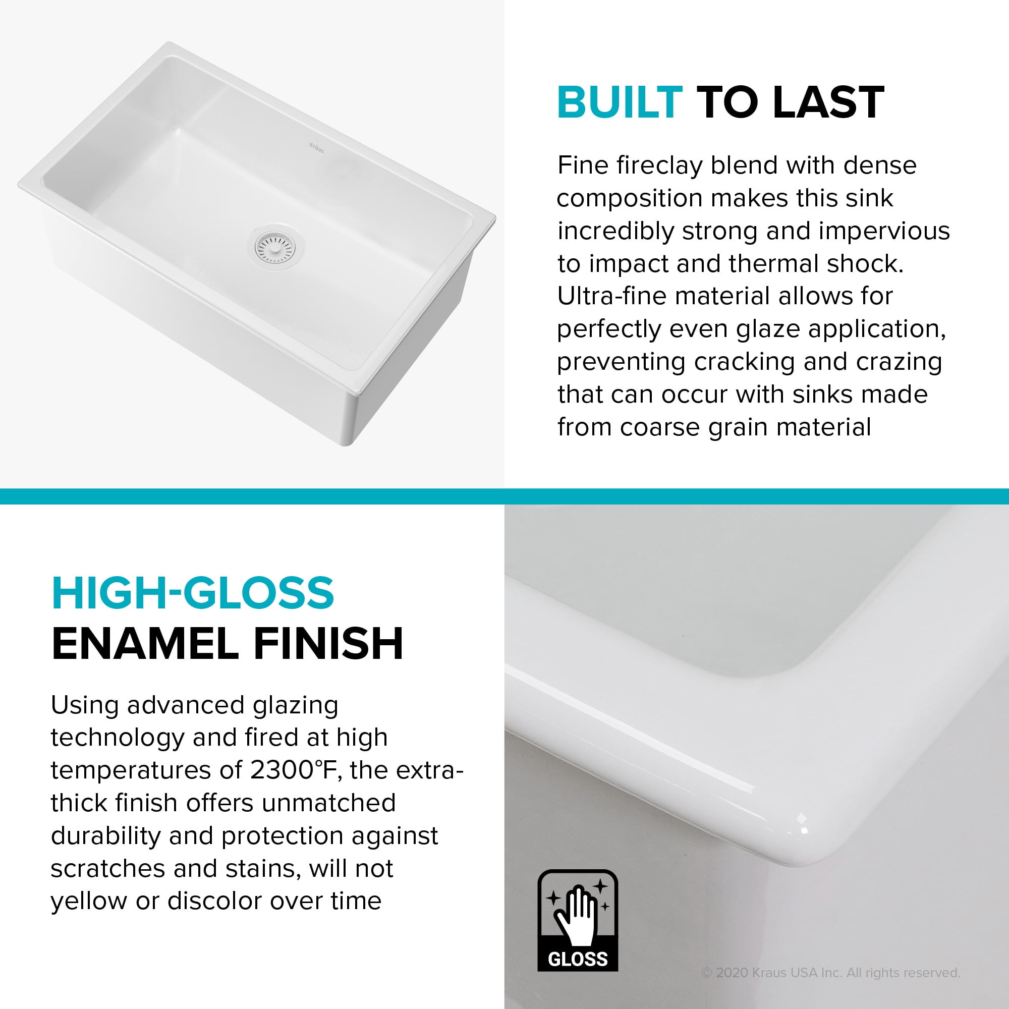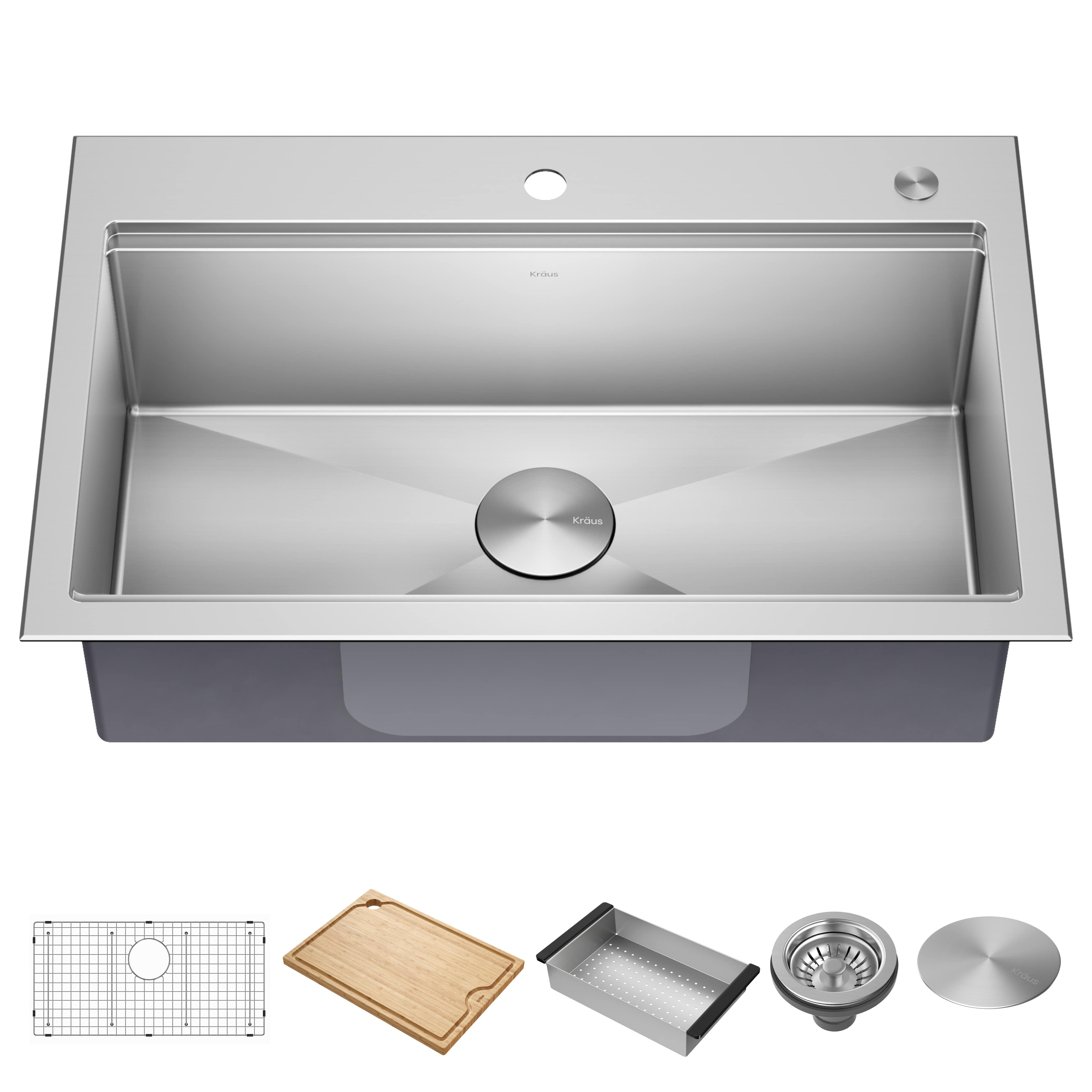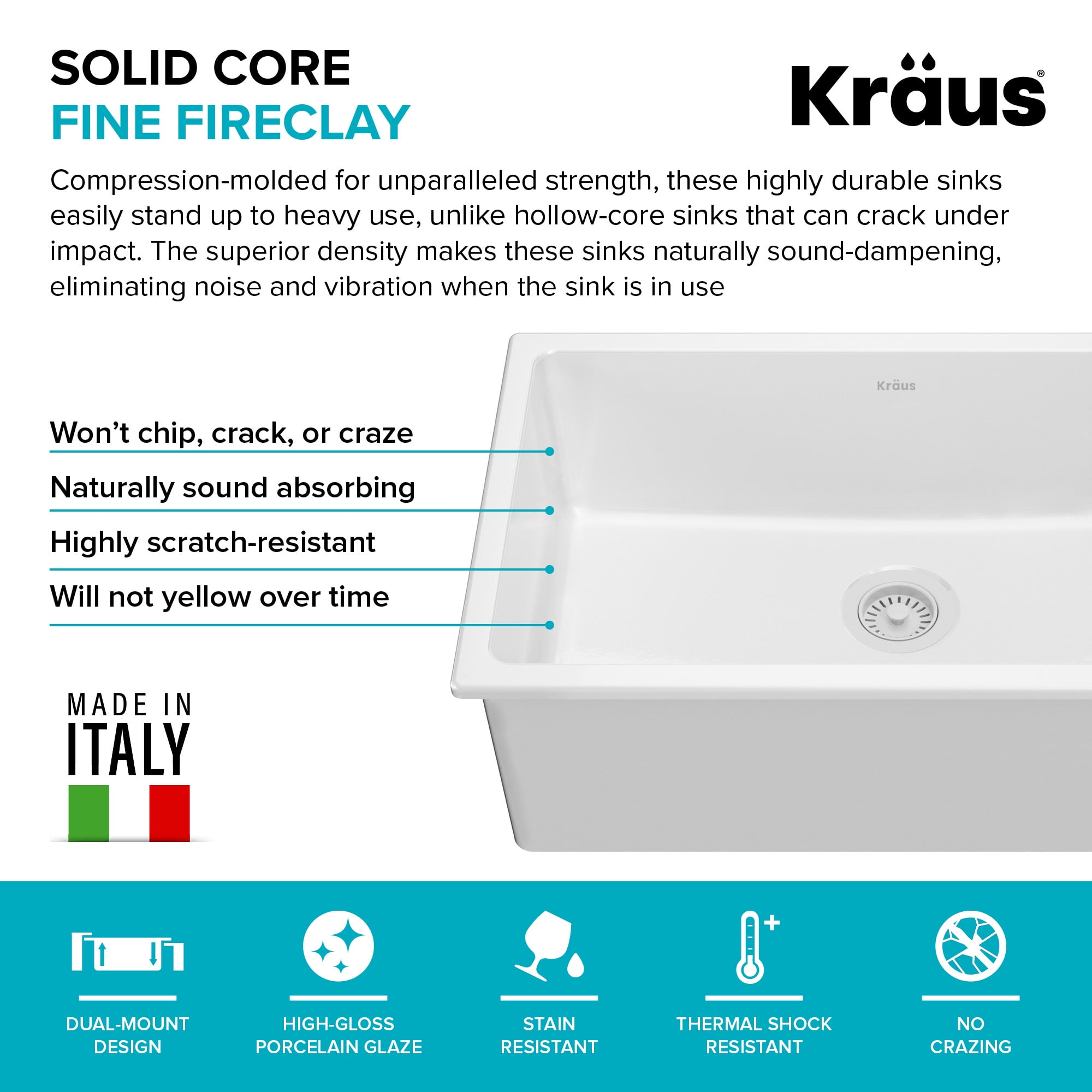 DUAL MOUNT DESIGN: This versatile sink can be installed either as undermount or topmount with any kind of kitchen countertop for design flexibility in any kitchen THICK MOUNTING DECK: Ideal for retrofitting, thick deck supports the weight of the sink and holds up to 300 lbs. for easy drop-in installation into an existing countertop cutout, creating a beautifully finished look OUTER SINK DIMENSIONS: 29 7/8” L x 18 1/8” W x 10” D – BOWL DIMENSIONS: 27 1/2” L x 15 3/4” W x 9” D – Minimum Cabinet Size: 33” TIMELESS STYLE: Clean, contemporary look fits perfectly into any environment from rustic or traditional to urban kitchens 100% ITALIAN CRAFTSMANSHIP: A stunning union of time-tested quality and high-end style, Turino™ Series sinks are handcrafted with locally quarried materials at the source of the world’s finest fireclay FINE FIRECLAY: Proprietary fine fireclay blend boasts a dense composition that makes this sink highly resistant to impact and thermal shock – Ultra-fine material allows for perfectly even glaze application, preventing cracking and crazing that can occur with sinks made from coarse grain material SOLID CORE CONSTRUCTION: Compression-molded for unparalleled strength, these incredibly durable sinks easily stand up to heavy use, unlike hollow-core sinks that can crack under impact HIGH-GLOSS FINISH: Using advanced glazing technology and fired at high temperatures of 2300°F, the extra-thick enamel glaze offers unmatched durability and protection against scratches and stains, will not yellow or discolor over time EASY TO CLEAN: Ultra-smooth finish and rounded tight-radius corners easily wipe clean with soap and water, helping eliminate build-up over time – Sink surface is highly resistant to common household chemicals SPACIOUS SINGLE BOWL: High-capacity sink with rear-set drain offers generous workspace for large cookware and stacks of dishes PERFECT DRAINAGE: Gently sloped sink bottom prevent water from pooling in the sink – Optimized slope prevents fragile glassware from tipping HEAT RESISTANT up to 300°F: Thermal shock resistant, will not crack from hot plates and cookware NATURALLY SOUND-DAMPENING: The superior density of fine fireclay eliminates noise and vibration when the sink is in use – So quiet, no exterior soundproofing is needed 5 YEAR LIMITED WARRANTY with top-rated customer service that puts you first RECOMMENDED ACCESSORIES (sold separately): Protect your drainpipe from debris with the ST-4 drain assembly with FlipCap or the PST-1White drain assembly for a matching look. Rinse & dry dishes and produce over the sink with the roll-up dish drying rack (KRM-10). Protect your sink from the impact of dropped dishes, sharp utensils, and heavy cookware with a premium stainless steel bottom grid (KBG-FC2614) SECURE PACKAGING protects your product from damage in transit so that it arrives in perfect condition, ensuring that your renovation project gets off to a smooth start PLEASE NOTE: Countertop cutout template is not included. Due to the handcrafted and organic nature of the material, fireclay sinks may vary in size by up to 1/8 inch. We recommend using the actual sink to measure and trace countertop and cabinet cutouts PROFESSIONAL INSTALLATION RECOMMENDED: This fireclay sink requires custom cabinetry or modification of the base cabinet to ensure proper fit and support. The support frame must be able to hold up to 300 lbs (weight of the sink when full) CERTIFICATIONS: All Kraus products are marked cUPC, for assurance that the product meets all North American standards