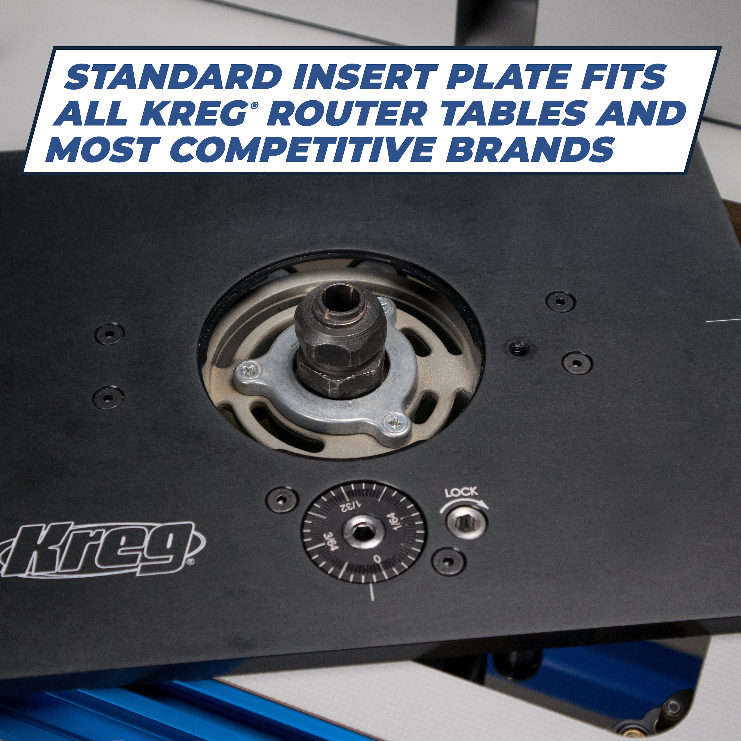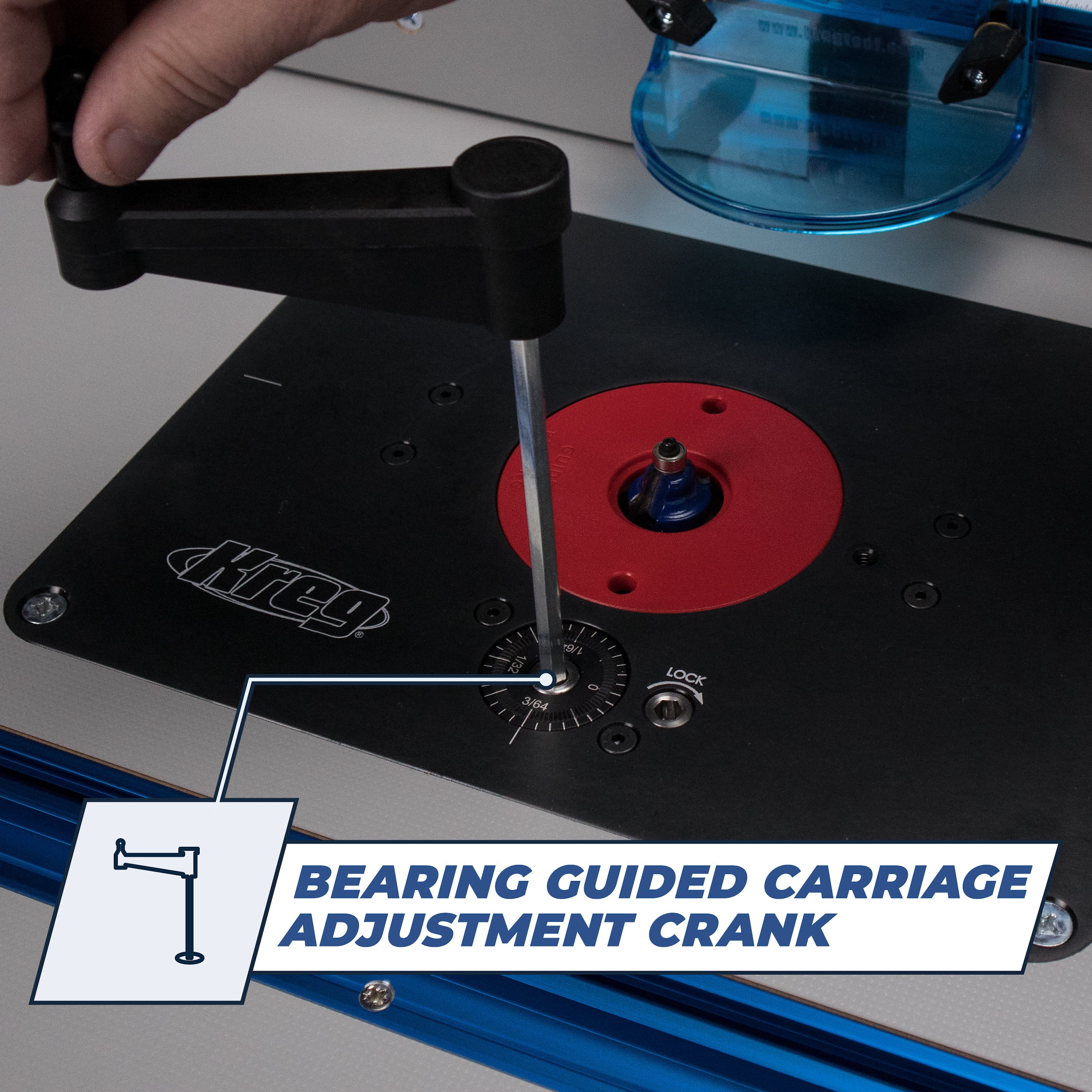 Take control of your table-mounted router for quick, accurate, reliable, and repeatable setups. The Precision Router Lift helps you elevate your routing capabilities by providing precise control when making router setup changes or changing bits. The lift replaces the standard insert plate in a router table (the 3⁄8″ x 91⁄4″ x 113⁄4″ plate fits all Kreg® router tables plus many popular brands) and accepts any of 20+ popular router models—without the need adapters or modifications—in a high-performance carriage that you raise and lower from above the table. Allows precise above-the-table setup changes for table-mounted routers Above-table collet access allows fast, easy, above-table bit changes 3⁄8″ x 9 1⁄4″ x 11 3⁄4″ (9.5 mm x 235mm x 298mm) hard-anodized aluminum plate won’t sag, resists scratches Fits all Kreg® router tables and many competitive brands Bearing-guided carriage provides smooth operation Precision indexing ring with micro-adjust scale simplifies bit height changes Precise adjustment without backlash ensures accuracy Accepts 20+ popular routers without requiring pads or adapters Take control of your table-mounted router for quick, accurate, reliable, and repeatable setups. The Precision Router Lift helps you elevate your routing capabilities by providing precise control when making router setup changes or changing bits. The lift replaces the standard insert plate in a router table (the 3?8″ x 91?4″ x 113?4″ plate fits all Kreg® router tables plus many popular brands) and accepts any of 20+ popular router models without the need adapters or modifications in a high-performance carriage that you raise and lower from above the table. Allows precise above-the-table setup changes for table-mounted routers Above-table collet access allows fast, easy, above-table bit changes 3?8″ x 9 1?4″ x 11 3?4″ (9.5 mm x 235mm x 298mm) hard-anodized aluminum plate won?t sag, resists scratches Fits all Kreg® router tables and many competitive brands Bearing-guided carriage provides smooth operation Precision indexing ring with micro-adjust scale simplifies bit height changes Precise adjustment without backlash ensures accuracy Accepts 20+ popular routers without requiring pads or adapters