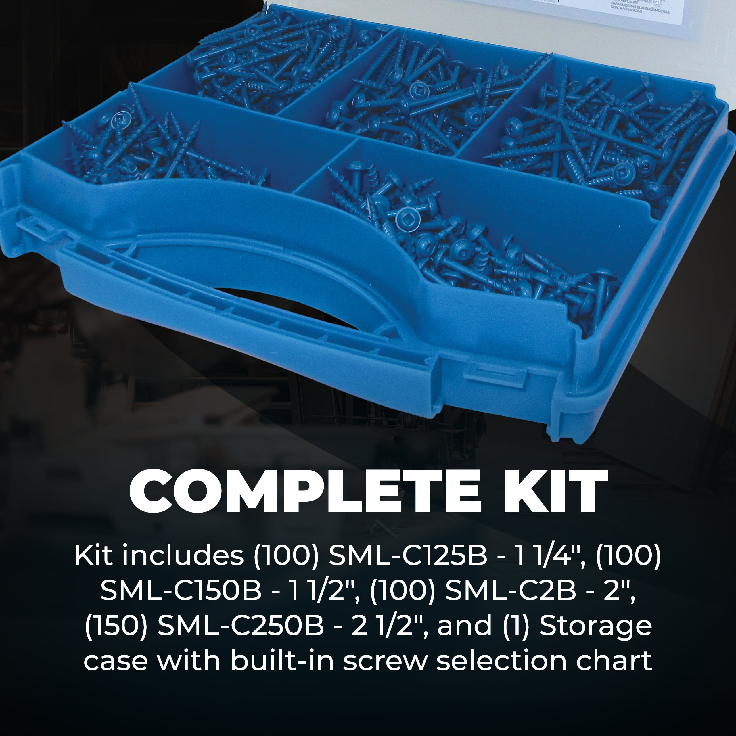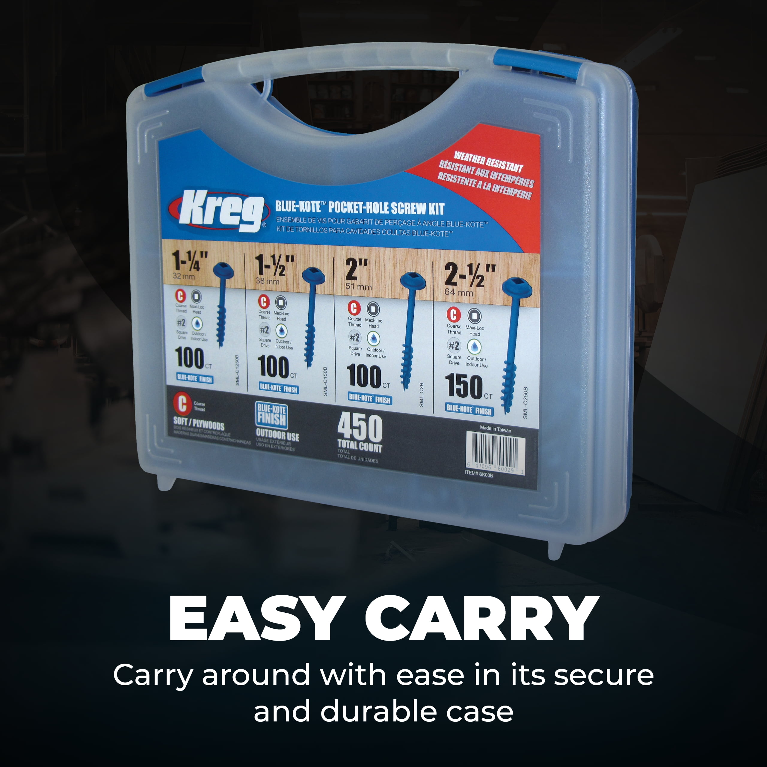 Kreg SK03B Blue Kote Pocket Hole Screw Outdoor Project Kit, Joiner Woodworking Screws, Wood Screws Assortment Kit, Self-Tapping Screws Home Improvement Screw Assortment Kit: These premium Kreg screws are compatible with all Kreg pocket-hole jigs. Joiner Woodworking Screws: This screw assortment contains 450 weather-resistant, Maxi-Loc head pocket-hole screws. Wood Screws Assortment Kit: Contains case-hardened steel screws with Maxi-Loc heads for outdoor and indoor use. Self-Tapping Screws: Woodworking kit contains screws with coarse threads. Great starter kit for outdoor projects. Premium Kreg Tools: We offer products that help woodworkers close the gap between idea and outcome.