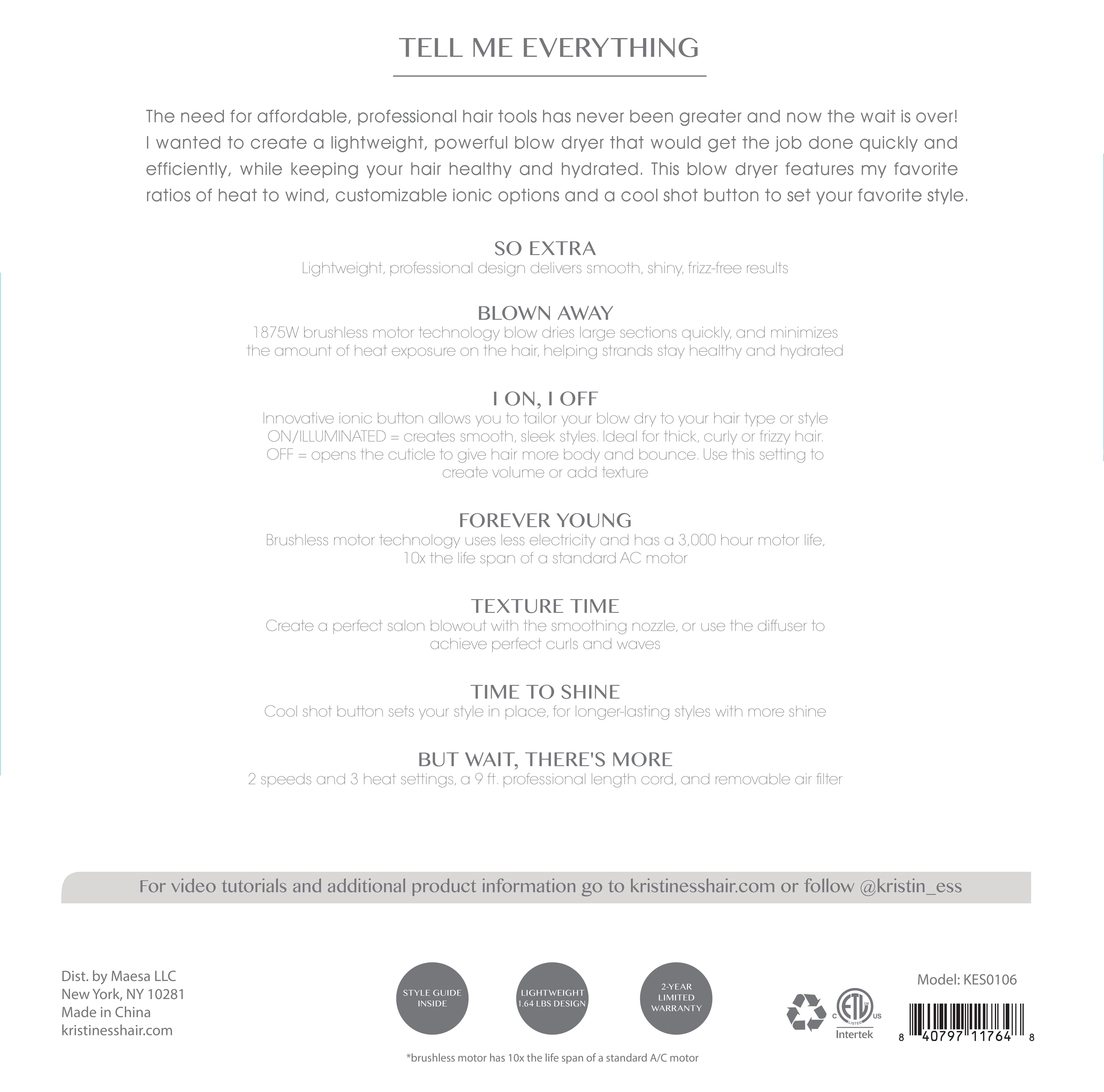 The need for affordable, professional hair tools has never been greater, and now the wait is over! The Ionic Style Professional Blow Dryer from Kristin Ess Hair is a lightweight, powerful blow dryer that gets the job done quickly and efficiently while keeping your hair healthy and hydrated. This blow dryer features Kristin’s favorite ratios of heat to wind, customizable ionic options, and a cool shot button to set your favorite style.