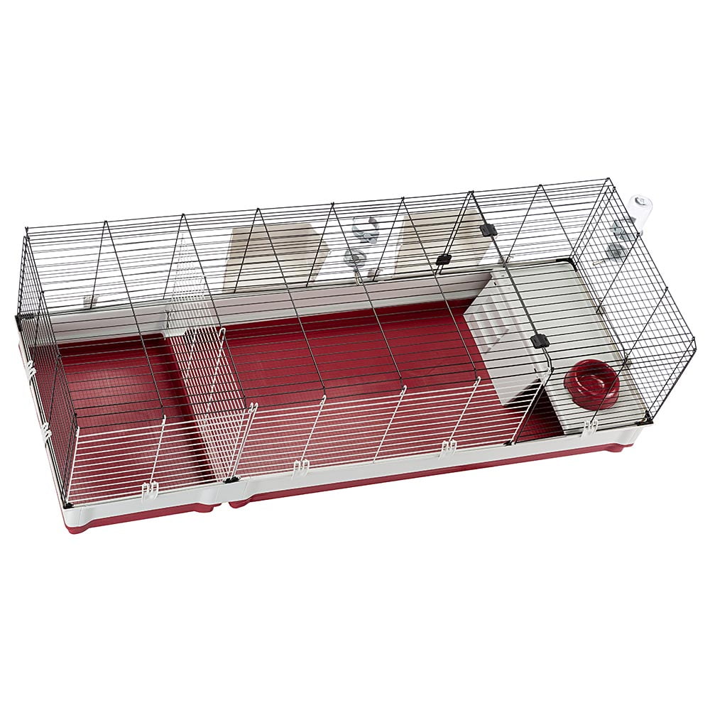 The extra-extra-large Krolik rabbit cage in burgundy with the included wire extension by Ferplast measures 63.8L x 23.6W x 19.68H inches. This XXL pet cage is an ideal choice to house two rabbits or upto 3 guinea pigs in the same habitat! Each XXL rabbit cage comes with the wire extension plus all of the accessories you need to make a perfect habitat for your rabbit including 2 hay feeders, 2 large water bottles, feeding bowl & an elevated feeding area so your rabbit has a clean area to eat/drink from. This rabbit cage is easy to assembly with no tools required, includes an easy-to-clean 5.5″ deep plastic base that contains litter inside the rabbit’s home & has a powder coated wire top to ensure this cage will last! This rabbit cage provides your pet with an extra-large living area for maximum comfort & a full front doors / side doors for easy cleaning or access to your rabbit. The wire extension portion of the rabbit cage comes with a divider panel to separate it from the rest of the cage and is an ideal place for nesting. The extension portion of the rabbit cage measures24L x 18W x 19.25H – inches.