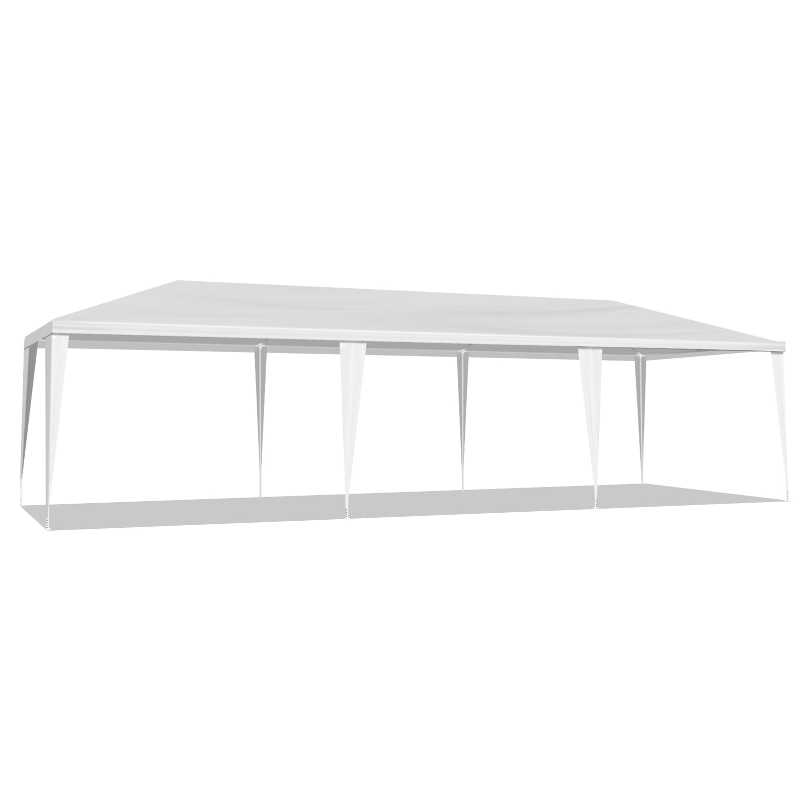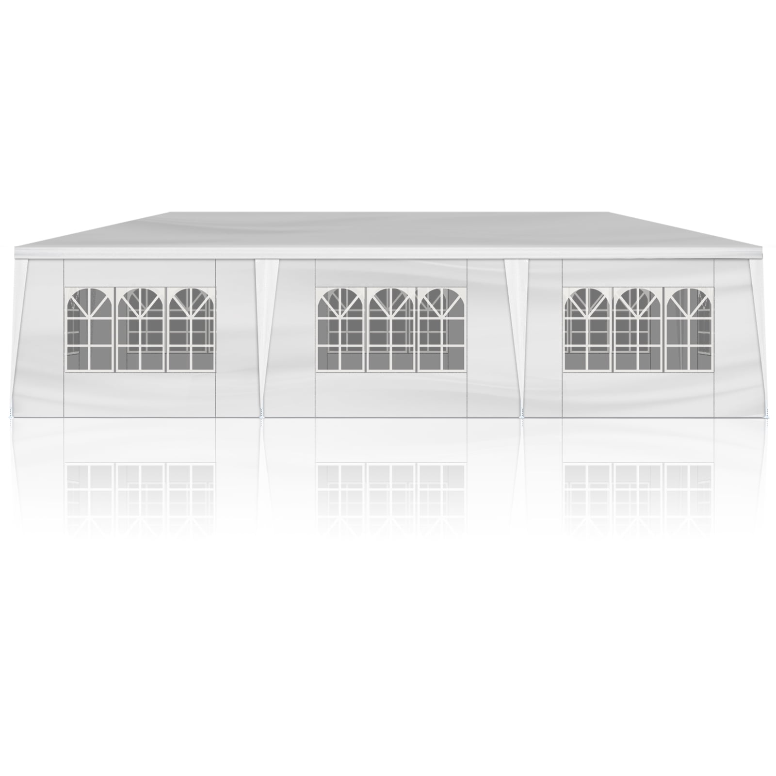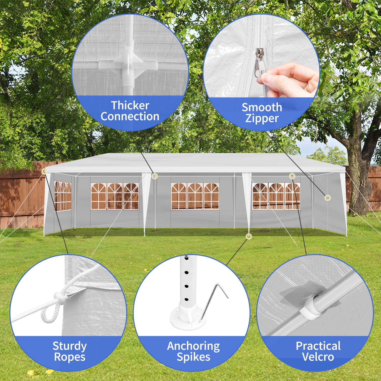 Attention: Polyethylene Fabric of party tent is not fire proof, please be away from sources of fire. We advise customers to never leave patio tent up overnight or under bad weather conditions. We will not be responsible for such weather damages.The canopy tent does not equipped with carrying bag. EASY TO ASSEMBLE: The party tent is easy to assemble. You’d better to have an assistant to help, no additional tools of the canopy tent are required, just keep the frame steady when assemble the wedding tent steel tube and cover. MULTIPLE USAGE: The party tent is perfect for wedding, party, meeting, camping and so on. And you can used the wedding tent for backyard barbecue with your friends, or the canopy tent is the choice for your birthday party as well. BIG SIZE: The party tent size is 10 x 30 x 8.5ft (LxWxH) made with sides walls with window provide the canopy tent more shade. The wedding tent can hold up to an estimated 50 people for dining or party. Stability: The plastic tubes and The stainless steel frame enhance the stability of the tent frame. The canopy tent comes with ropes and stakes for added stability.