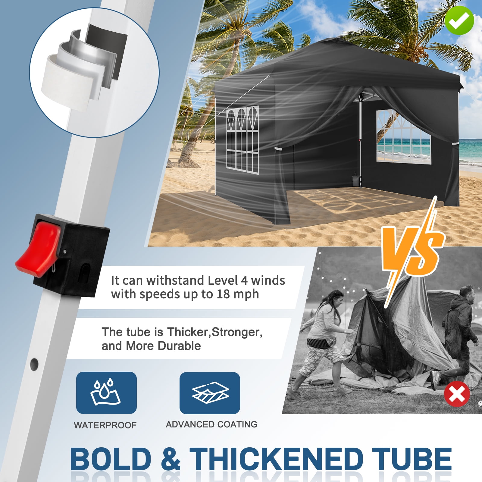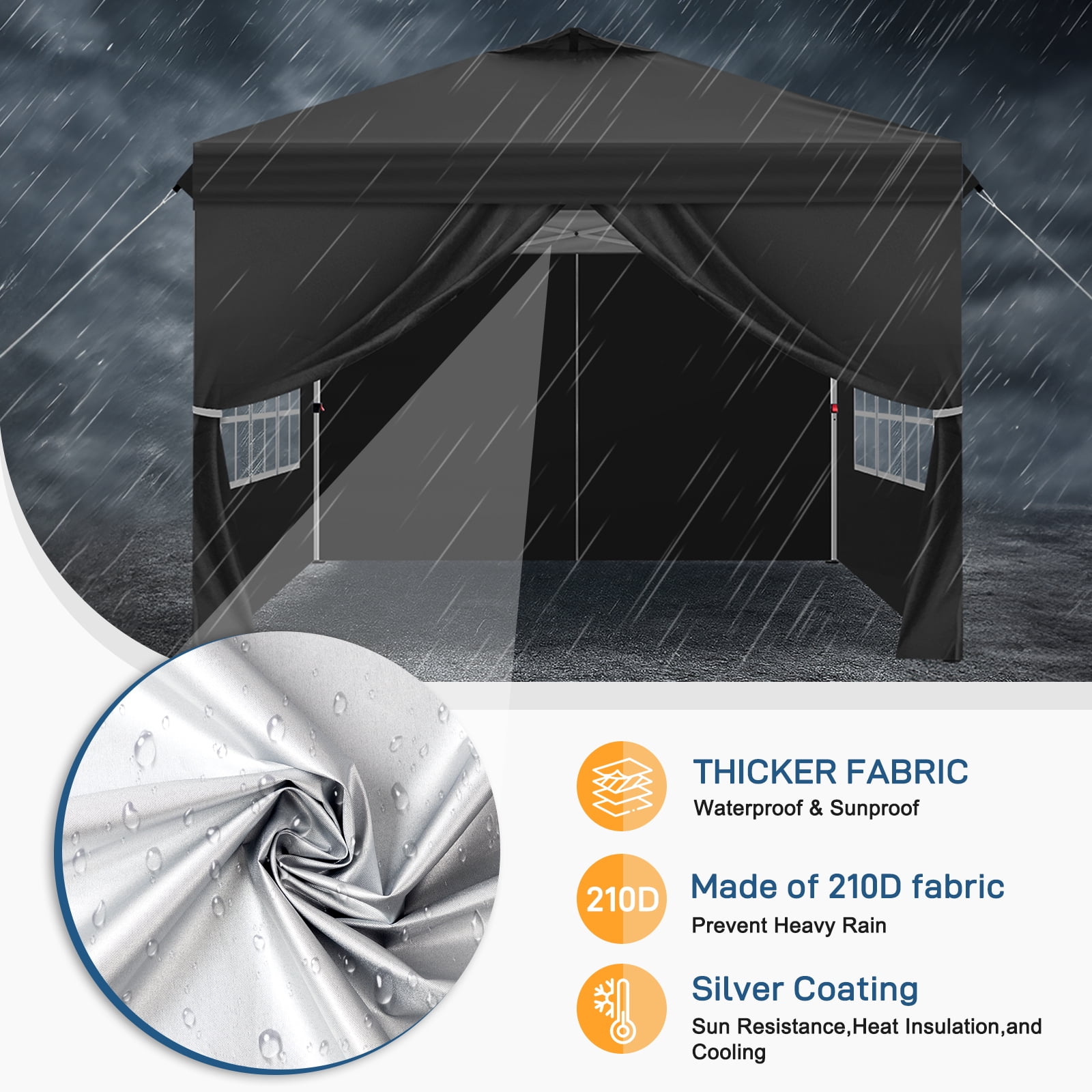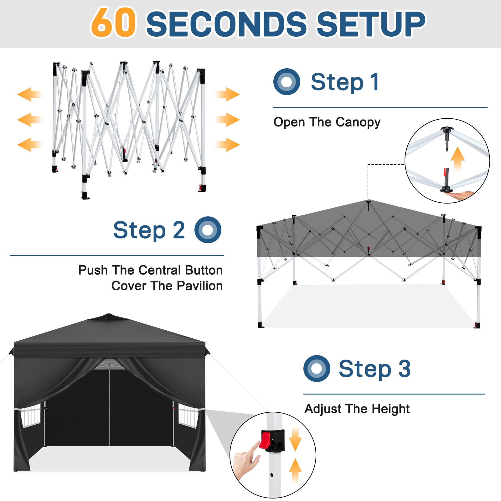 One-Time Investment, Years of Durability: The Next-Generation Ktaxon Upgraded Canopy Tent offers worry-free comfort and addresses concerns about rapid wear and tear. Built to last, it’s a reliable choice for long-term use. One-Click Setup: With its innovative upgrade, this tent features a central hub that assembles the frame with a single press. Even one woman can set it up effortlessly. Enjoy instant shade and protection in just one minute, solving the hassle of complicated assembly from previous models. Three Adjustable Height Settings: The upgraded tent comes with convenient push-button clips, allowing you to adjust the height to your preference at any time. The easy-to-use buttons include an anti-pinch design, overcoming the struggles of hard-to-adjust heights in the past. Premium Fabric Material: The new-generation fabric delivers cooler shade and safer rain protection. Made from durable 210D weave, it enhances the tent’s protective strength and reduces the risk of tearing. With UPF50+ and an inner silver coating, it boosts sunlight reflection for superior cooling. The included 210D sidewalls add extra sun protection on the sides. Upgraded Frame: The enhanced support legs are sturdier and more stable, pre-assembled for tool-free setup. The truss frame is designed to handle heavy loads with ease. Customizable Coverage: Attach all four sidewalls for full wind protection, privacy, or UV defense—or leave them open for an airy, social vibe. Smart Window Design: Stay shaded yet connected! The mesh windows allow airflow and natural light while keeping bugs and prying eyes out. Spacious Design: With a generous 100 sq ft footprint, this tent comfortably fits up to 10 people. When packed, it measures just 45” x 8” x 8”, making it easy to store in your trunk. Complete Accessories: The package includes ground stakes, guy ropes, sandbags, and a wheeled storage bag. The storage bag keeps all accessories together, making folding, storing, and transporting a breeze. Perfect for Any Occasion: The Next-Generation Ktaxon Upgraded Canopy Tent is the ideal choice for camping, family picnics, carnivals, outdoor barbecues, beach trips, tailgate parties, music festivals, farmers’ markets, craft fairs, and more.
