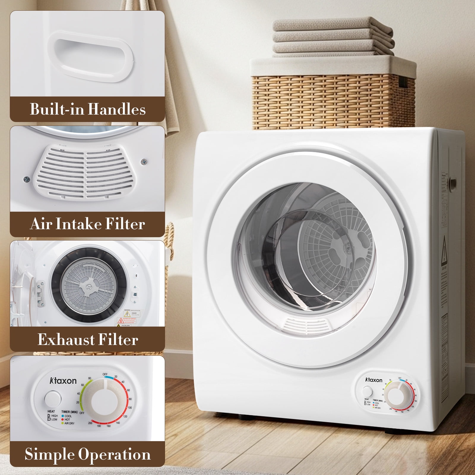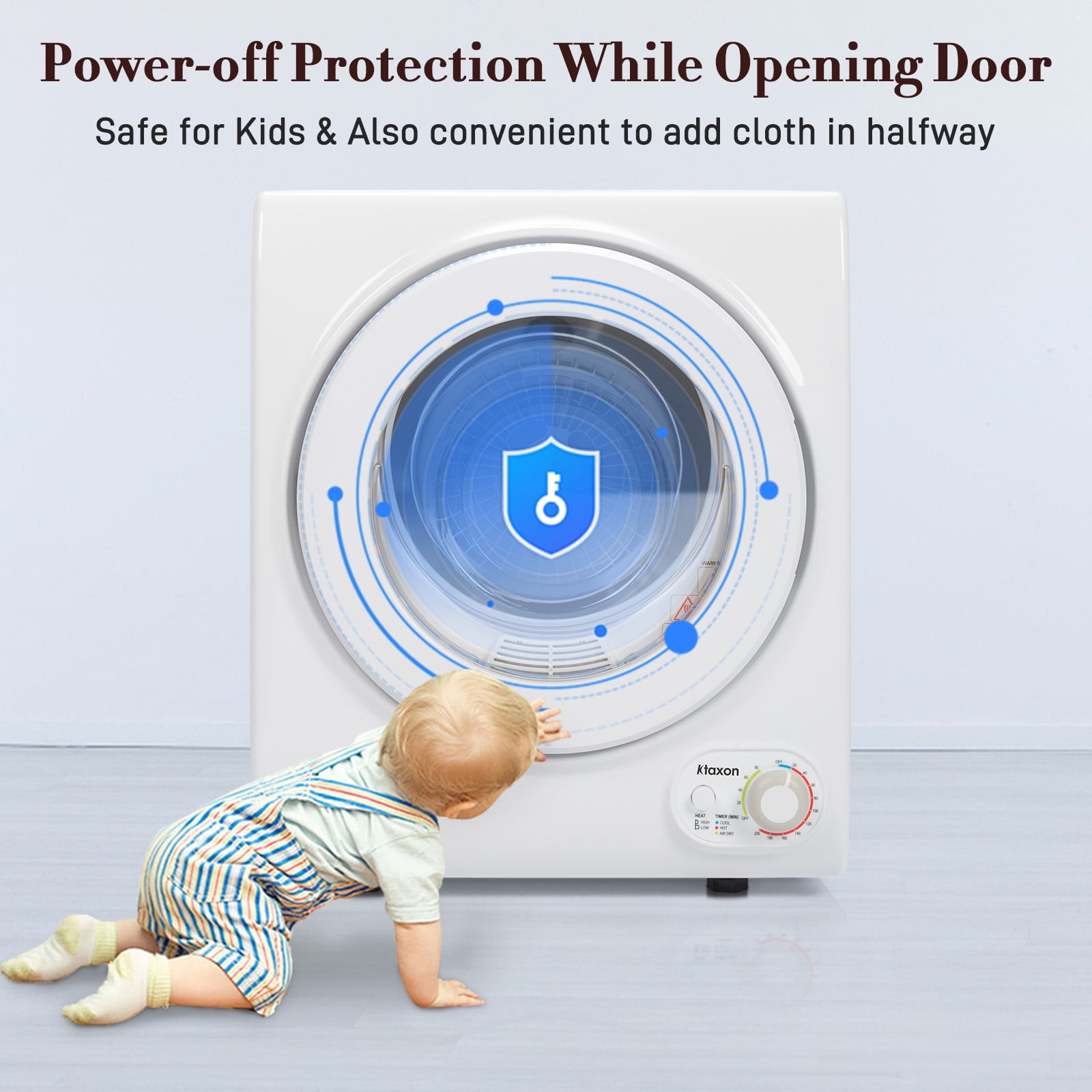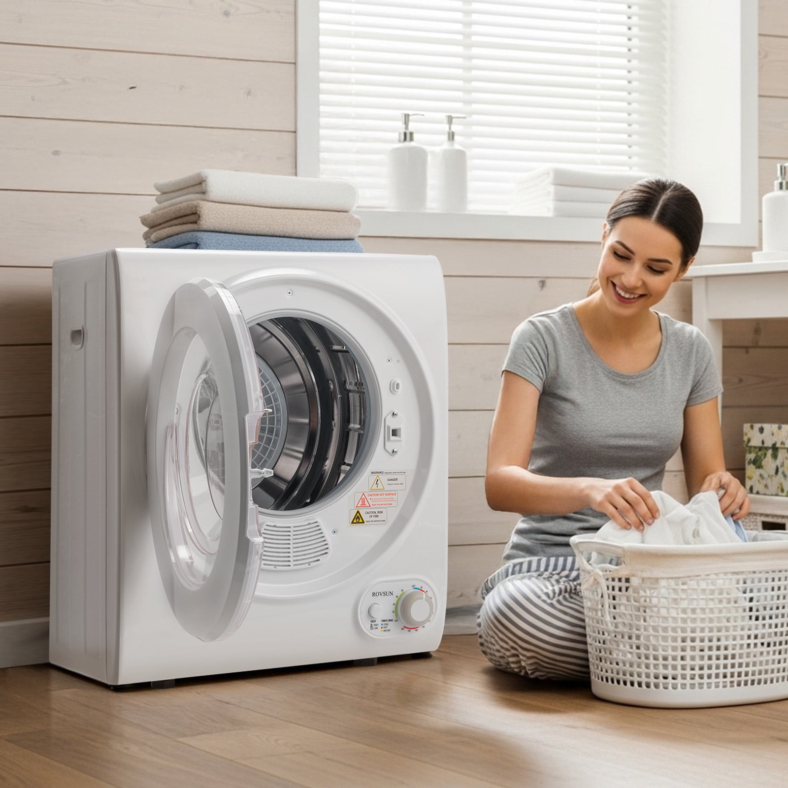 【Fast Drying】This powerful electric dryer is featured with 1400W power and up to 14.5LBS of wet clothes, which can reach a maximum temperature of 149°F to ensure your clothes to be dried quickly. Even though it lasts rainy, you can still put on your beautiful dresses every day. Same day wash, same day wear. (NOTE: for quick drying, no more than 9 pounds of clothes at a time) 【High Quality & Safety】The design of stainless steel tub makes this clothes dryer more durable, and you can use it for a longer time. The multiple filtration system effectively filters out cotton wool to prevent it from flying out. If you open the door while the machine is running, it will automatically stop running to ensure your safety 【Simple Operation】Designed with a simple knob control, and all functions and operations are clearly listed on the control panel, once you set your desired temperature, you could just leave it alone to work and do your own things. Featured with various drying modes for making our life more convenient and healthier 【Stylish Appearance】Classic white color with see through door window, simple but modern style matches with your taste and also adds a touch of elegant charm to your laundry room; It’s compact feature is perfect for small space like apartments, dormitories, RVs and more, it can be even mounted on the wall with included mounting kit