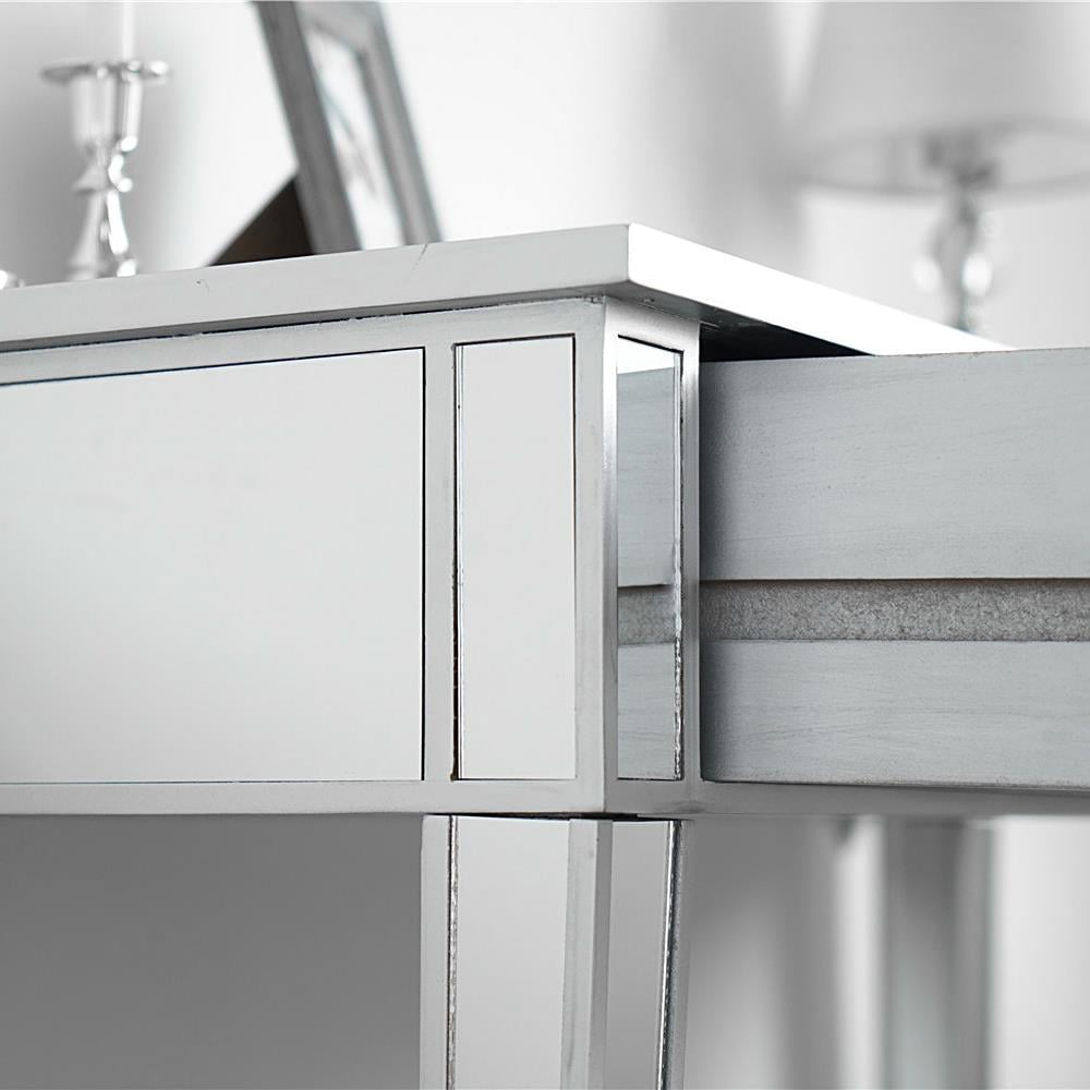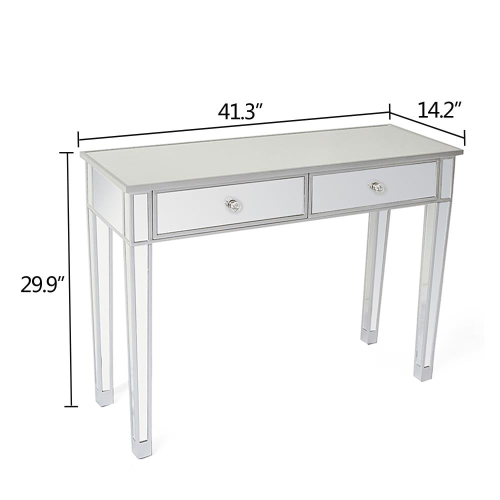 Features: Drawers – This Makeup Table comes with 2 slide-out drawers for storage, pull ring handles on drawers make your room more elegant. The compact 2 drawers all open and close very easily with metal smooth glide double runners.It can be used as a nightstand, console table. Design – This mirrored furniture is modern and clean in design with simple straight edges and beautiful beveled edges. Due to the reflective mirrored finish this furniture helps give rooms the feeling of more space due to the reflection of light Premium Silver Mirror – To give your space a modern look, we designed the Mirror 2-Drawer End Table Nightstand with durable, and mirrored glass that are easy to care for and built to last. This nightstand adds a touch of class and charm to any home. The tall legs provide enough clearance to sweep or vacuum beneath. Fine Craftsmanship – Elegantly mirrored 2-drawer console table doubles as a vanity and features Anti-scratch and rust-free, durable and sturdy large worktop, and faux crystal knobs high living comfort Functional Mirrored Table – This entryway accent table is widely applied in home as a perfect make up desk for its spacious work area. Its compact structure and beautiful texture can surprisingly highlight your home deco, perfect for your office, store, living room, or bedroom. Easy Assembly – Detailed assembly instruction is included in the package and it won’t take up much time if you follow the steps. After-sale Service – Since the satisfaction of customer is always our primary concern,so if you have any problem when using this product,please feel free to contact us via email,we’re always happy to help! Specifications: Material: Density Board & Glass Dimensions: (41.34 x 14.17x 29.92)”/ (105 x 36 x 76)cm(L x W x H) Weight: 34.17lbs / 15.5kg Drawer Quantity: 2pcs Package Includes: 1 x Desk