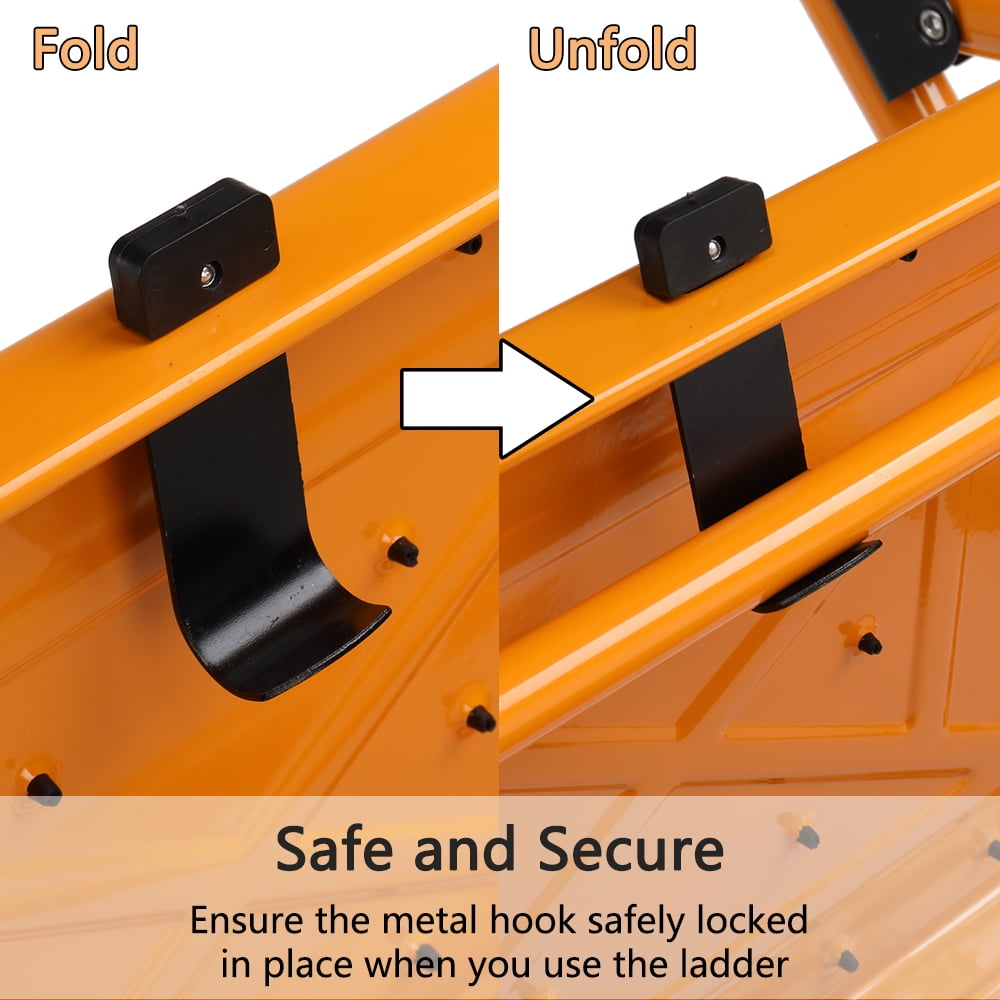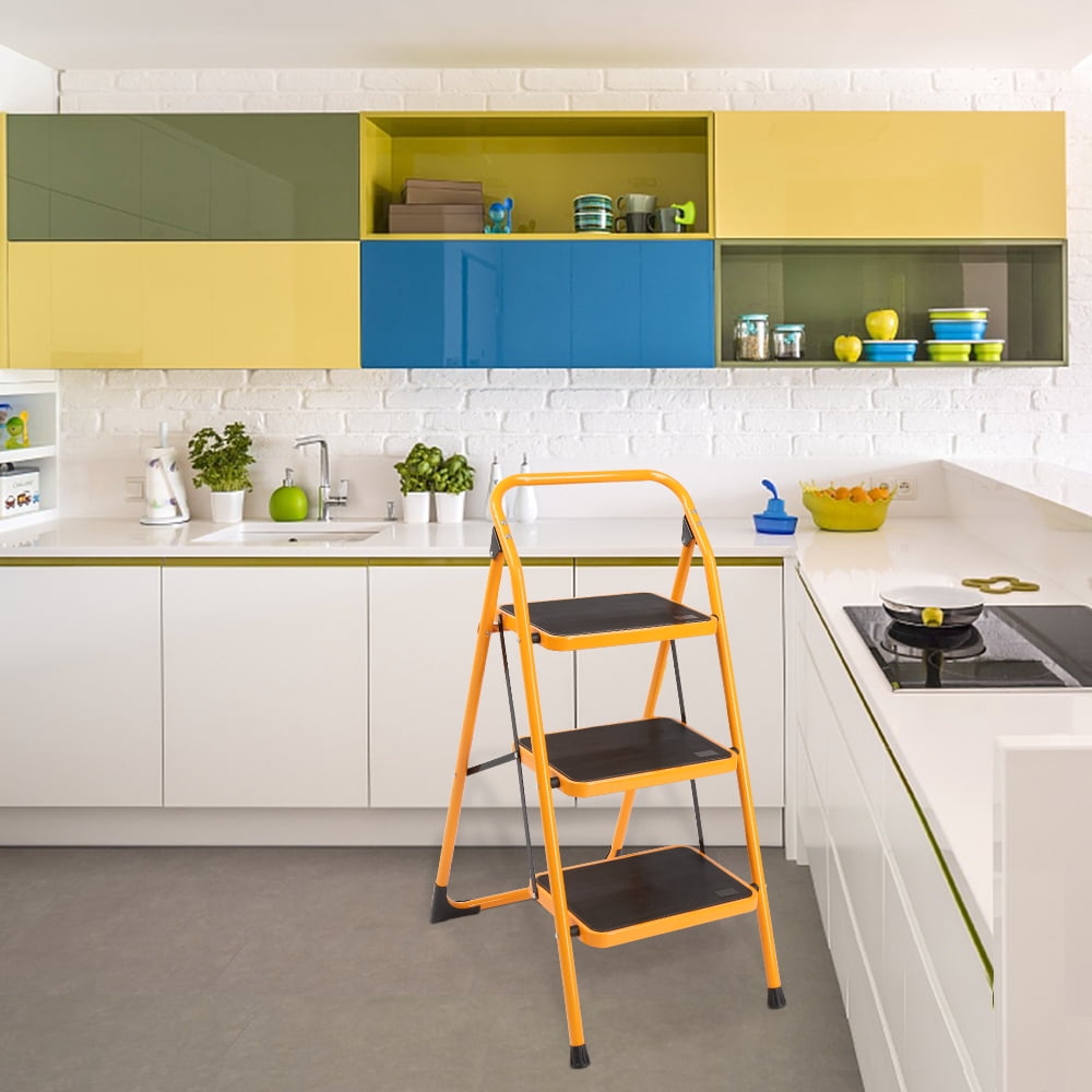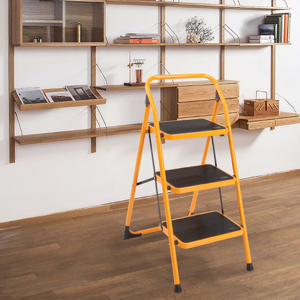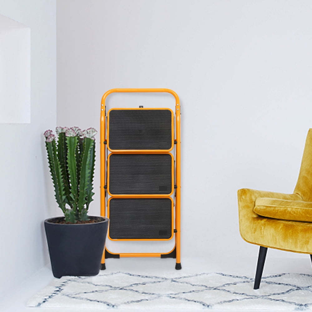 Ktaxon Safety Step Ladder. 3-step design, with a certain height available. Can be folded when not in use, room-saving. Maximum load: 330 pounds. Non-slip rubber stopper bottoms for safe. Lock and open system for easily open and fold.
