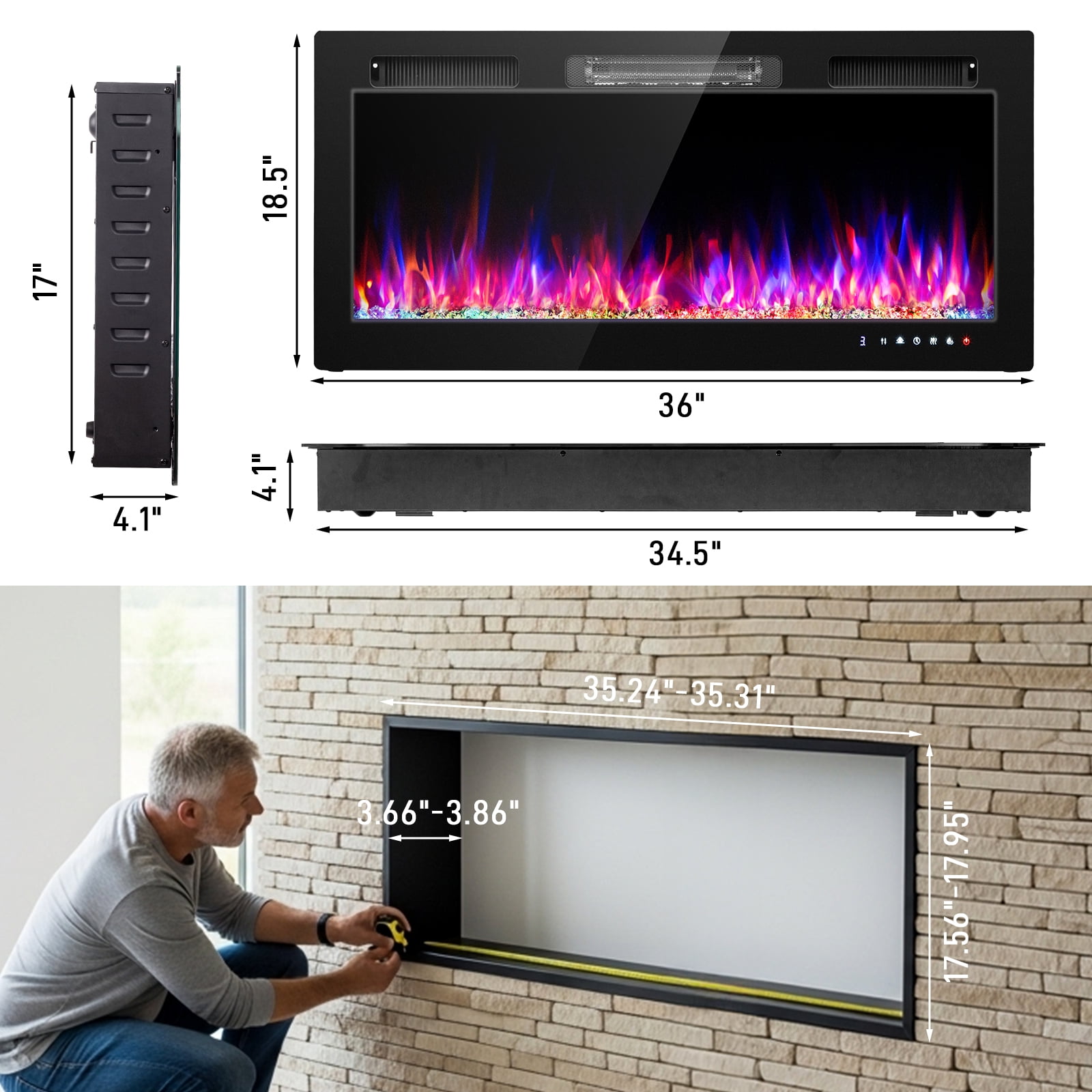 Introductions: Bring warmth, style, and smart technology into your home with the 36″ Smart WiFi Electric Fireplace Insert. This versatile fireplace offers modern convenience with multiple control options, including a WiFi-enabled app, remote control, and intuitive touchscreen panel, allowing you to easily adjust temperature, flame colors, brightness, and more from anywhere. Designed to fit seamlessly into any space, this 1500W heater can be wall-mounted, recessed, or used as a freestanding unit. With 12 color flame options, 5 brightness settings, and safety features like overheat and tip-over protection, this fireplace offers the perfect blend of functionality, ambiance, and elegance, transforming your living space into a cozy retreat year-round. Specifications: 1. Material: Metal, Glass 2. Power: 1500W 3. Heating Element: Heating wire 4. Heating Area: Approx. 400 sq.ft 5. Timer: 1-8 Hours 6. Temperature Adjustment: 62-82℉ / 17-27℃ 7. Digital Display: Yes 8. Stand Included: Yes 9. Flame Colors: 12 Individual Colors, 12-Color Cycling Mode 10. Flame Brightness Mode: L1-L5 11. Flame Only Mode: Yes 12. Heating Only Mode: No 13. Tip-Over Protection: Yes 14. Log Type: Faux Log and Crystal Stones 15. Remote Control: Included 16. Product Dimensions: (36 x 4.1 x 17) in / (91.5 x 10.3 x 43.2) cm 17. Weight: 29.1 lbs / 13.2 kg 18. Certification: cETL 19. Warranty Period: 1 Year Package Includes: 1 x Electric Fireplace 2 x Stands 1 x Remote Control 1 x User Manual
