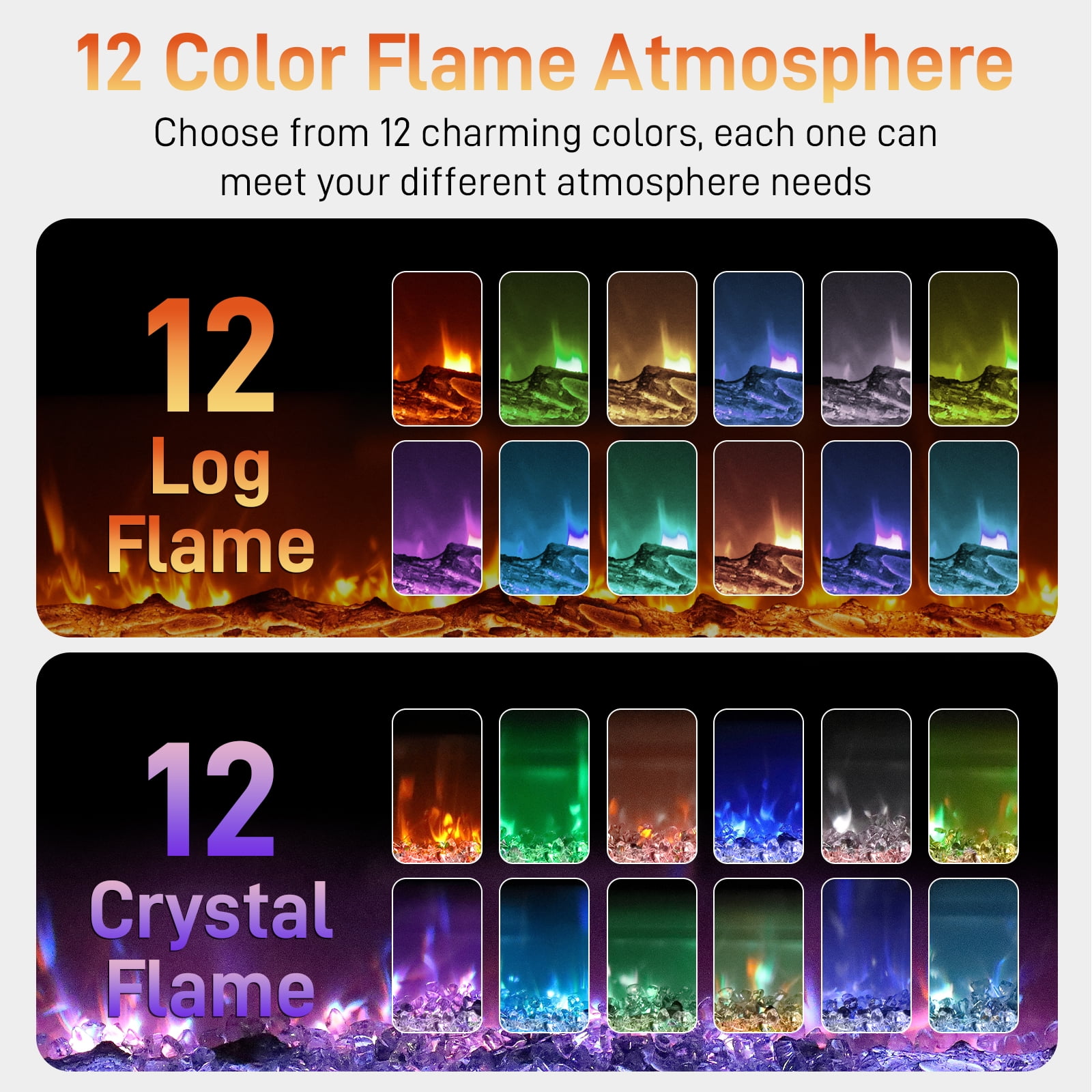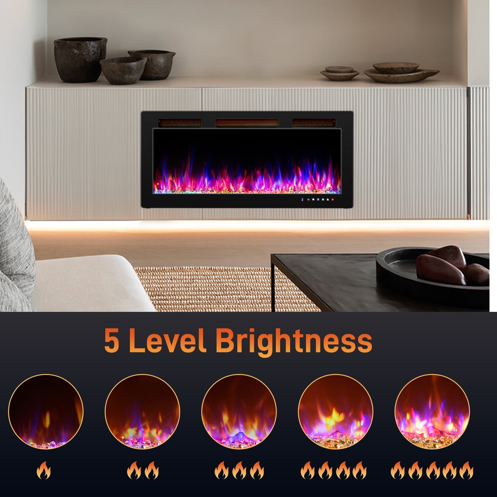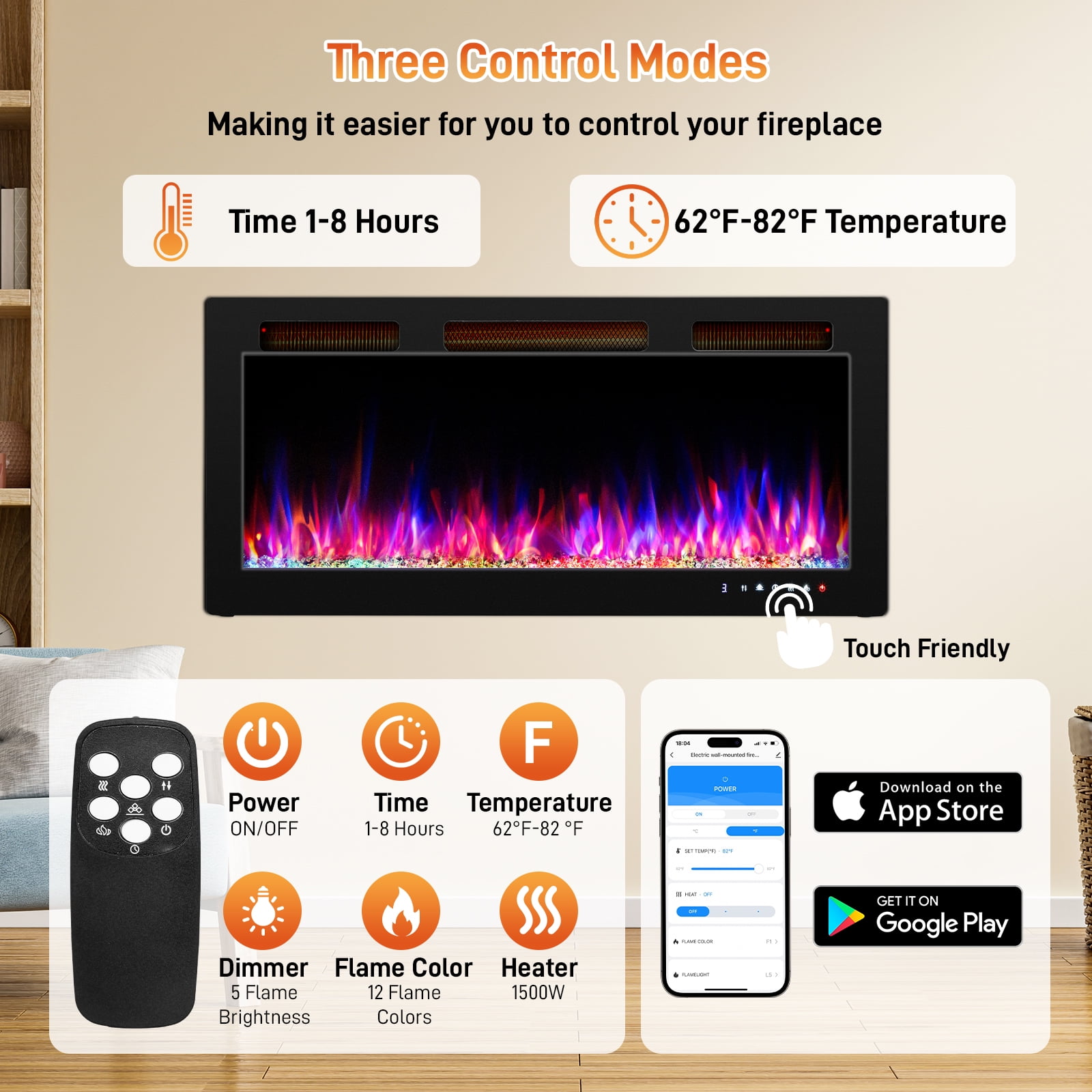 ✅【Smart Control】: Control your fireplace heater through multiple options: the included remote control, an intuitive touchscreen panel, or the advanced WiFi-enabled app. Whether you’re relaxing on the couch or away from home, you can easily adjust the temperature, flame color, brightness and timer settings from anywhere, at any time, ensuring a cozy atmosphere with just a few taps. ✅【Customizable Flames】: Create the perfect ambiance with 12 vibrant flame color options and 5 adjustable brightness levels. Whether you want a subtle, calming glow or a bright, festive display, this fireplace allows you to set the scene to match any mood or occasion. The option to enjoy the flames without heat also makes it a versatile decorative feature for year-round enjoyment. ✅【Powerful and Efficient Heating】: Equipped with a powerful 1500W heating element, this fireplace quickly heat rooms up to 400 sq.ft.. It allows you to easily customize the temperature to your exact comfort level, ranging from 62°F to 82°F, ensuring a perfectly heated environment no matter where you place it. ✅【Overheat & Tip-Over Protection】: Designed with your safety in mind, this electric heater includes advanced overheat and tip-over protection. If the unit overheats or is accidentally knocked over, it will automatically shut off to prevent any potential hazards. This makes it a safe choice for households with children or pets, giving you peace of mind while staying warm. ✅【Three Mounting Options】: The electric fireplace provides three adaptable installation options: wall-mounted, recessed, and freestanding. Whether you want to save space by mounting it on the wall, embed it into a custom-built unit, or simply use it as a standalone piece, this fireplace adapts to your preferences. Complete with easy-to-follow instructions and all the necessary hardware.