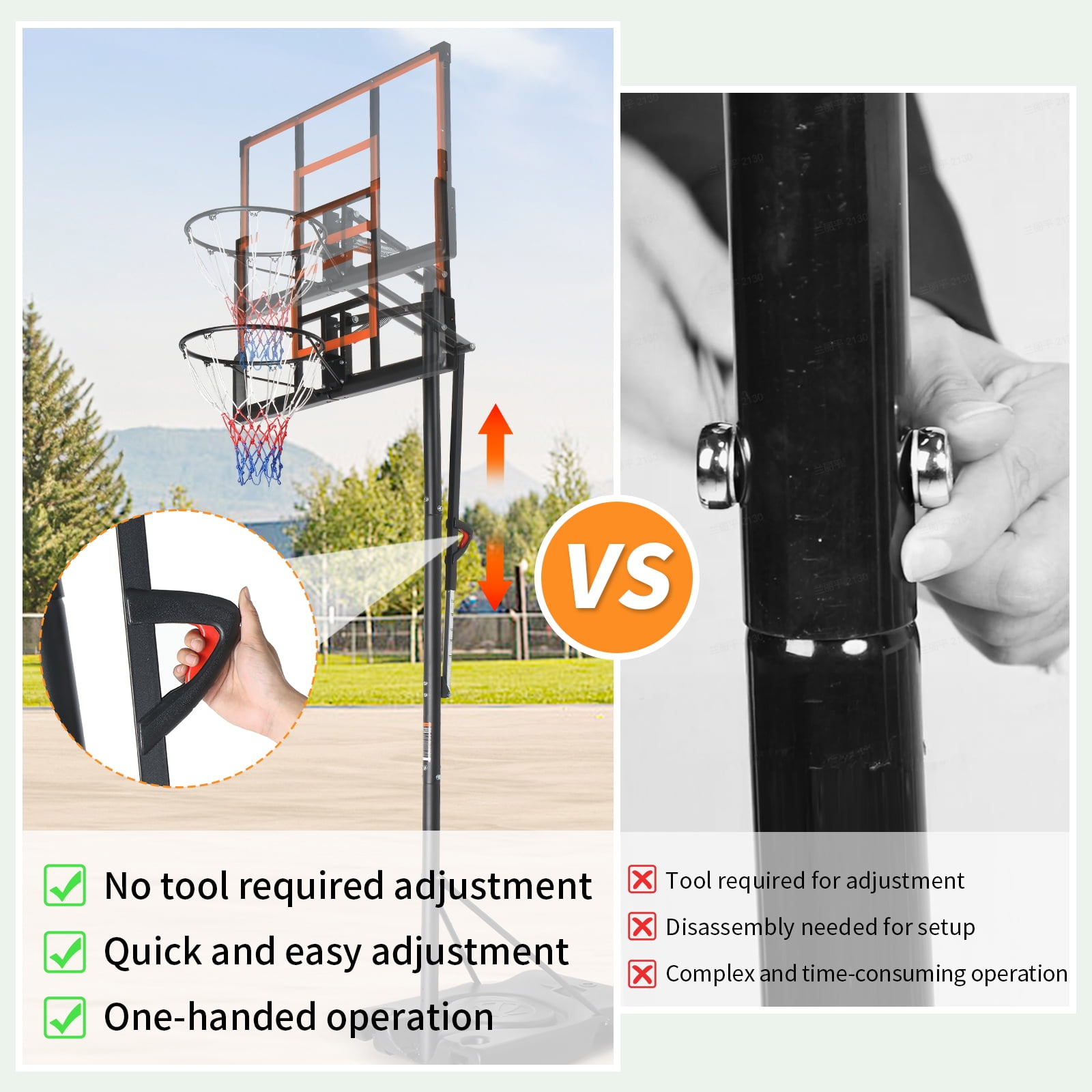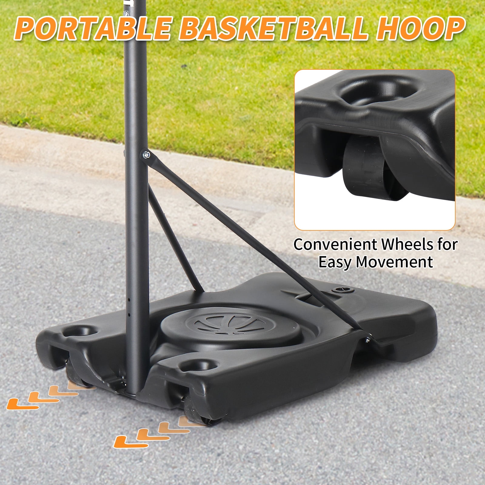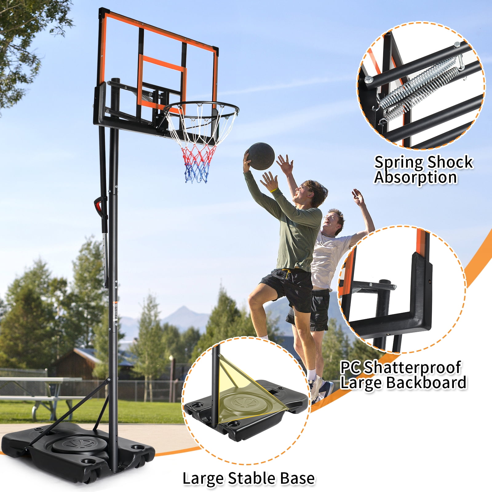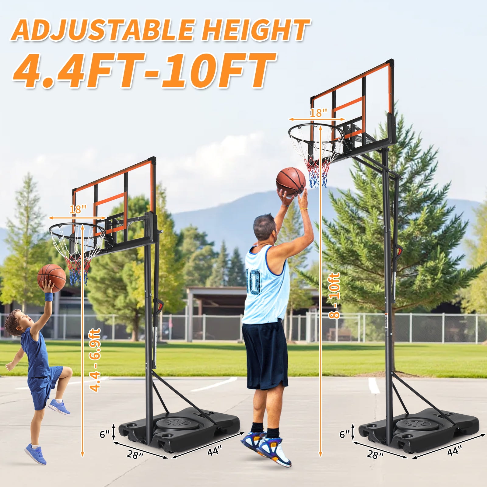 ADJUSTABLE HEIGHT FOR ALL AGES & SKILL LEVELS–Our basketball hoop offers versatile height adjustments to suit players of all levels. Choose from 4.4-6.9ft with two poles or 8-10ft with three poles, making it ideal for adults to enjoy the game in various settings—whether in the driveway, backyard, or sports court. SHATTERPROOF BACKBOARD FOR LONG-LASTING PERFORMANCE–Built with a high-strength shatterproof backboard, this basketball hoop outdoor ensures superior durability and resilience. It withstands aggressive play and harsh weather conditions, providing a professional-level playing experience EXTRA-LARGE & REINFORCED BASE FOR MAXIMUM STABILITY–The 65L large-capacity base can be filled with water and sand up to 150 lbs, ensuring outstanding stability during games. Additionally, the rebound board on the base enhances ball return efficiency, while four reinforced support rods strengthen the connection between the pole and the base for ultimate sturdiness EASY HEIGHT ADJUSTMENT & PORTABILITY–Adjusting the aldult basketball hoop’s height is effortless with the handle, allowing for quick modifications to suit different players. The built-in wheels make it easy to move the hoop to different locations, offering convenience and flexibility for every game. EXCELLENT CUSTOMER SERVICE: –KTAXON provide 24hours customer support. If you encounter any issues such as product damage, missing parts, or delivery problems, please contact us.