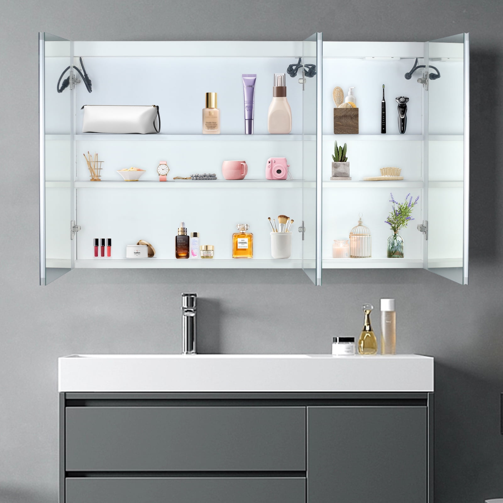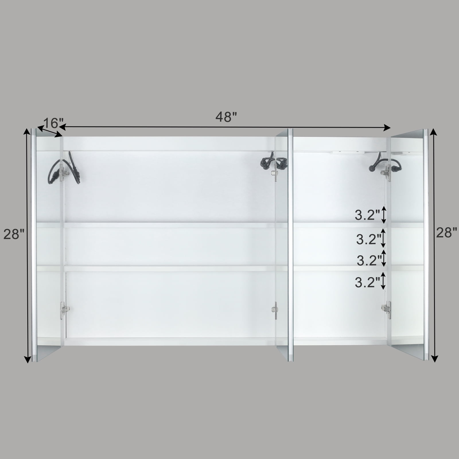 ✅1.【Spacious & Stylish Design】:This 48*28in bathroom wall cabinet is crafted from white OSB, presenting a sleek and modern appearance. The three doors and two shelves design offers generous storage space for all your bathroom essentials. It helps keep your bathroom organized and clutter-free. The white color complements any bathroom color scheme, whether it’s a minimalist or a luxurious style. The compact yet roomy structure makes it a practical addition, fitting snugly into various bathroom layouts. It not only serves as a storage solution but also enhances the overall aesthetic of the bathroom. ✅2.【Intelligent LED Lighting】:The LED lights of this cabinet are a highlight. With three color temperatures ranging from 3000K to 6500K, you can choose between warm, cold, and natural light. There are three distinct lighting modes to suit different moods and needs. The touch control is intuitive and user-friendly. A single click on the blue button toggles between the three colors, and a long press allows for seamless adjustment of the light brightness. ✅3.【Power-off memory function】: Once you set the desired LED light color temperature and brightness, it will be retained. Even after a power outage or the cabinet is turned off, the next time it’s powered on, it automatically resumes the previous settings. This intelligent feature saves you the trouble of readjusting every time, providing a seamless and convenient user experience. It’s a thoughtful addition that truly enhances the functionality and user-friendliness of the cabinet. ✅4.【Convenient Charging】:Equipped with two USB ports and two plugs, this cabinet is a power hub for your bathroom. It enables you to charge your electric toothbrushes, shavers, and even hairdryers simultaneously. No more searching for available sockets or dealing with tangled cords. Whether you’re getting ready in the morning or winding down at night, you can keep your essential devices charged and ready to use. This feature is especially useful in modern bathrooms where multiple electronic devices are commonly used, streamlining your daily routine and enhancing convenience. ✅5.【Defogging Feature】:The defogging function of this cabinet is a game-changer. In a bathroom environment where steam is inevitable, the mirror often fogs up, making it difficult to use. However, this cabinet’s defogging mechanism ensures that the mirror remains clear at all times. You can shave, apply makeup, or simply check your appearance without any hindrance. It provides a clear and crisp reflection, enhancing your bathroom experience and saving you the time and effort of having to wipe the mirror down constantly. This feature is essential for maintaining a clean and functional bathroom. ✅6.【Durable & Easy to Assemble】:It can withstand the test of time and daily use without warping or deteriorating. The assembly process is straightforward. All you need to do is assemble the mirror door and then hang it on the wall. It comes with detailed instructions and is packed in a reinforced cardboard box to ensure safe delivery. If you encounter any issues during assembly or use, our responsive customer service team is always available to provide assistance and find the most satisfactory solution.