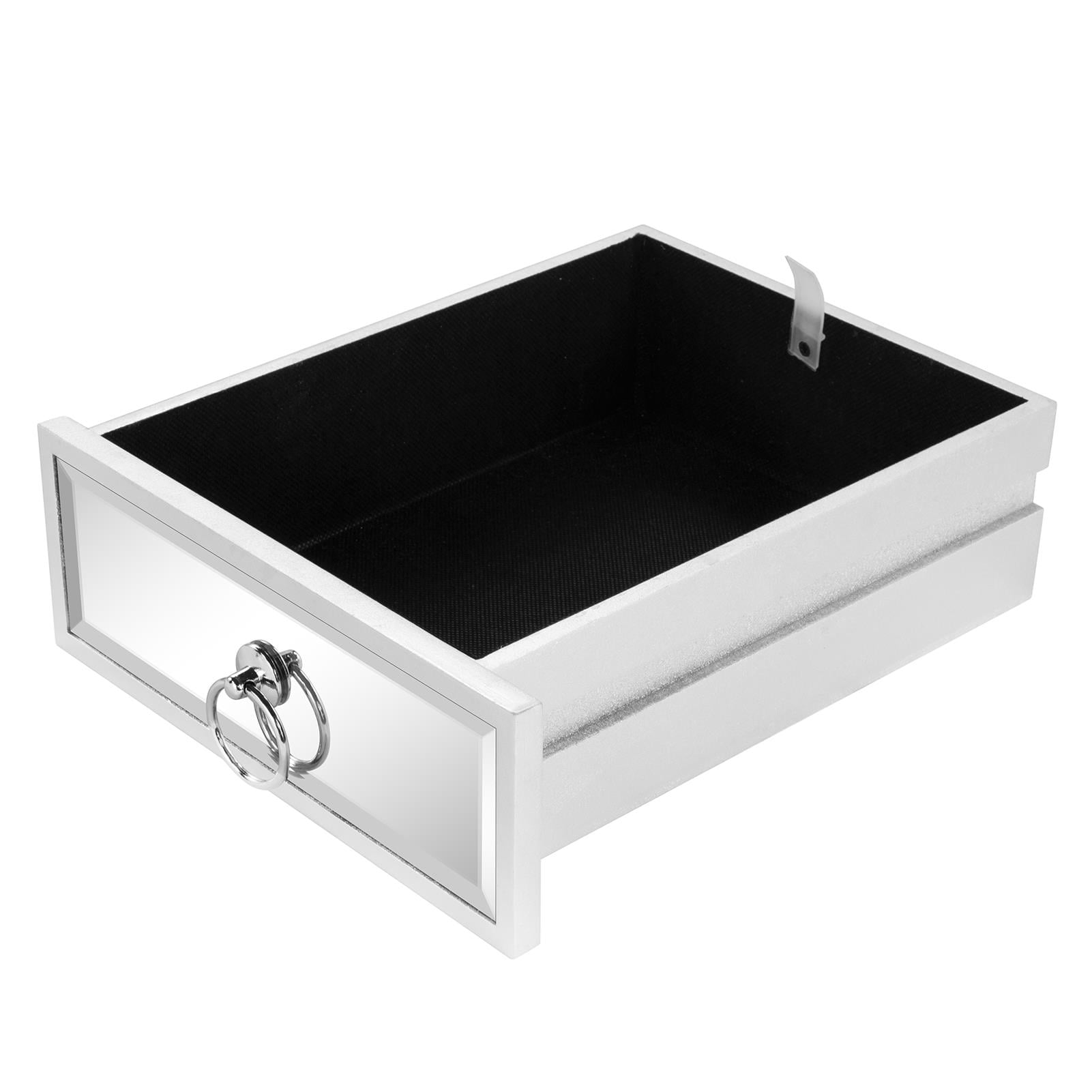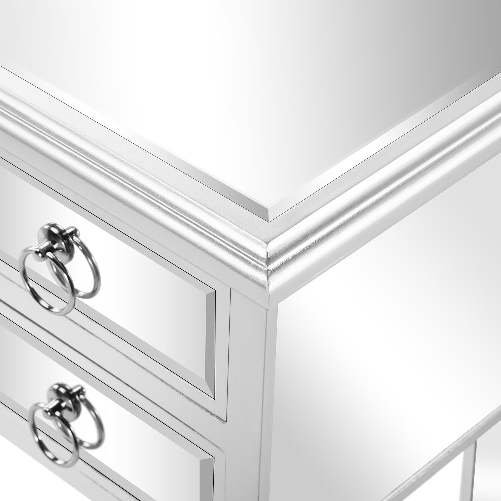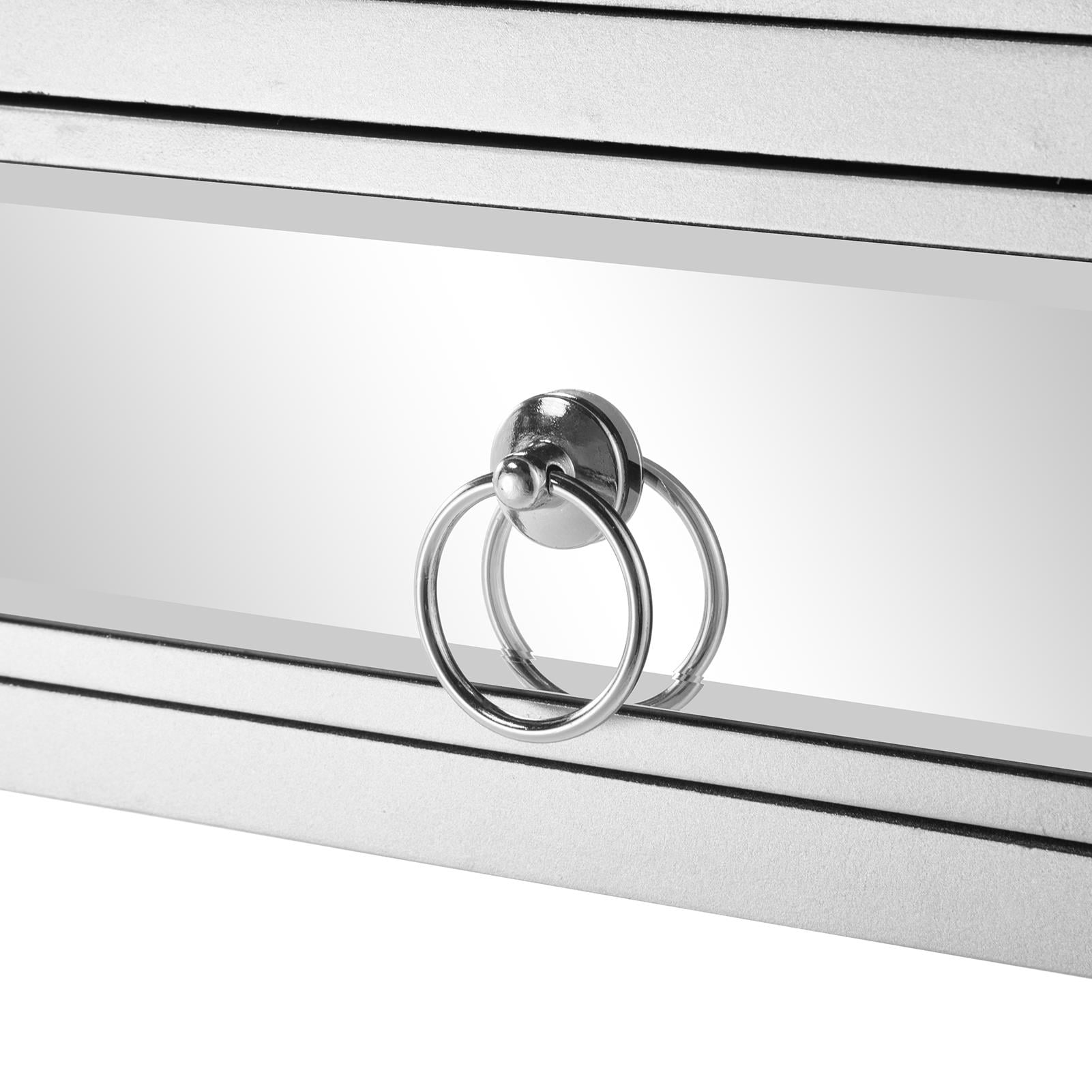 Glamorous mirrored top and storage fronts Feature 5 drawers for storage Smooth drawer glides for lasting use Mirrored finish and crystal-style knobs