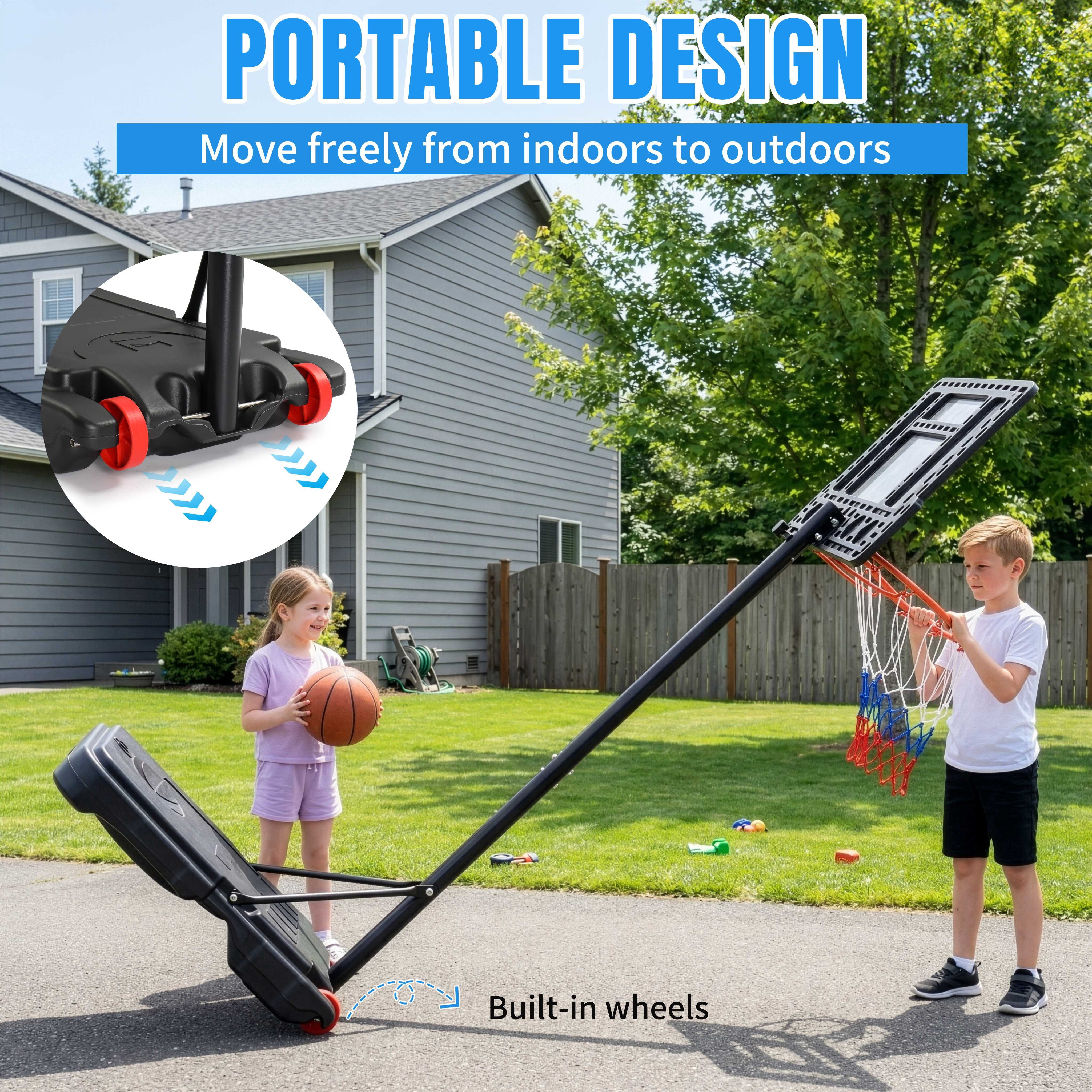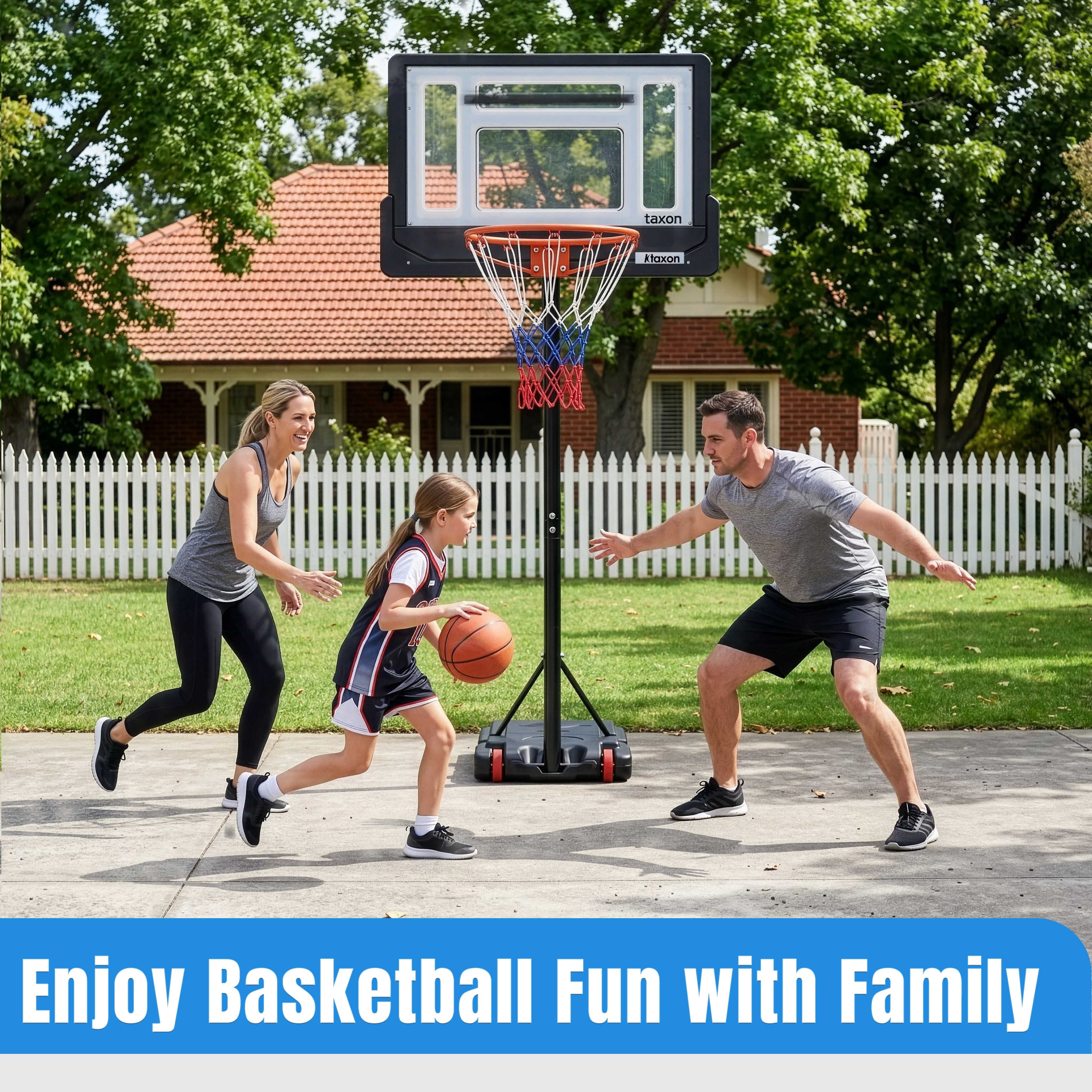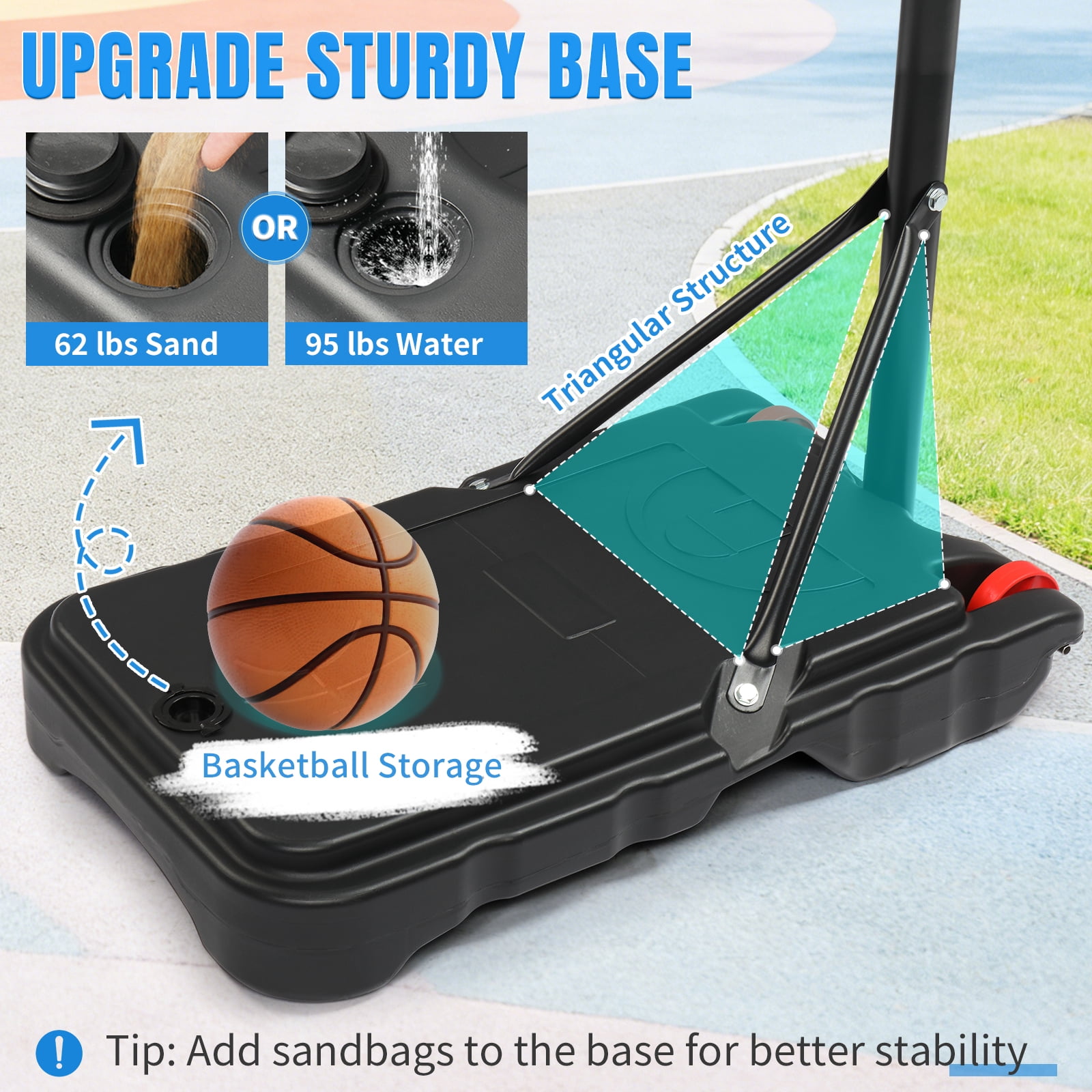 Height Adjustable — Easily adjust the hoop’s height from 6.5 to 8 feet to accommodate players of all ages and skill levels. Sturdy Triangular Design — Upgraded backboard support poles provide enhanced stability, while both the base and backboard form stable triangular structures. Complete Set — This basketball hoop comes with a standard Size 5 basketball and an air pump, so you’ll be ready to play right away. Easy Installation — We provide a detailed instruction manual and installation video for a hassle-free setup. If you encounter any issues, don’t hesitate to contact us for support. Durable Weather-Resistant Backboard — The 33-inch shatterproof backboard is built to withstand tough play and can be used in any weather conditions. Spacious Base Water Tank — The base water tank measures (76 x 46 x 13)cm / (30 x 18 x 5)”, providing stability and peace of mind during intense games.