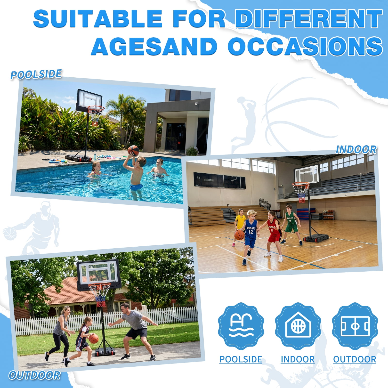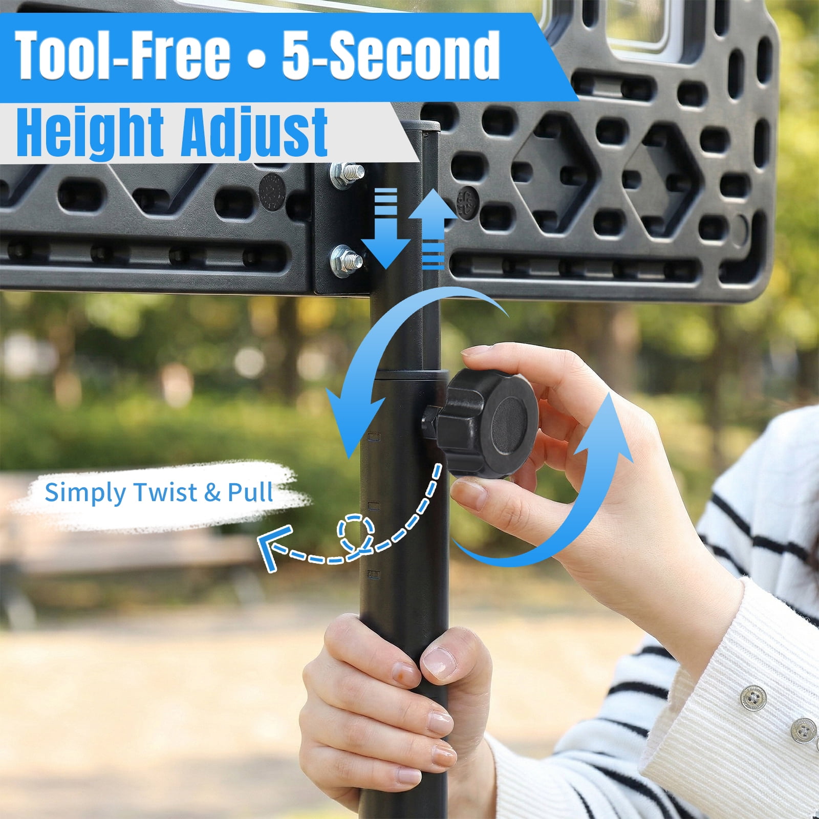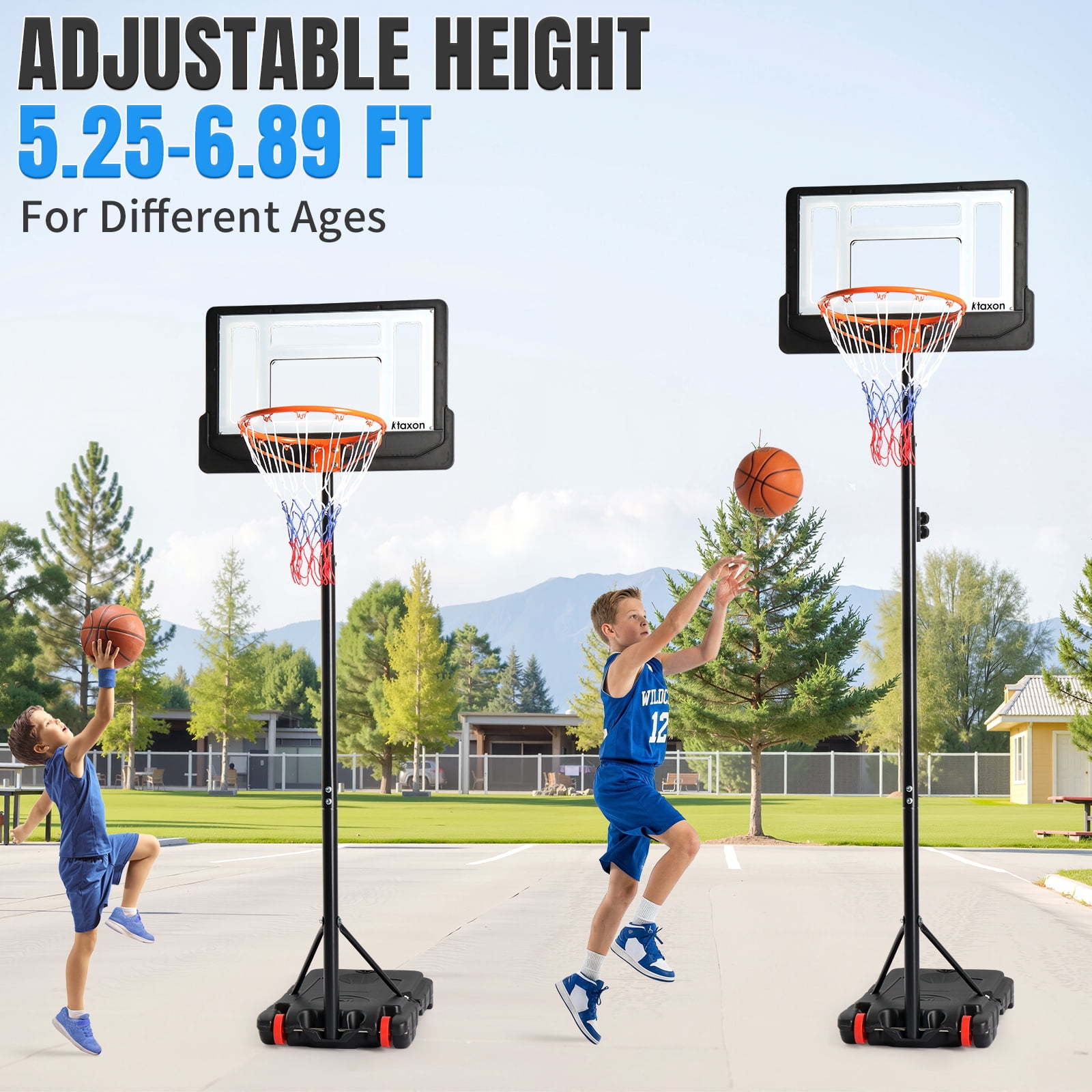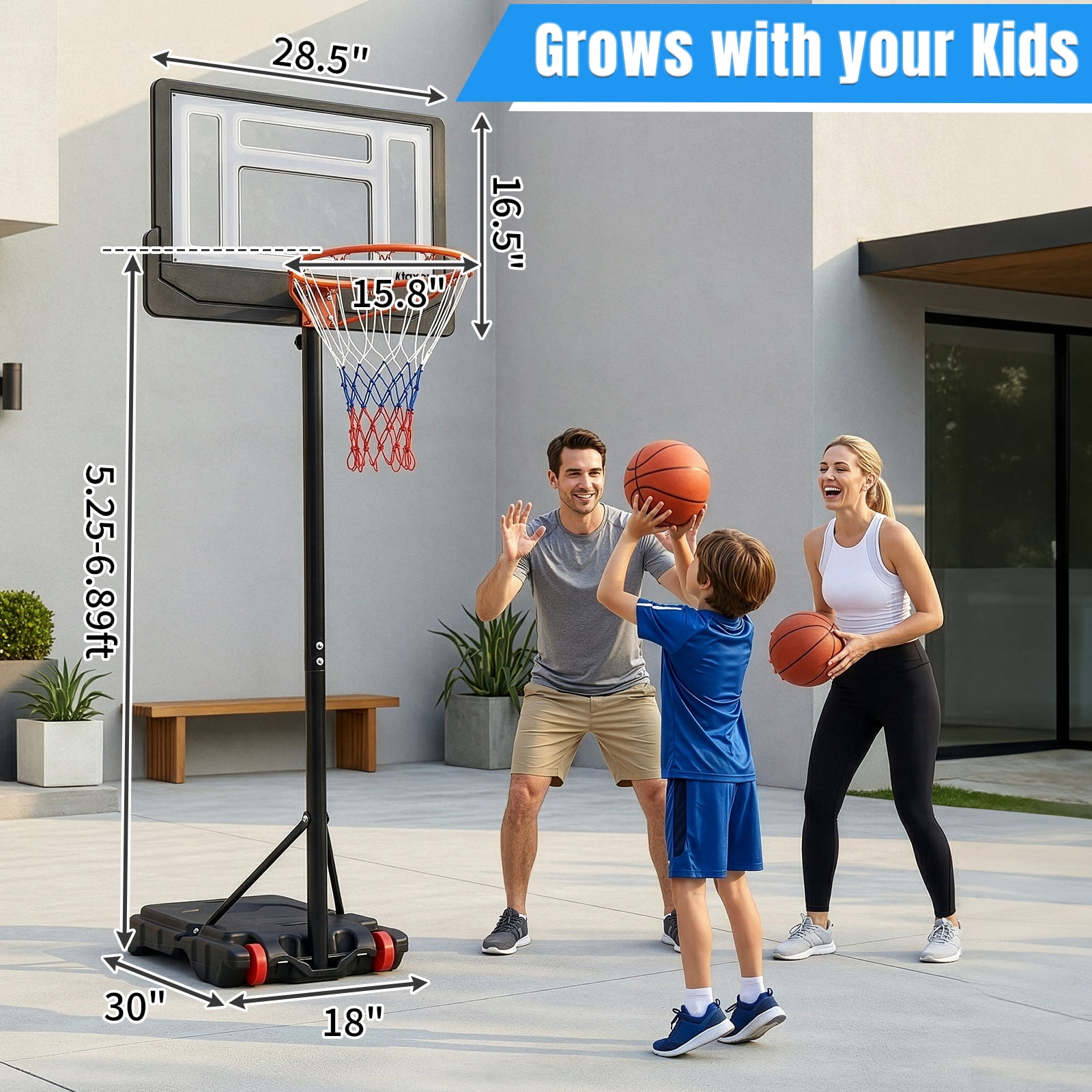 Height Adjustable — Easily adjust the hoop’s height from 6.5 to 8 feet to accommodate players of all ages and skill levels. Sturdy Triangular Design — Upgraded backboard support poles provide enhanced stability, while both the base and backboard form stable triangular structures. Complete Set — This basketball hoop comes with a standard Size 5 basketball and an air pump, so you’ll be ready to play right away. Easy Installation — We provide a detailed instruction manual and installation video for a hassle-free setup. If you encounter any issues, don’t hesitate to contact us for support. Durable Weather-Resistant Backboard — The 33-inch shatterproof backboard is built to withstand tough play and can be used in any weather conditions. Spacious Base Water Tank — The base water tank measures (76 x 46 x 13)cm / (30 x 18 x 5)”, providing stability and peace of mind during intense games.