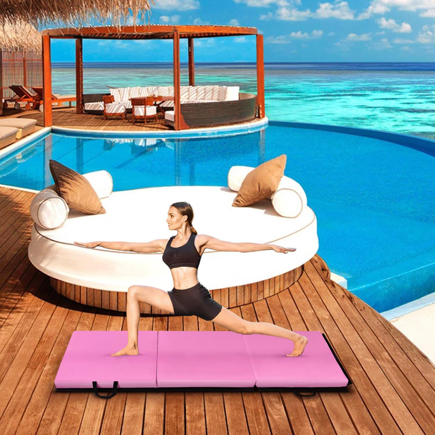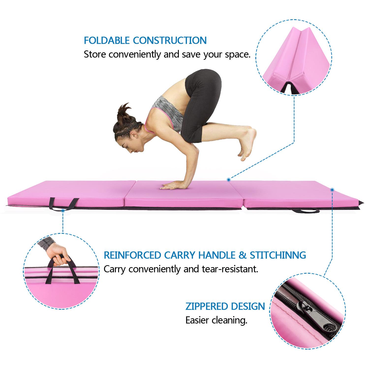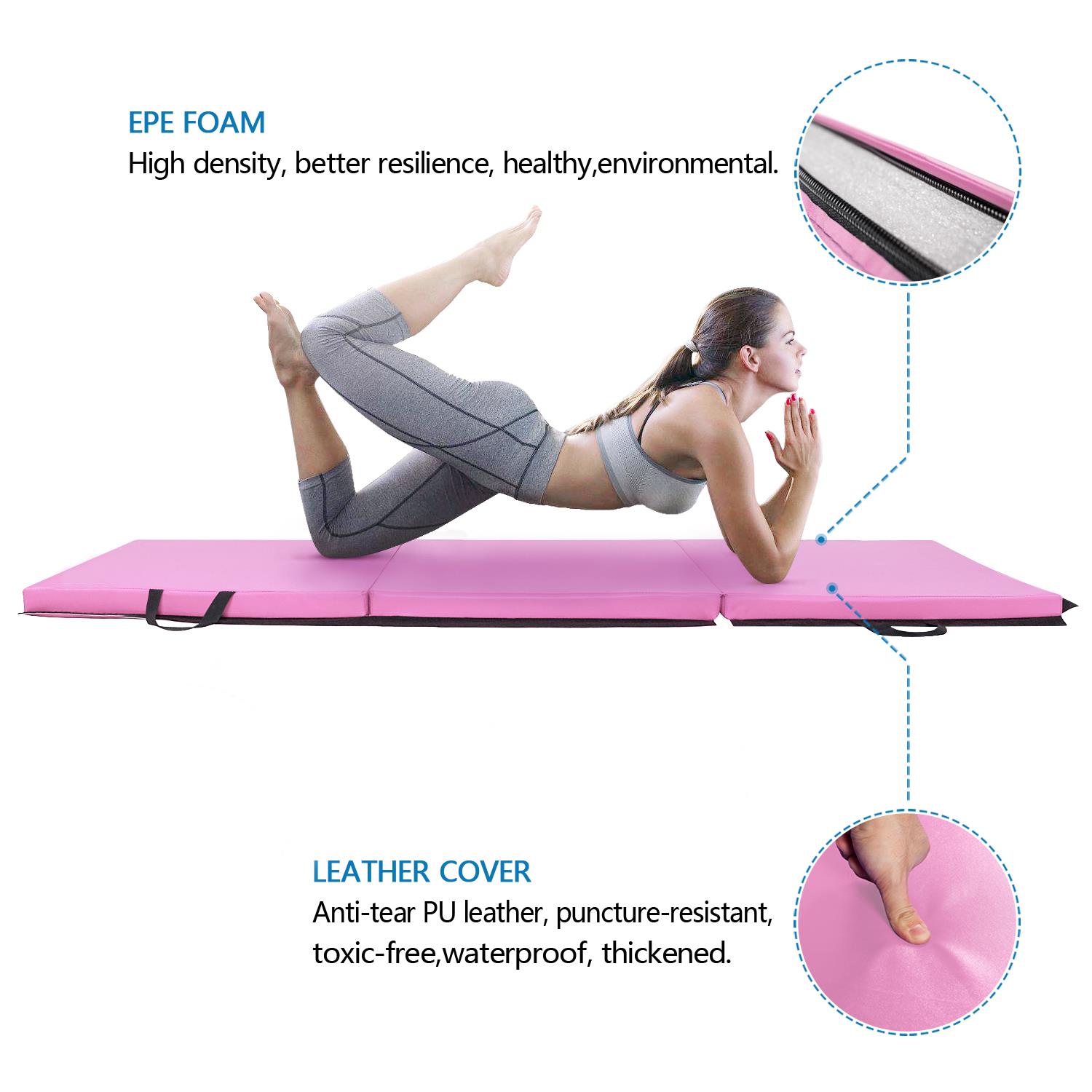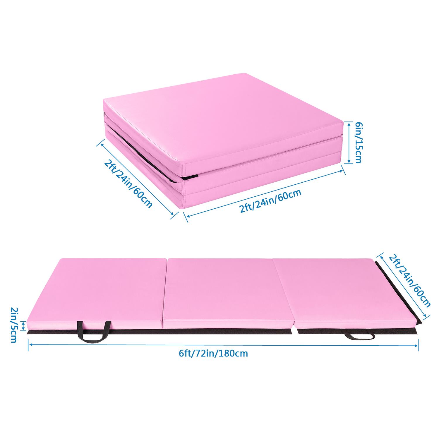 Foldable and handle design Yoga mat adopts a three-fold design, which can be folded to the smallest size of 24×24×6inches, which is convenient for storage and saves space. The portable handle is designed on the side. After folding the yoga mat, you can place it in the corner of a closet or room, or you can easily transfer it to any place you want by driving. Safe, non-toxic, environmentally friendly material Gymnastics Mat surface is made of PU leather that is tear-resistant,puncture-proof, non-toxic and waterproof.When you use it,You don’t need worry about sweat dripping on the gym mat during use.just wipe it with paper or cloth, easy clean.Mat inside is filled with EPE high-density foam,which has better elasticity and more durabl quality than other materials, give you a more comfortable experience. Thickened design,Great size Folding gym mat thickness is increased to 2in, which has more elasticity and comfort.mat can be placed on a hard floor, The thick and soft EPE material ensures that if you accidentally fall during exercise, you don’t have to worry about getting injured.Protect knee joints, elbow joints.The unfolded size of the gymnastic mat is 6ft×2ft×2in , which is suitable for professional gymnasts, but also very suitable for you or your children, grandchildren and grandchildren practice some gymnastic actions at home, improve physical flexibility. Zipper and Magic Tape design Tumbling mats are equipped with a zipper on the outer surface. When you use it for a period of time, if you want to clean it, you can easily remove it.A single cushion is suitable for people height under 5’9″ , if you think one mat is too small,We design Magic Tape on the side of gymnastic mat,you can buy more of our same mat, put these mat together, increase the size, Reach your satisfied size, humanized design, convenient to use. Multifunctional use Our gymnastic mat allows you to do cartwheel, somersault, handspring and other gymnastics actions at home.Or you can use it as a yoga mat,also you can fold it up as a floor mat, even you can also use it as a baby crawling mat, with multiple functions waiting for you find. Specifications 1. Material: PU;EPE 2. Color: Pink 3. Unfolding Dimensions: 72x24x2″ / (180 x 60 x 5)cm 4. Folding Dimensions: 24x24x6″ / (60 x 60 x 15)cm 5. Weight: 2.4kg / 5.29lbs 6. Type: Three Folds 7. Conditon: New Package Includes 1 x home gym mat