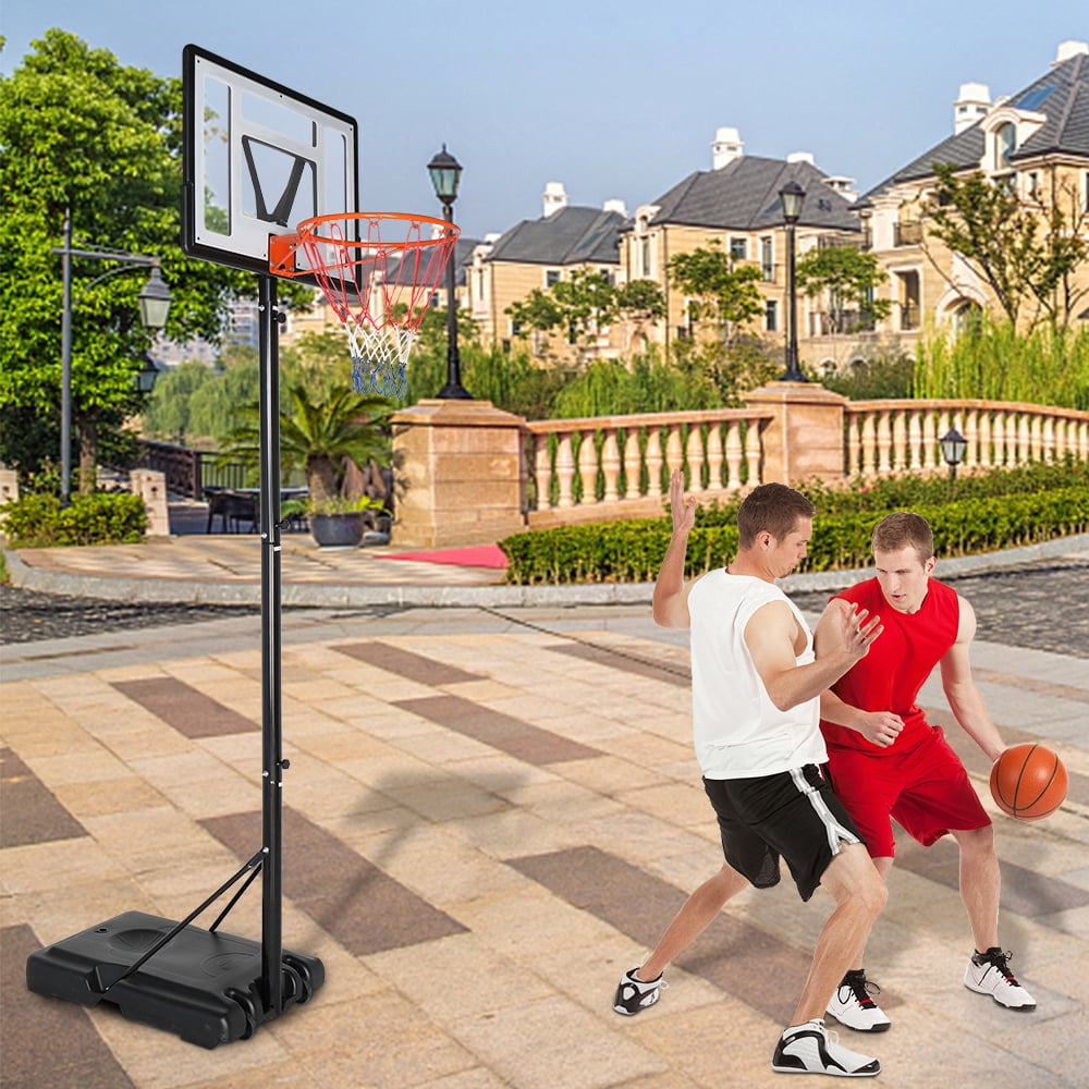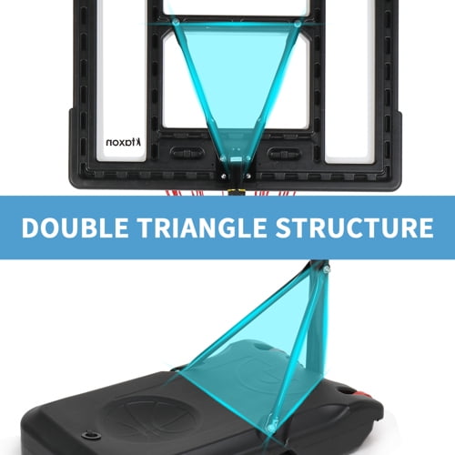 Adjustable height range from 8 feet to 10 feet, allowing players of all ages and skill levels to enjoy the game at their desired height. Sturdy and durable 35-inch pvc backboard built to withstand rigorous play and designed for long-lasting use. Stable triangular support system with dual support brackets, sturdy base, and reinforced pole for optimal stability and safety during games. Portable and convenient design with a wheeled base, making it easy to move the basketball hoop from one location to another for indoor or outdoor use. Includes a complete set of installation tools, detailed instructions, and an installation video for a user-friendly assembly process.