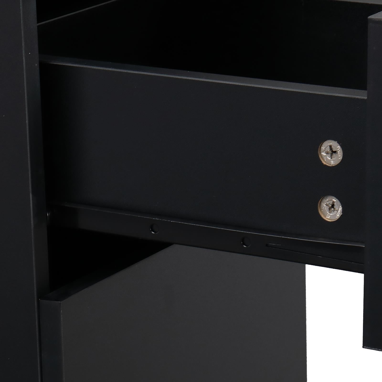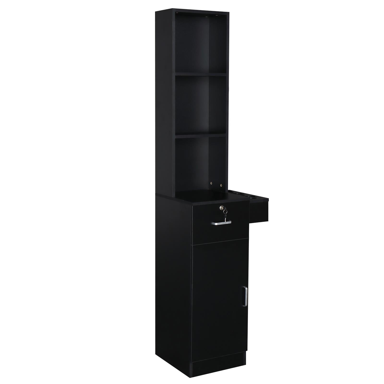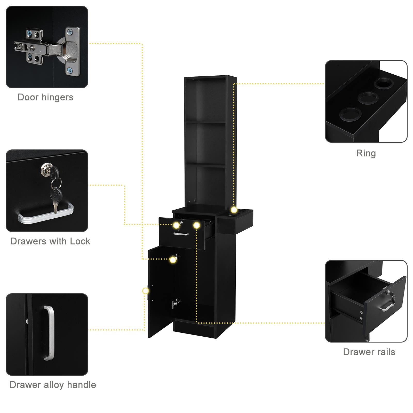Introductions: This Wall Mount Hair Styling Station will be a great addition to any salon. It is a professional Salon Wall Mounted Shelf Station. It features locked drawers safe design, which can store necessary things. Besides, 1 big storage at the bottom and 3 shelves to present or to store products. With simple design, it is easy to install. It adopts high quality MDF and PP plastic, which is eco-friendly and durable in use. It is full of elegance. Features: 1. A professional Salon Wall Mounted shelf station. 2. U-shaped handle designï¼feature locked drawers safe design. 3. 1 drawer, 1 big storage at the bottom and 3 shelves to present or to store products. 4. Easy to install. 5. Produced by high quality MDF , eco-friendly and durable in use 6. The shape of the salon station is specially designed for small barbershops and salon, making full use of space to realize the storage function without affecting the appearance. The suitable height 69.7″ is also convenient for your use. 7. The right have 3 holes of the same size,to hold tools like store irons, blow-dryers, and other heated tools. The heating or just used tools should not be put into the holder since it is very hot and so the holders can be melted. 8. Increase safety accessories designï¼Unanchored salon furniture can tip over. We have taken into account the instability that may be caused by the height and bottom area of the barber station so we have added anti-dumping accessories to connect the product to the wall during installation to achieve product stability. 9. Full of elegance, modern and fashion. Specifications: 1. Material: MDF and PP Plastic 2. Color: Black 3. Dimensions: (14.6 x13 x 69.7)” / (L x W x H) 4. Shelf Dimensions: 11.4″L x6.5″W x 11.4″H 5. Drawer Dimensions (Inner) : 9.6″L x11.2″W x 3.3″H 6. Cabinet Dimensions (Inner): 11.8″L x 13.2″W x 21.9″H 7. 3 Plastic Ring Diameterï¼2.4*2.4″ 8. Weight: 52.8 Lbs / 24Kg Package Includes: 1 x Wall Mount Hair Styling Station 1 x English Manual