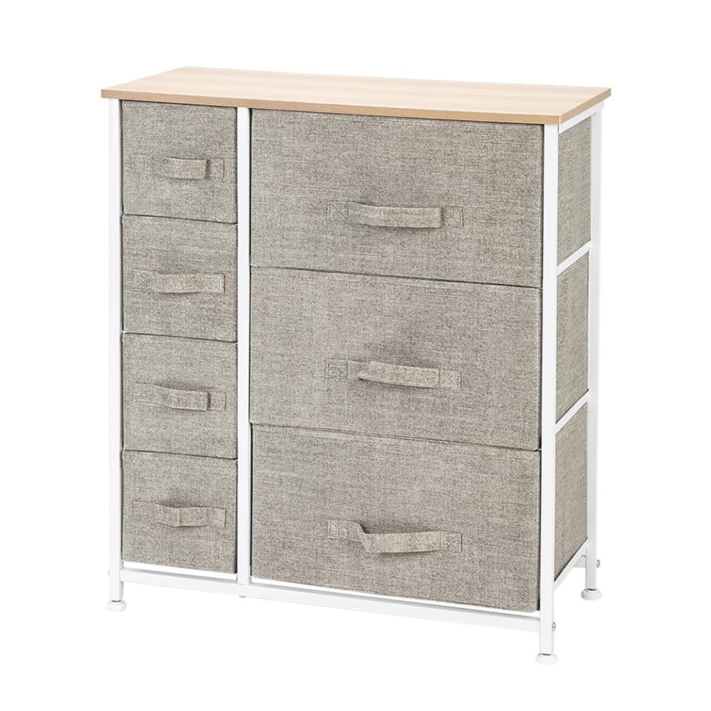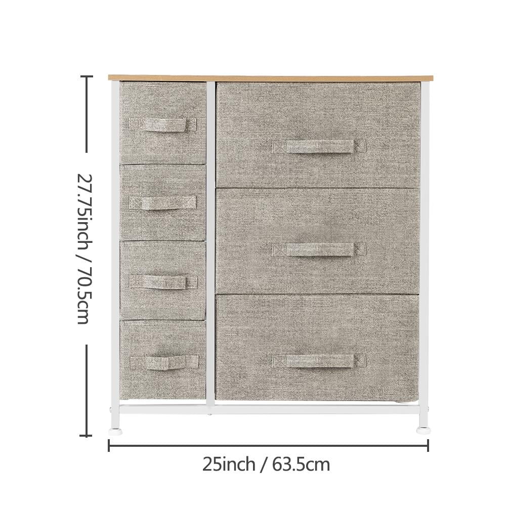 Features: 7-DRAWER DRESSER – Style meets function with our small dresser chest, complete with a wood surface and storage drawers — Pairs beautifully with the Sorbus Foldable Furniture Collection DISPLAY & DE-CLUTTER – Wood top provides hard surface for displaying lamps, alarm clocks, books, eyeglasses, charging station, and more FOR HOME, OFFICE, DORM – Suitable for bedroom, living room dresser, guest room, closet, nursery, hallway, , college dorm, small apartment solutions, etc REMOVABLE & FOLDABLE DRAWERS – Soft fabric drawers with reinforced base — Easy pull handle for quiet opening and closing — Removable Drawers fold flat for easy storage when not in use SMART & STYLISH DESIGN – Sleek wide storage — Made with strong steel frame and durable MDF wood top with smooth finish — Drawers made of breathable, non-woven fabric Specifications: 1. Color: Brown/Gray/Linen 2. Material: MDF(Medium Density Fiberboard),Iron,Non-Woven Fabric 3. Frame Dimension:(25 x 11.87x 27.75)” / (63.5 x 30 x 70.5)cm (L x W x H) 4. Drawer Dimension: (16 x 11 x 8.26 )” / (40.5 x 28 x 21)cm (L x W x H) / (6.5 x 11 x 6.1)” / (16.5 x 28 x 15.5)cm (L x W x H) 5. Drawers: 7drawer 6. Product Care: Wipe Clean With A Wet Cloth And Let It Dry 7. Product Weight: 15.2lb / 6.9kg 8. Static Load Capacity Of The Shelf: 22lb / 10Kg 9. Static Load Capacity Of Each Drawer: 6.6lb / 3kg Package Includes: 1 x Drawer Storage Dresser 1 x Assembling Tool Kit 1 x Instructions