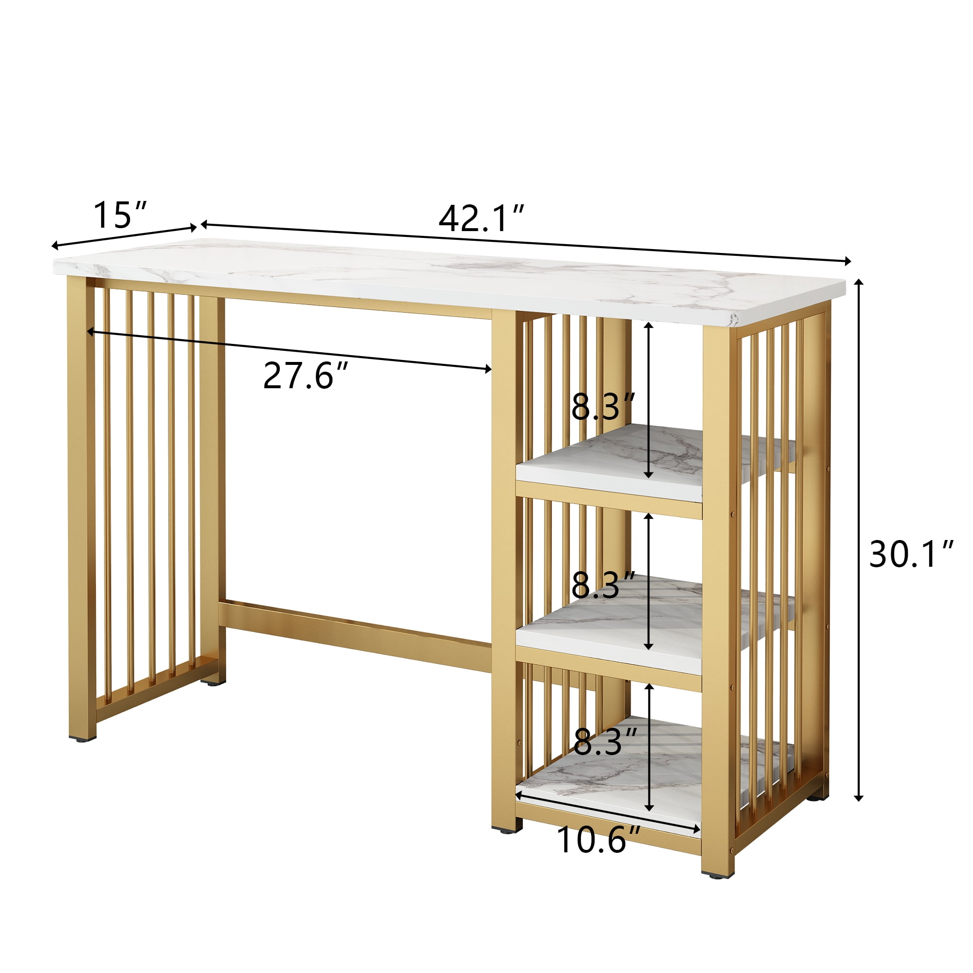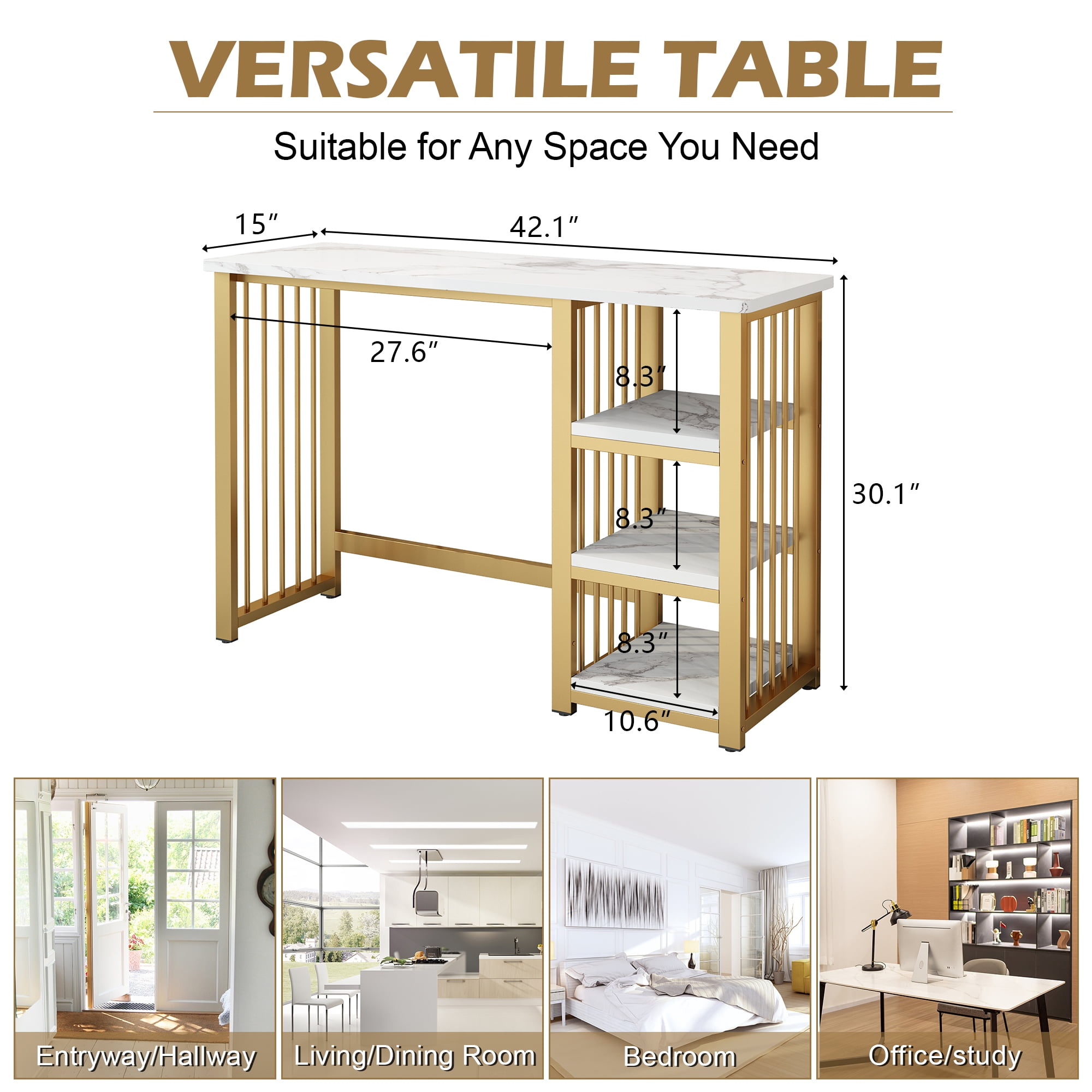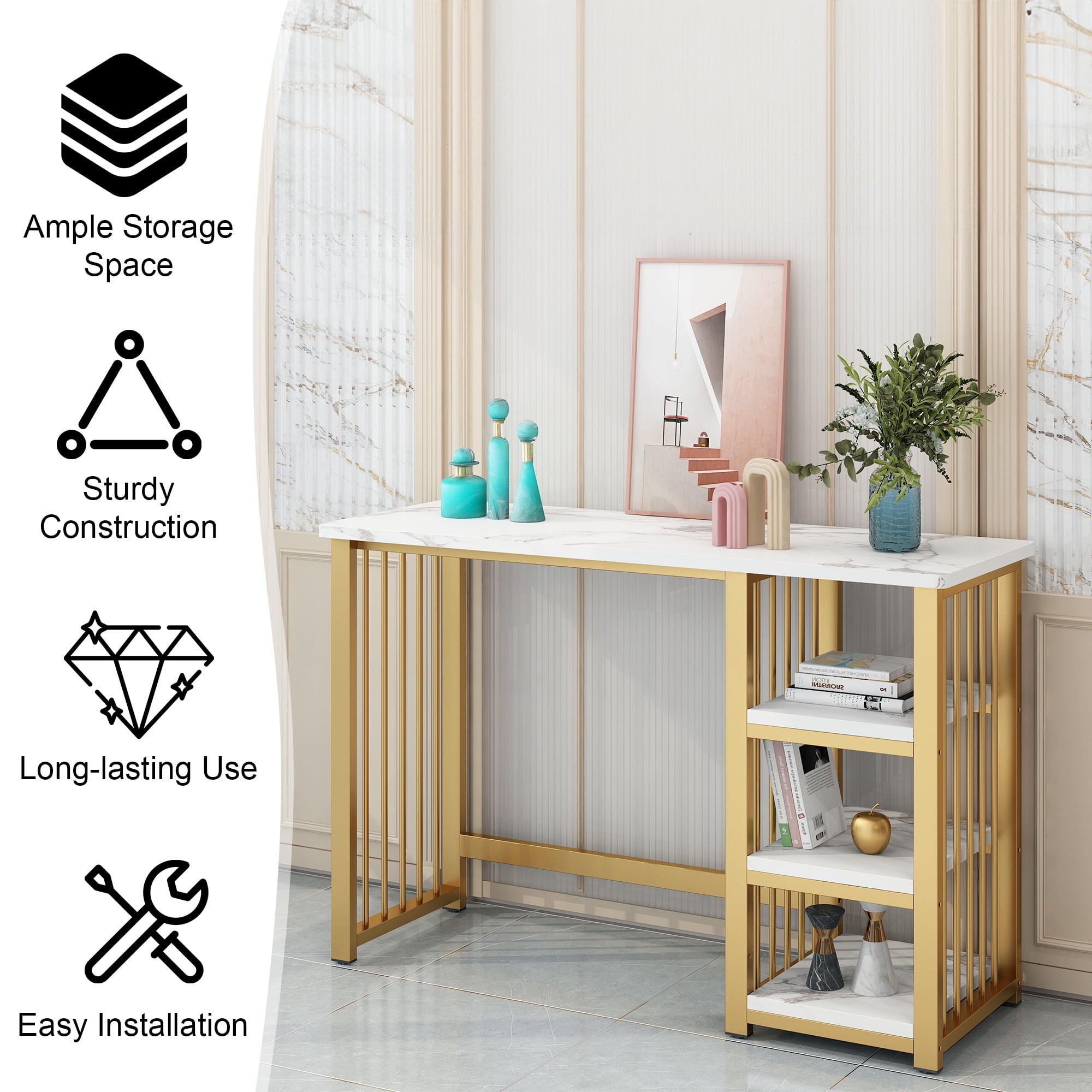 Introduction: This modern console table from our collection elegantly combines the versatility of a spacious 4-tier shelf with a luxurious gold brushed base and cultured marble finish, making it the perfect addition! Add a contemporary touch to any room with this chic console table from our collection. The table offers ample storage space for all your daily essentials and can be placed next to the sofa or along the hallway to hold your favorite decorations, photos and flowers. There are also anti-scratch washers on the metal feet to improve overall stability, and you don’t have to worry about the metal feet damaging your floor. The spacious countertop accommodates delicate decorations, snacks or drinks. The bottom open shelf is suitable for storing miscellaneous items. Basically, its straight lines and compact size allow you to place the hallway side table in various places such as living room, hallway, dining room or bedroom. Features: Platinum minimalist, elegant console table The smooth surface of the sofa table is easy to clean and maintain Narrow hallway side tables take up less space Living room corridor storage table with 4 storage shelves and extra large storage space Reinforced metal bracket with strong load-bearing capacity Specification: Color:White/Gold Color Material: MDF Metal Dimensions: Dimensions: W42.1 x D15 x H30.1 in Load capacity: 330 lbs Package Include: 1 x Console Table 1 x Instructions