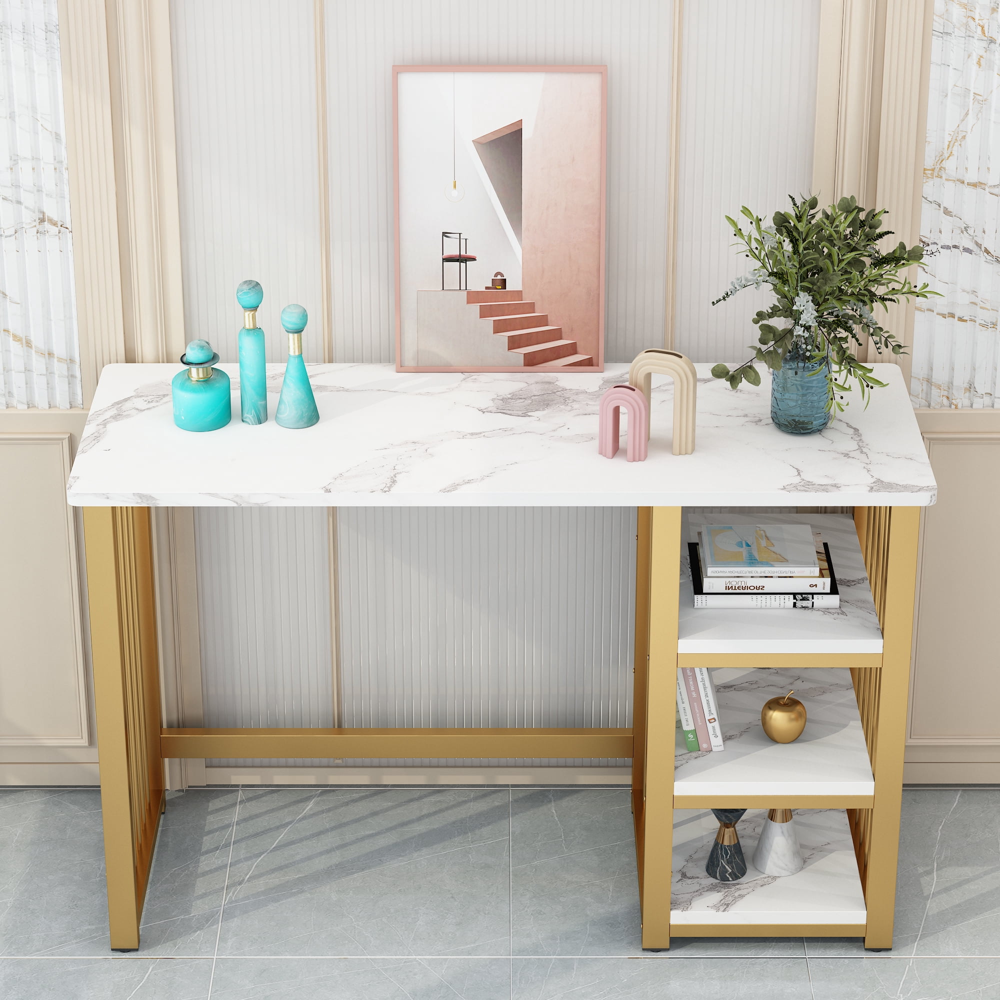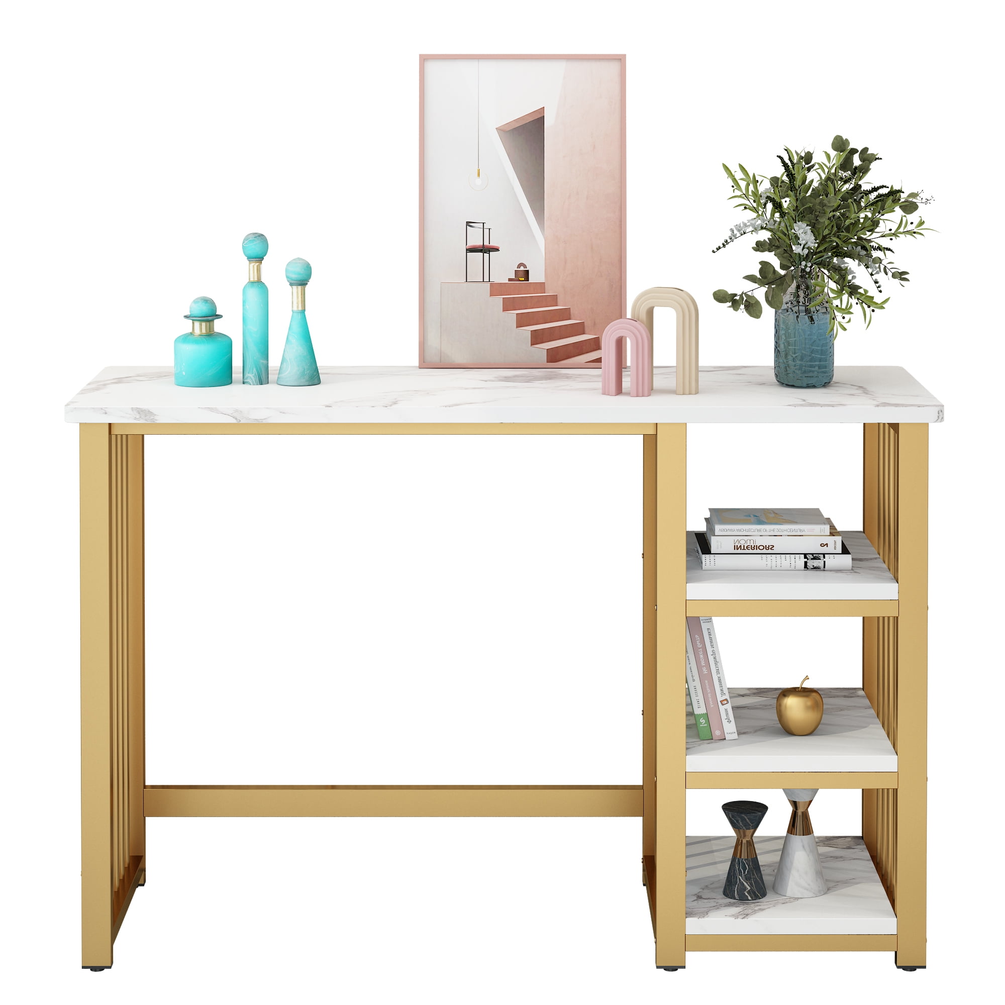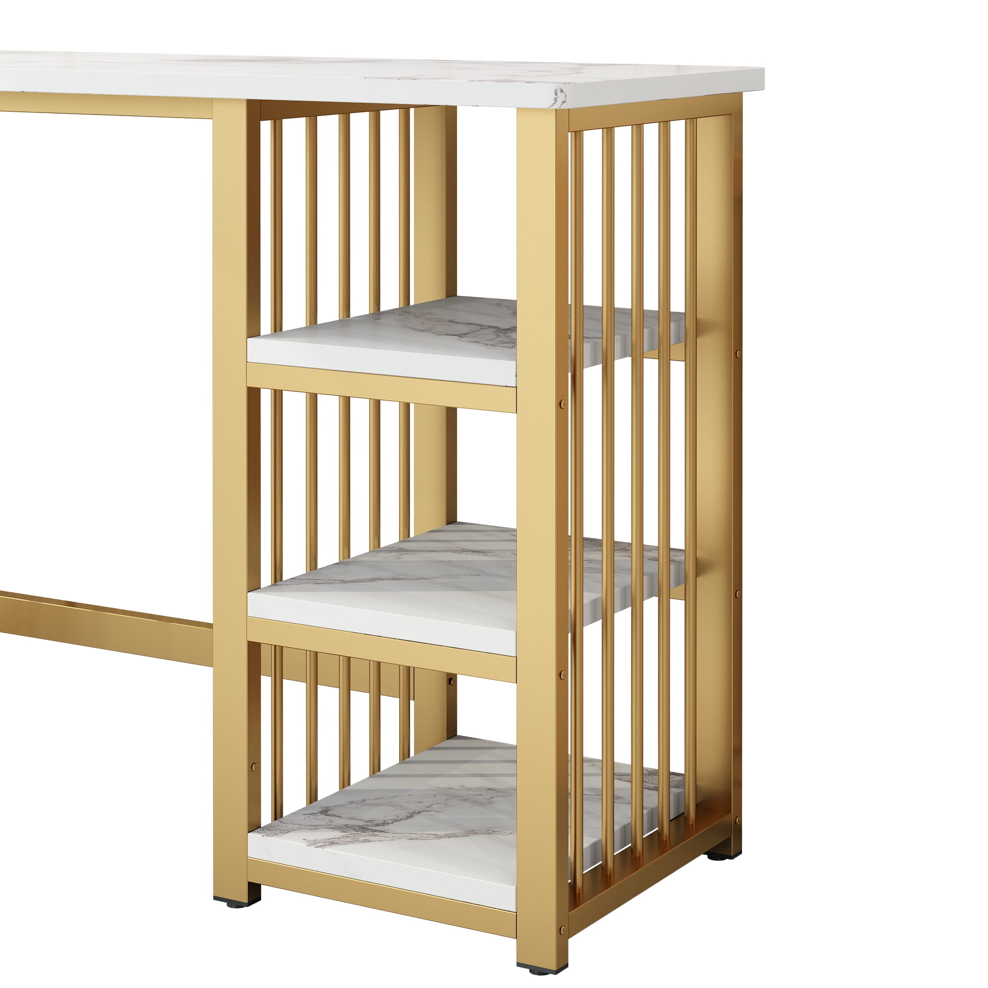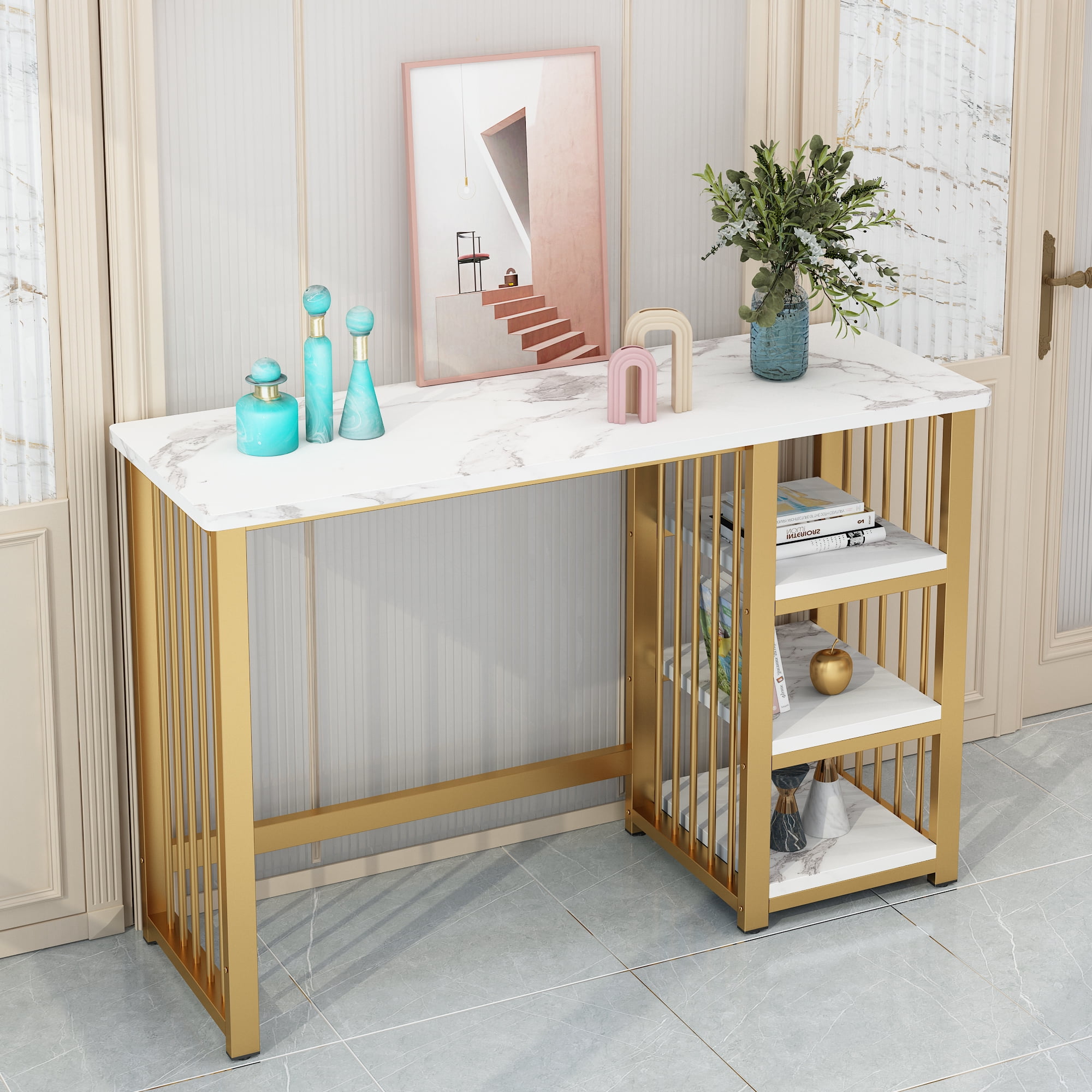 Introduction: This modern console table from our collection elegantly combines the versatility of a spacious 4-tier shelf with a luxurious gold brushed base and cultured marble finish, making it the perfect addition! Add a contemporary touch to any room with this chic console table from our collection. The table offers ample storage space for all your daily essentials and can be placed next to the sofa or along the hallway to hold your favorite decorations, photos and flowers. There are also anti-scratch washers on the metal feet to improve overall stability, and you don’t have to worry about the metal feet damaging your floor. The spacious countertop accommodates delicate decorations, snacks or drinks. The bottom open shelf is suitable for storing miscellaneous items. Basically, its straight lines and compact size allow you to place the hallway side table in various places such as living room, hallway, dining room or bedroom. Features: Platinum minimalist, elegant console table The smooth surface of the sofa table is easy to clean and maintain Narrow hallway side tables take up less space Living room corridor storage table with 4 storage shelves and extra large storage space Reinforced metal bracket with strong load-bearing capacity Specification: Color:White/Gold Color Material: MDF Metal Dimensions: Dimensions: W42.1 x D15 x H30.1 in Load capacity: 330 lbs Package Include: 1 x Console Table 1 x Instructions