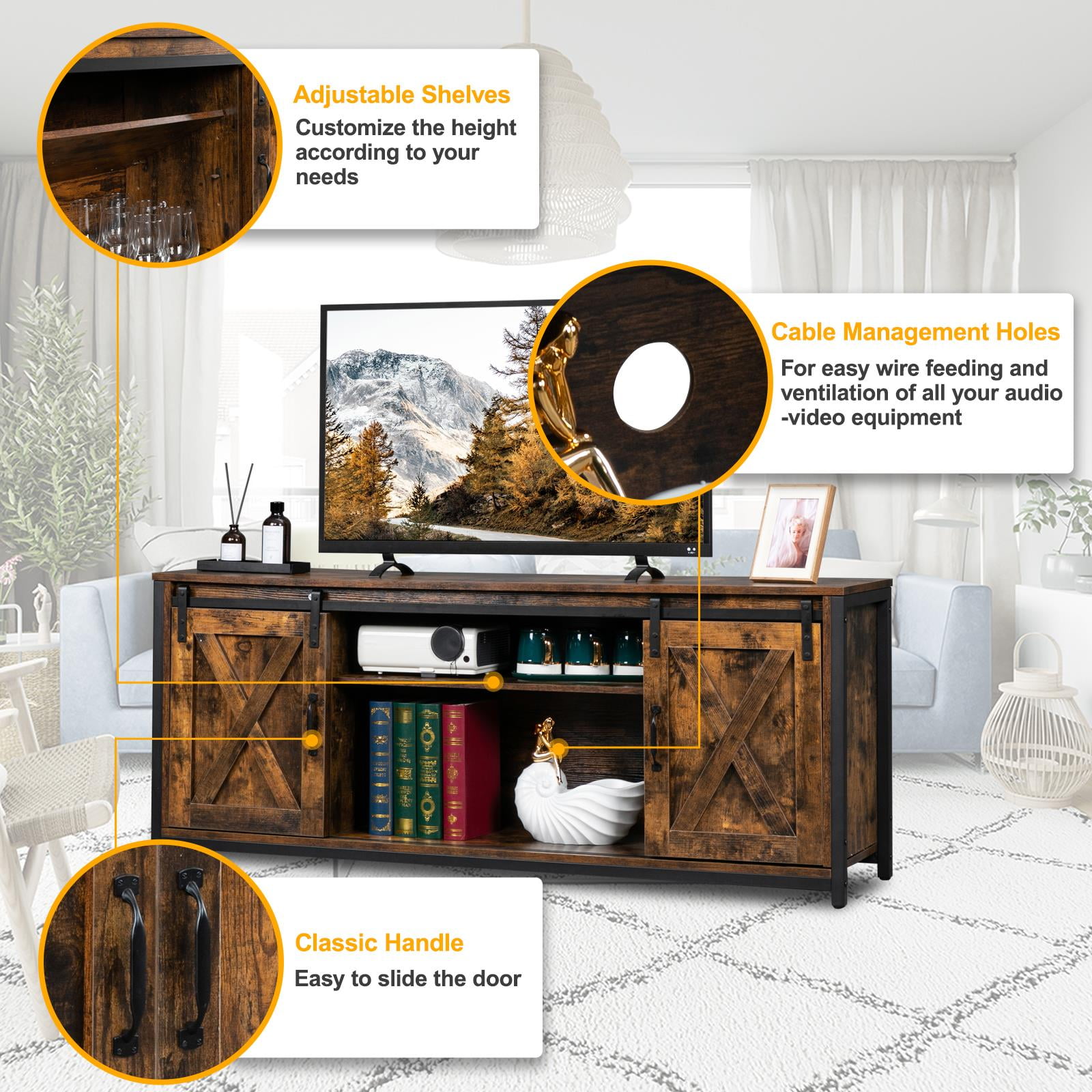 Introduction: This center for TV media console cabinet could meet your various need of TV cabinet in your home, bring very good enjoyment to your daily life. It can be used as a storage TV stand in your living room, buffet in kitchen, or storage console cabinet in bedroom. Beyond its functionality, Industrial design with the finest wood grain also match every sense of style in your living room.Get It and start to enjoy! Features: 1. FITS UP TO 65 INCHES TVS – Ideal for most televisions up to 65″. Our TV stand for 65 TVs features spacious tabletop, 4 adjustable shelves under the door,2 open compartments. You can put photo frame, CD, DVD, books, magazines and accessories in order. The ample storage space makes this farmhouse sliding door tv stand easy to display collectibles or daily necessities with ease of access. 2. BARN-DOOR-INSPIRED STYLE – This classic sliding barn door style not only saves space, but also suits for rustic farmhouse furniture and industrial spaces alike, this 65″ TV stand with barndoor is a versatile pick for the living room and bedroom. 3. EXTRA DESIGN – Designed with adjustable storage shelves, which has three positions so that you can move it according to your needs. In addition, this rustic brown furniture with two cable management holes will give perfect perch to your media entertainment components. 4. DURABLE & STURDY – Constructed of premium particle board material which promises a long service life, this combination of metal and wood gives the entertainment center for tv media console greater stability. 5. EASY TO ASSEMBLY – Tools and user manual are included in the package of our Ktaxon tv cabinet. All parts are clearly labelled with numbers. Follow the instruction, you can assemble it easily. Note: pls measure the space and the size of your television before purchasing. Specifications: 1.Material: MDF Wood + Metal 2.Color: Rustic Brown (as shown in the picture) 3.Dimensions: (58 x 15.75 x 23.6)” (L x W x H) 4.Weight: 94.36 lbs / 42.8 kg 5.Top Panel Weight Capacity: 240 lbs 6.Shelf Weight Capacity: 20 lbs (middle), 40 lbs (bottom) Package Includes: 1 x Farmhouse TV Cabinet 1 x User Manual