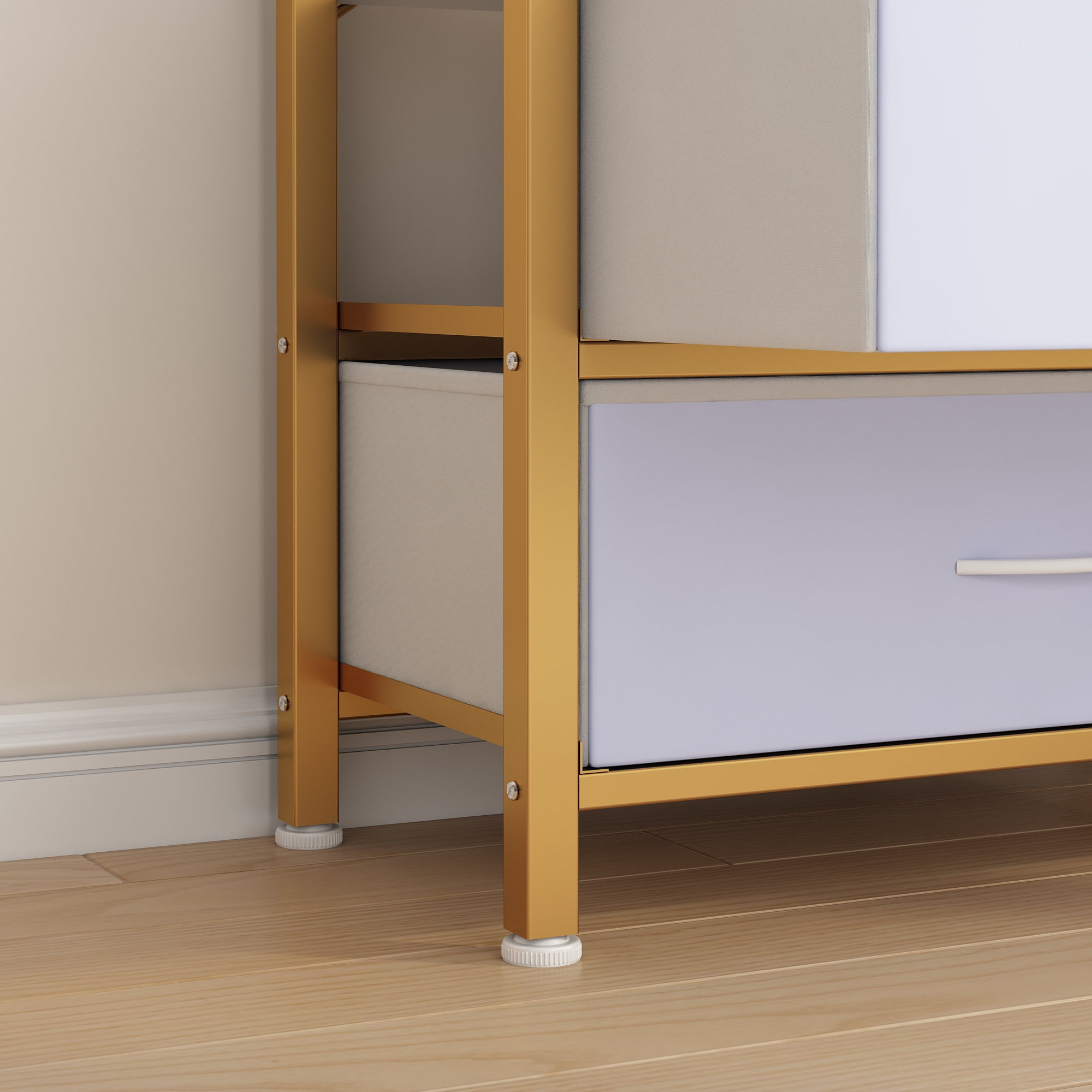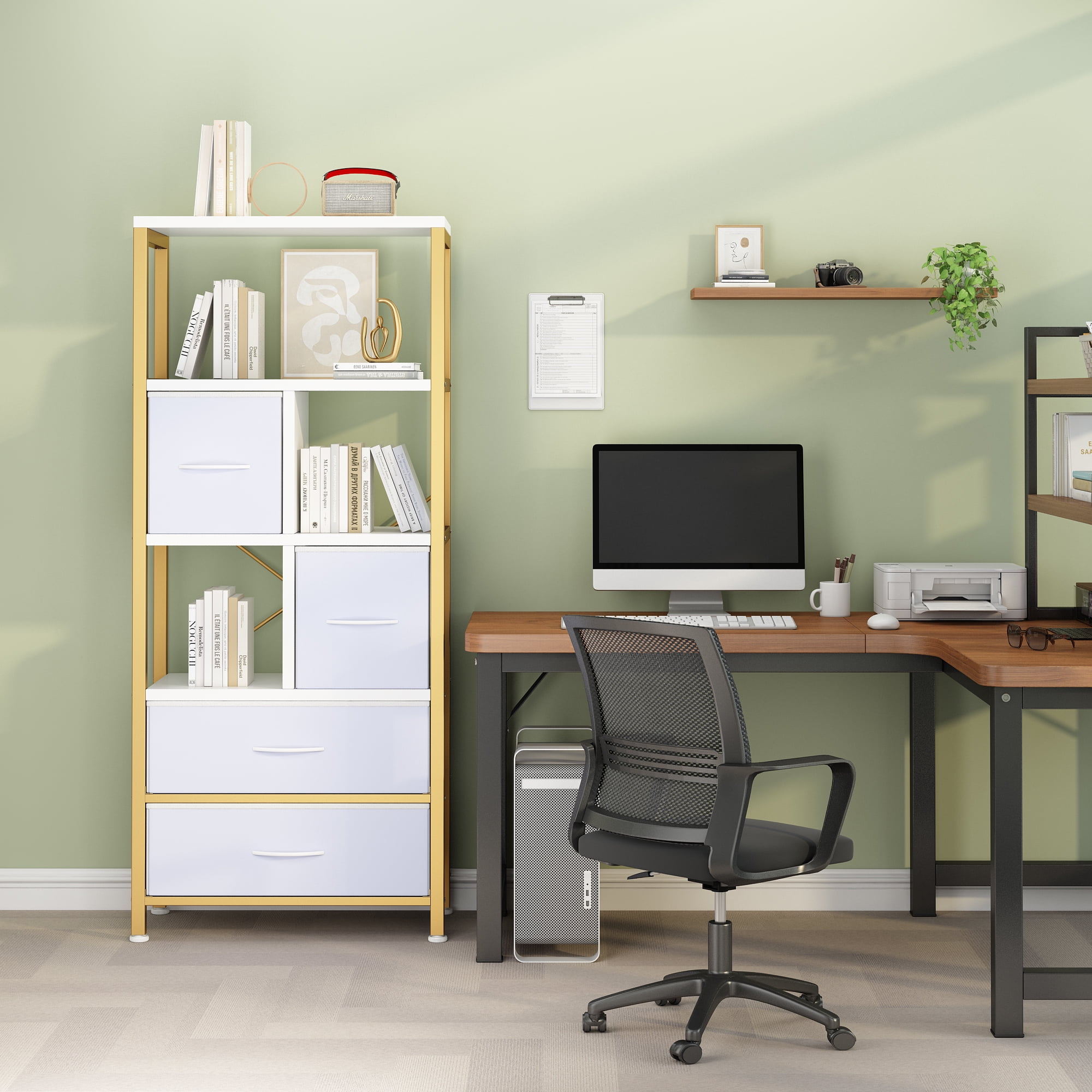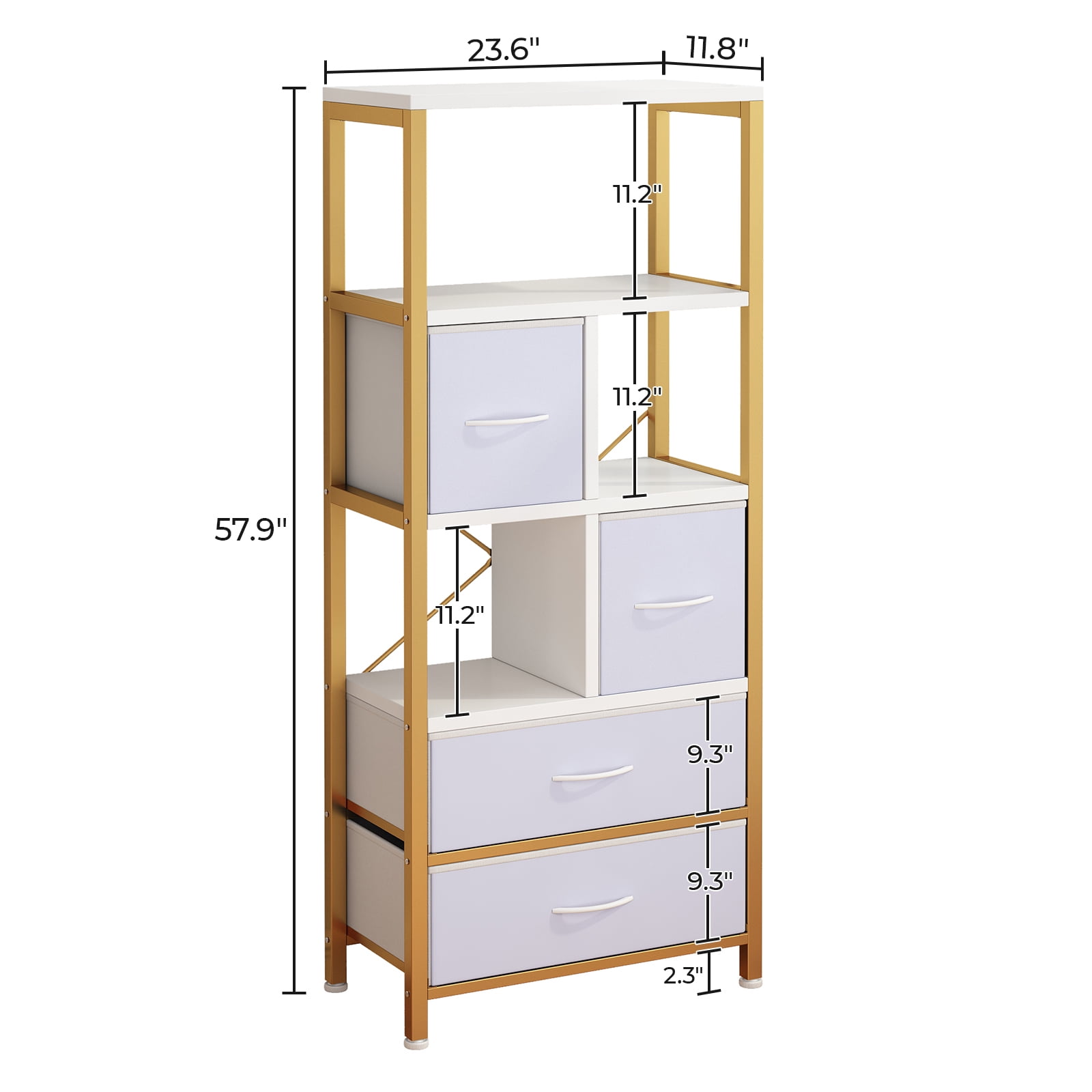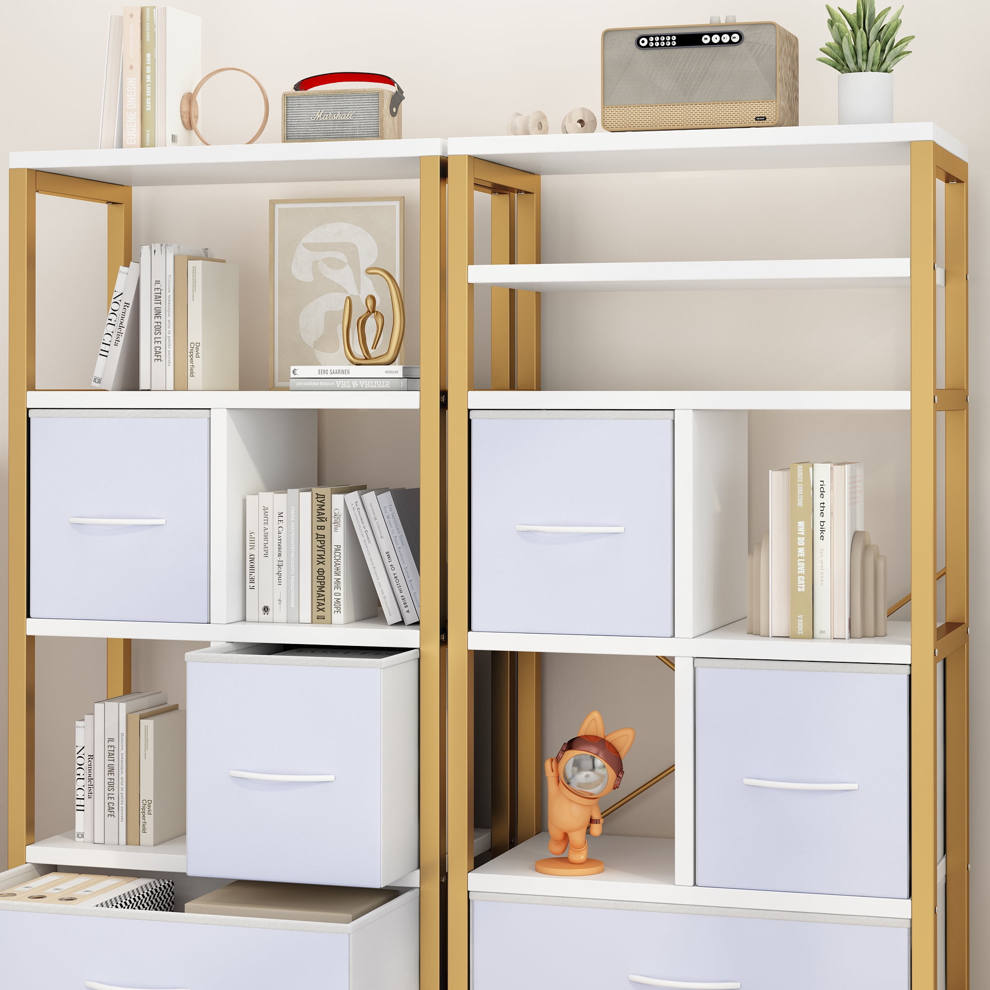 Metal frame builds a solid constryuction that makes sturdy bookshelf evenly stressed and can withstand more weight Thickened board with waterproof coating boasts its excellent durability and easy-to-clean Open shelf makes it super convenient to view all stored and displayed items and effortlessly fetch the items you need. 3 fabric drawers make it is an easy way to collect and display your favorite photos, books, collectibles