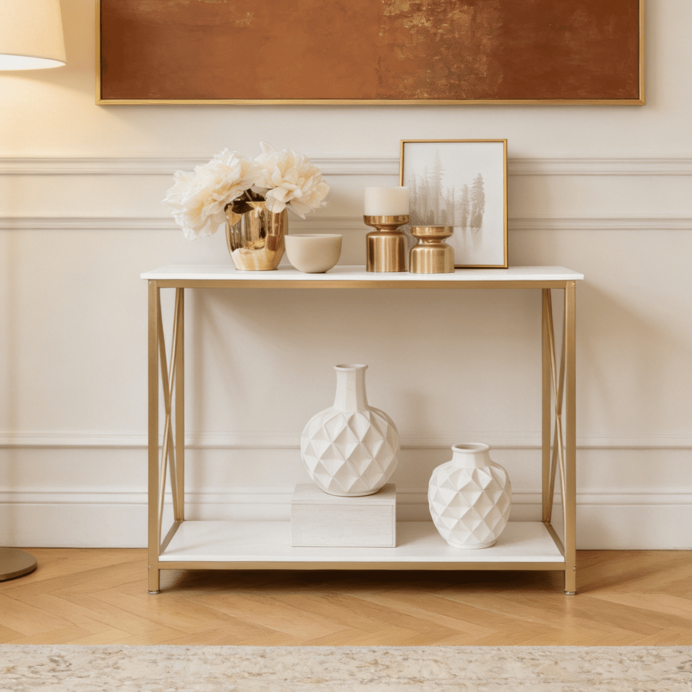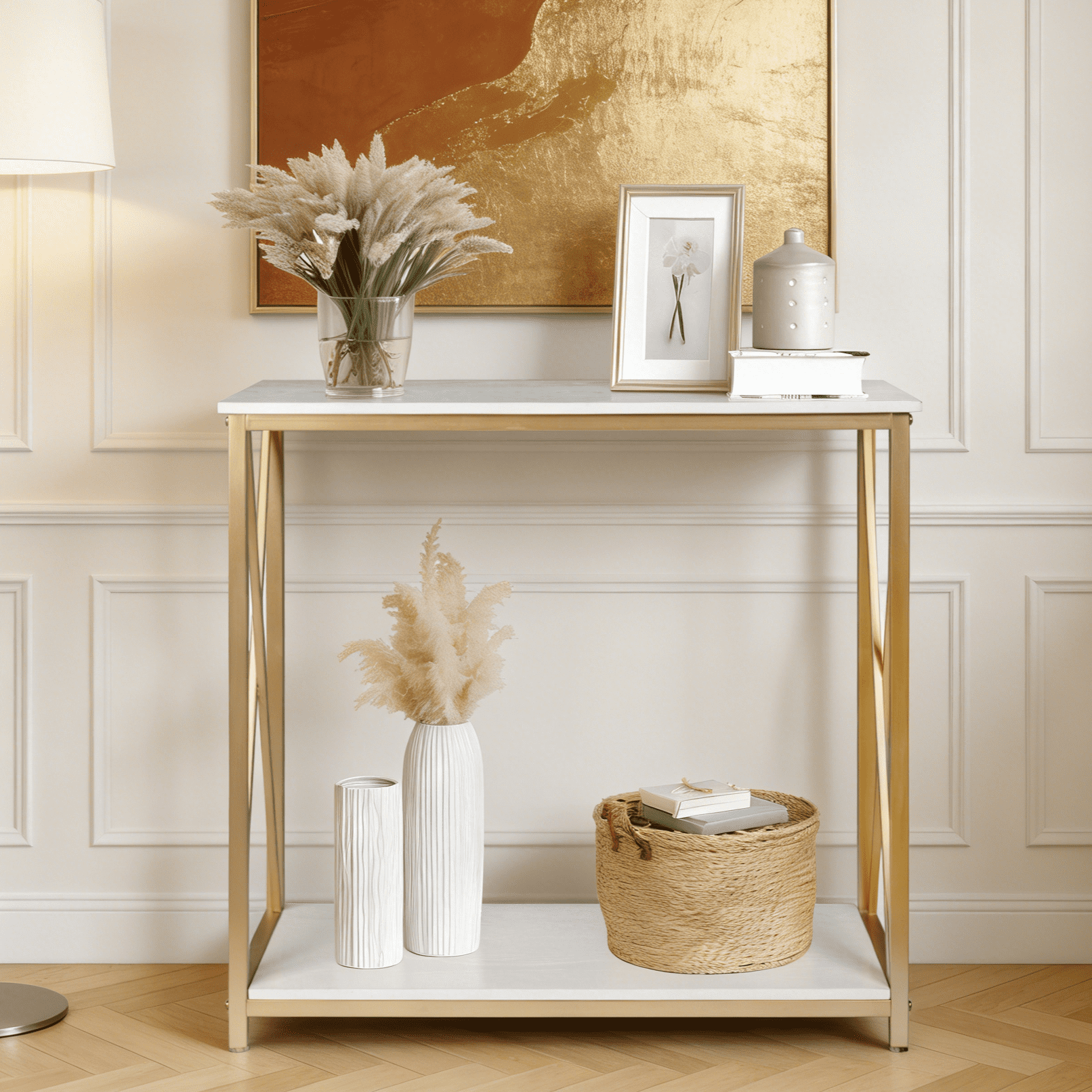 Warm Prompt : Please confirm the product size before purchasing, and confirm that our product size is in line with your requirements! Features: NORDIC STYLE: Console table with nordic style makes a perfect addition to your home; gold metal contrasts with beige white faux marble( MDF board), creating a simple and elegant look; It truly flexes to suit any space and occasion. MULTI-PURPOSE: It can be used as a space-saving console table in your entryway, as a sofa table to decorate the living room or as a TV stand in the family room under your wall mounted TV. SPACE-SAVING: Feature with shelves for storage and display, It saves space and makes your home tidy. STRUCTURAL STABILITY: Sturdy hardware legs and double screws fixed crossbar ensure the stability of frame. EASY TO ASSEMBLE: Nested design makes it easy to assemble; It takes about 15 minutes for a person to install. WARM REMINDER: Customer satisfaction has always been our pursuit. If you have any questions, please feel free to contact us! Specifications: 1. Color: White and Gold 2. Material of The Frame: MDF board Metal Legs 3. Size: 30″L x 13.8″W x 30.71″H Package Includes: 1 x Console Table