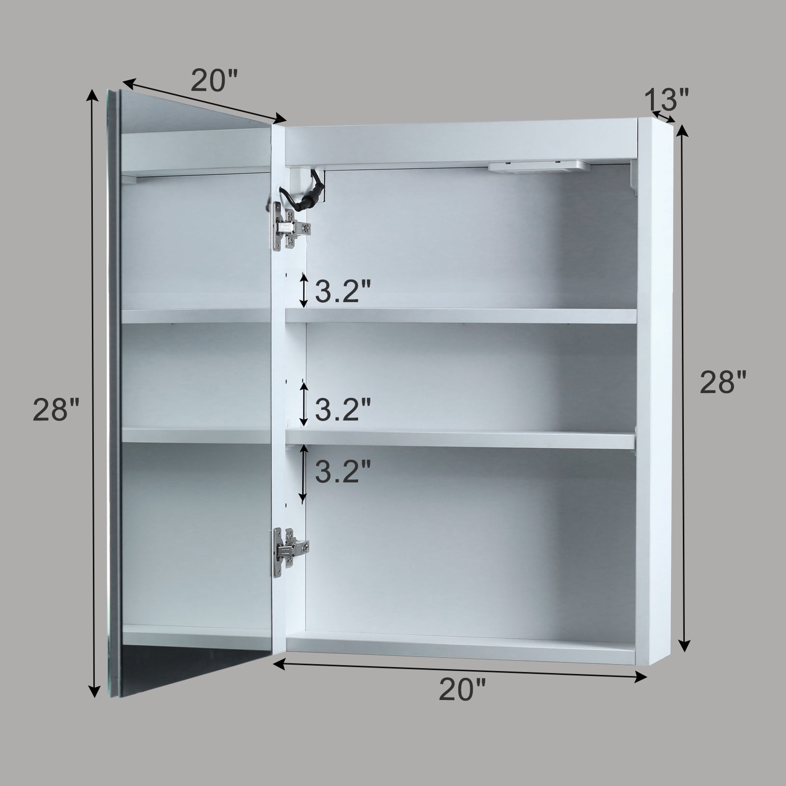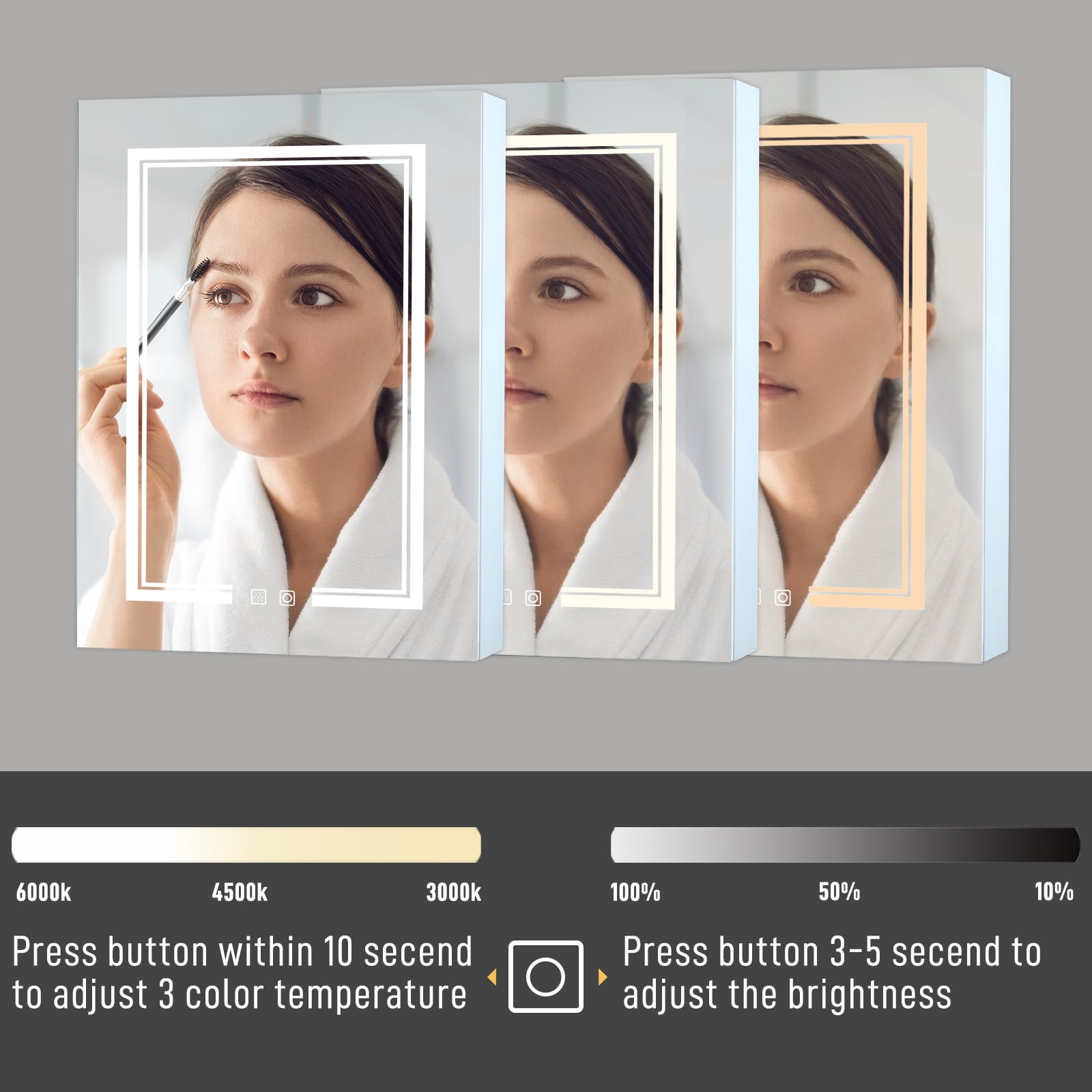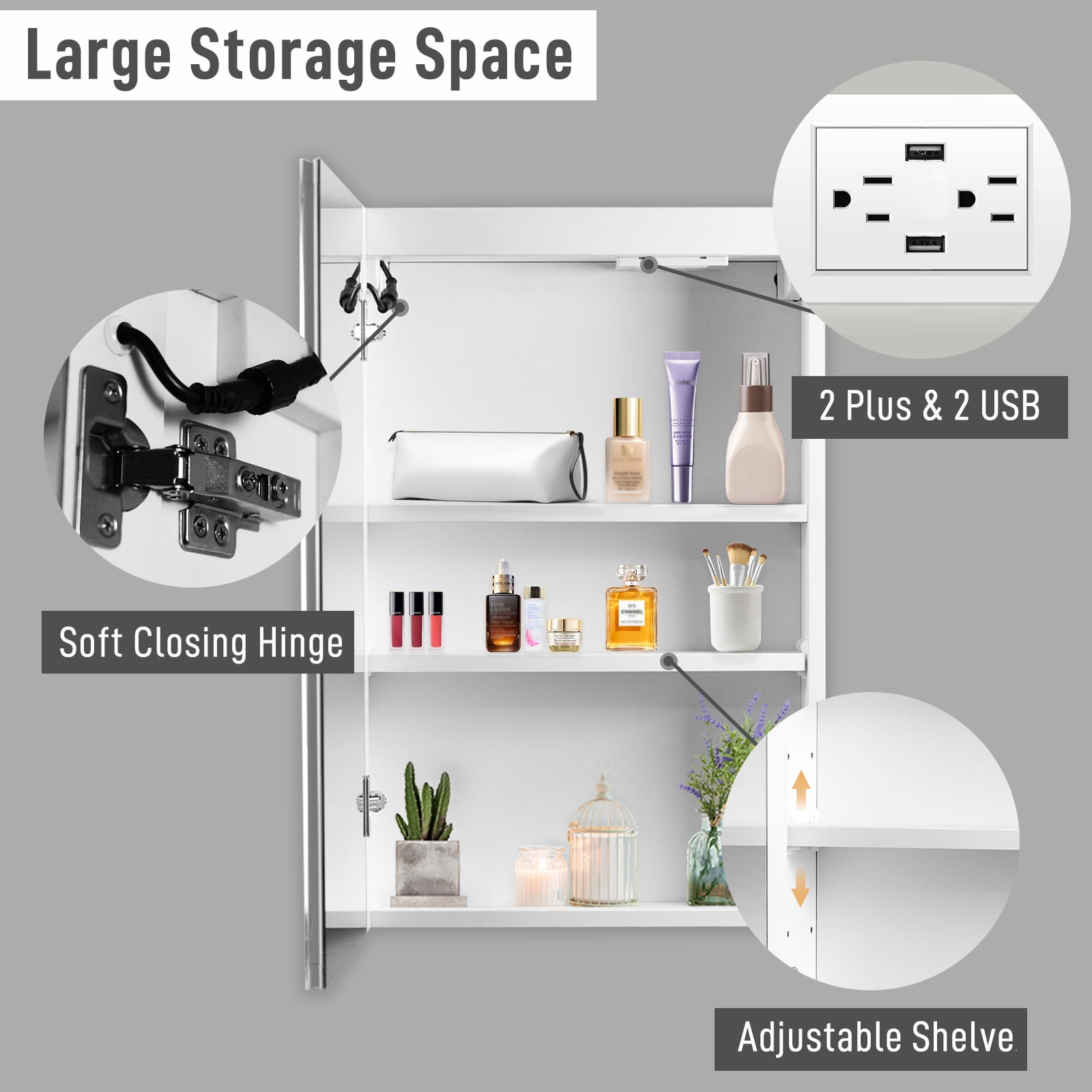 Soft touch switch makes this led medicine cabinet simple and easy to turn on/off, adjust brightness and change color temperature. Uilt-in defogger means fogless makeup time is just one touch away. Built-in 2 outlets and usbs for phone or shavers charging inside this bathroom mirror medicine cabinet. Smart memory function remembers your favorite setting, no need to adjust every time you turn on the mirror. Adds technology element and convenience to your bathroom.