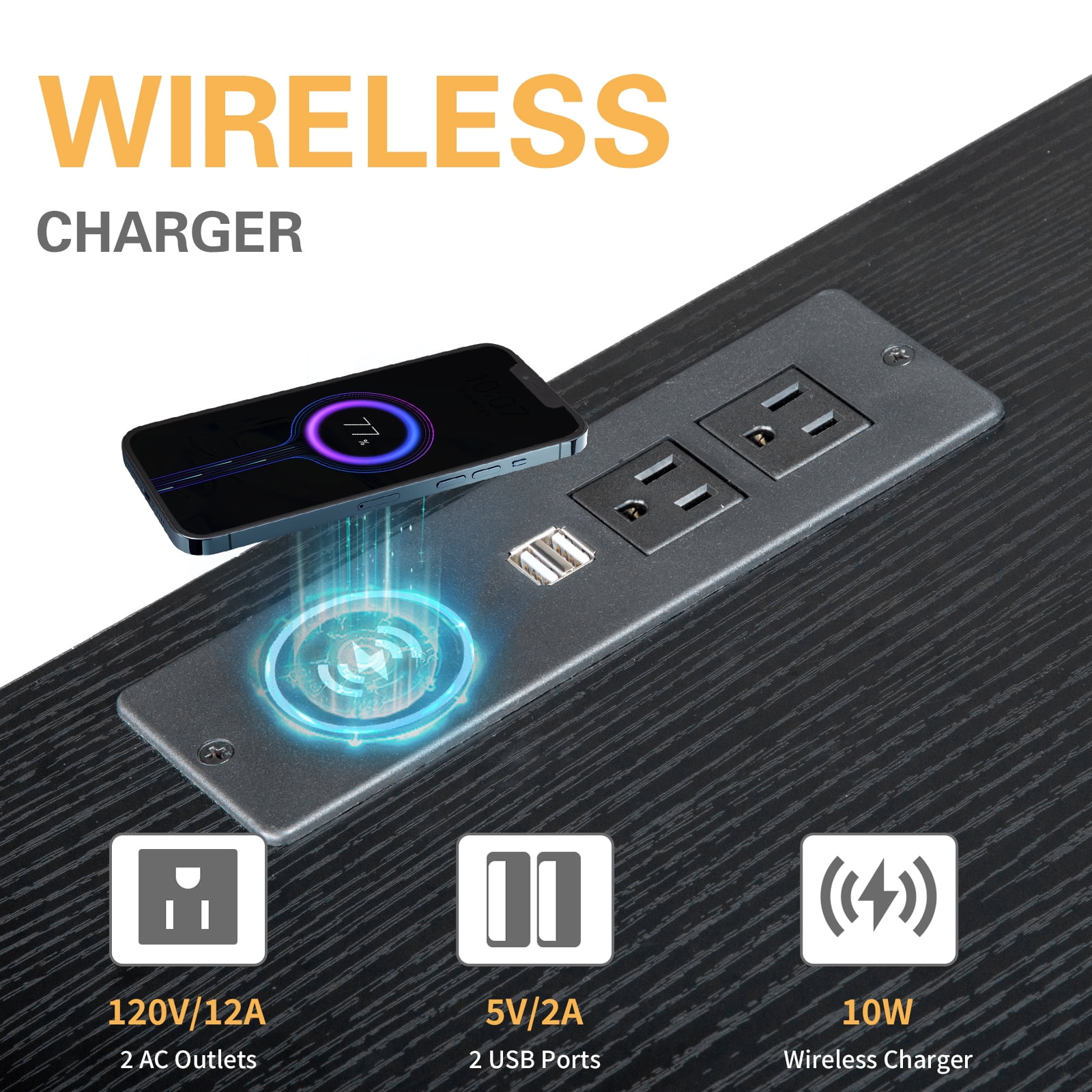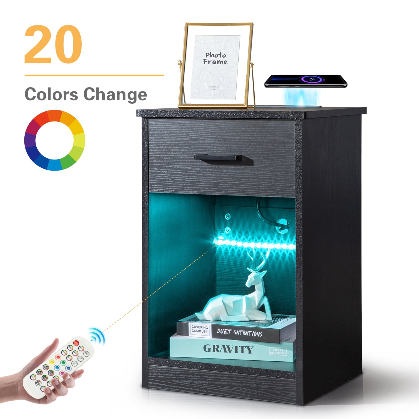 Introductions: Do you want to have a beautiful and practical night table? If so , you must not miss the Two-Tier Night Table Large Size. This LED nightstand is made of good quality MDF, durable and stable. It’s with three storage drawers and one open shelf, which provide sufficient storage options for customers. Its elegant appearance adds so much charm to the bedroom.Our charging station includes a wireless charger,2-AC Outlets & 2 USB Ports. It allows you to charge mobile devices such as cell phones, tablets, mini fans, etc.Very convenient and fun.The LED strip can be controlled by both manual key and phone app, you can customize the color that you want, and also can choose the mode according to the scenes, which makes life more interesting.What are you still waiting for? Features: ãNightstand with Multifunctional LED Light Stripsã-The bedside nightstand comes with beautiful Multi-colour RGB LED Light, Phone App + Button Switch multiple control modes. You can freely set the brightness,color,mode and timing function,and design your light show to your heart’s content. with LED Lights Nightstand Makes Your Life Smarterï¼more suitable for your needs. ãPower Strip with Wireless Chargingã-The nightstand is arranged with 2 Outlets & 2 USB Ports& Wireless Charging,In order to make charging easier, we have added the wireless charging function, the mobile phone can be stably charged by gently placing it on it, intelligently identify the charging device, and take care of the mobile phone battery to provide you with better and safer charging experience. ãDrawers Storageã-The bedside table has drawer for sliding storage, The sliding drawer is perfect for private, the open space in the middle is convenient for daily use. Plenty of storage space Great for living room, bedroom, home office. ãDurble & Stableã-Made of premium high-quality MDF wood and exquisite workmanship make this bedside table sturdy and durable, not afraid of long-term use. ãMultifunctionãThis end table can be placed in any of the place. Therefore, this side table can become a bedside table, end table, sofa side table, nightstands, coffee table and so on. The space-saving design and neutral color will blend well with any furniture whether it is as a bedside table or as a sofa table in your living room. Specifications: Material: Wood Color: Black Dimensions:(15 x 13 x 23.62)” (L x W x H) Package Includes: 1 x Night Table