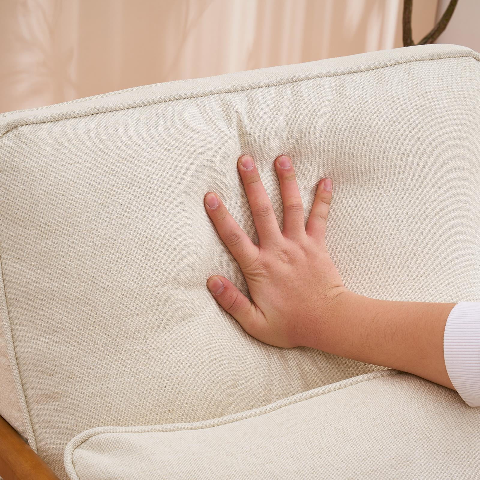 The fabric material is Line fabric,the advantages of linen fabric is breathable and dry This mid-century accent chair with back and seat cushion can provides ample seating when sit in. And a back pillow will come with the item. The design of the chair is ergonomic compliance, the back leans a little back to help you lean back in your chair. The solid wood frame are strong and durable, weight Capacity is up to 500 lbs. Suitable for your living room, study, bedroom and other leisure areas