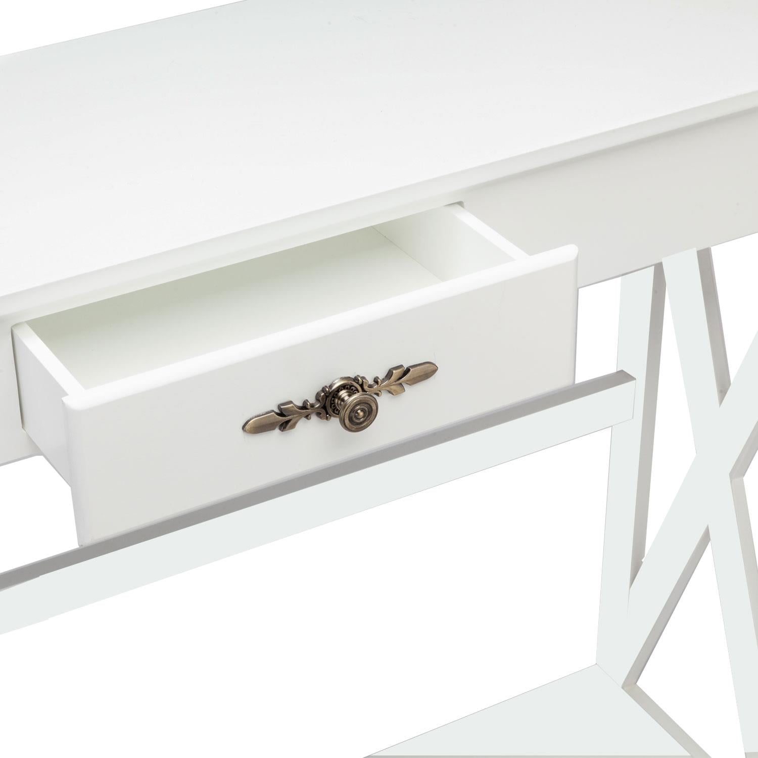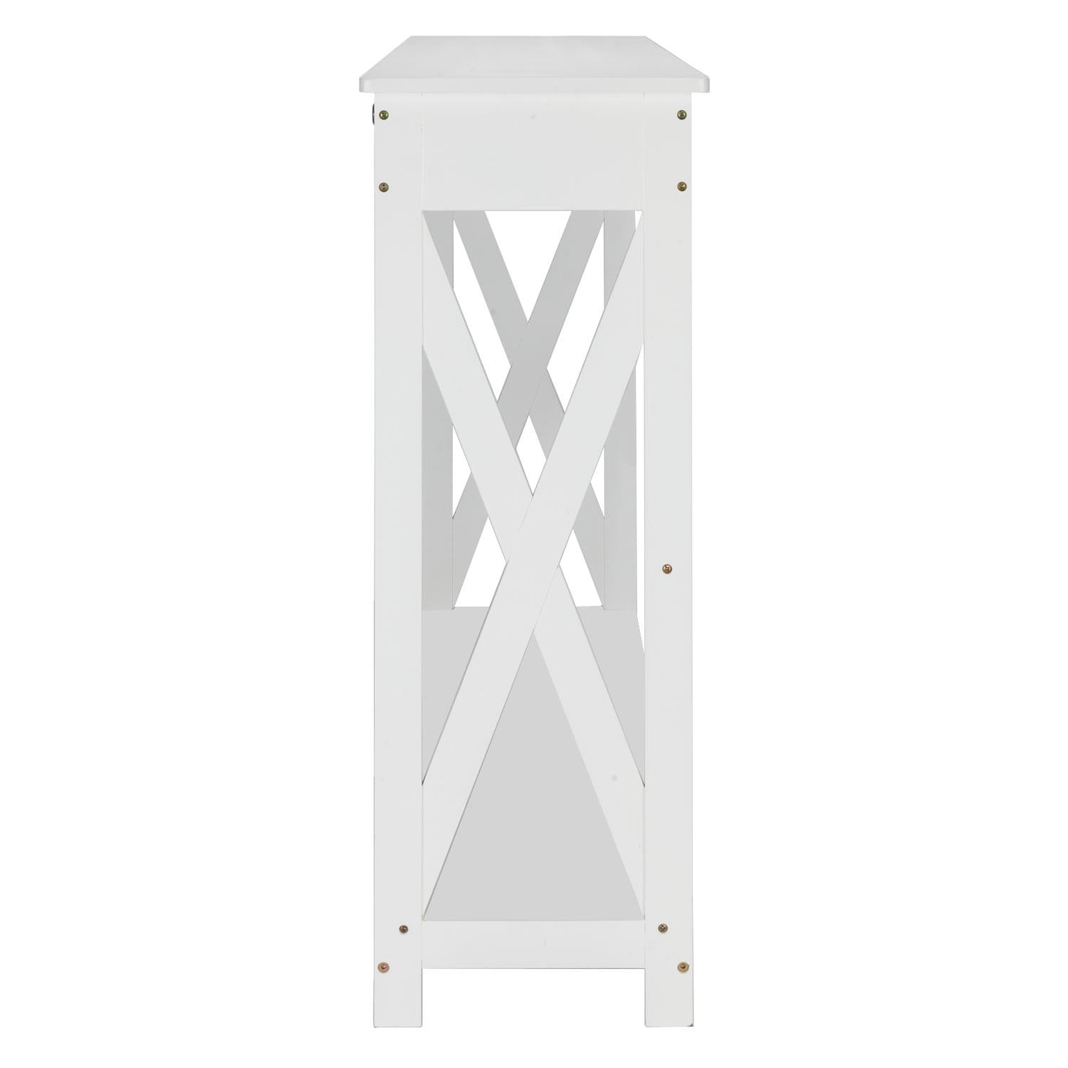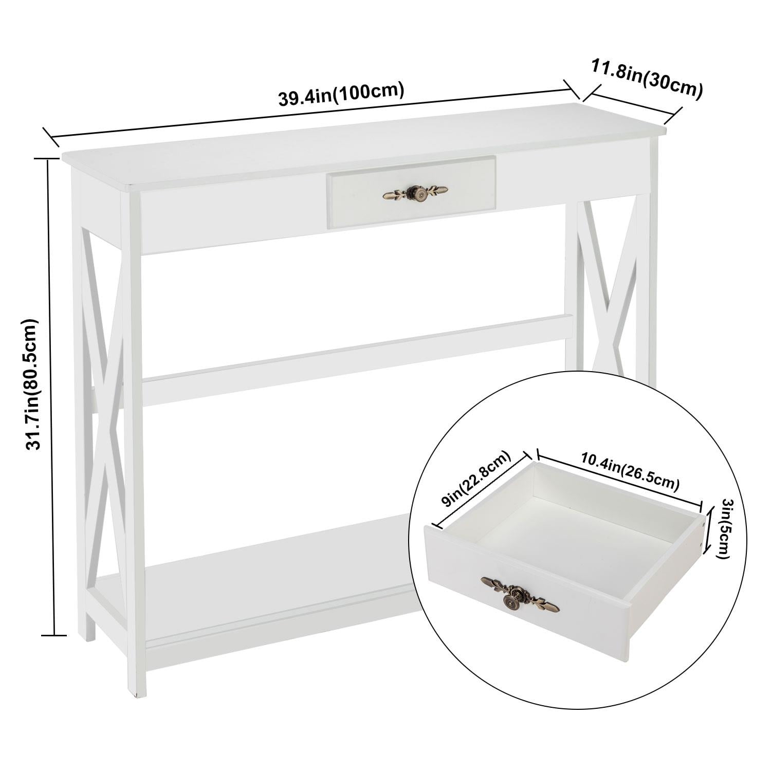 【VERSATILE TABLE】Works great as a console table for your living room, sofa table placed behind the couch, or entry table in entry way, front hall, foyer, etc. Contemporary design making it a great addition to your home 【LARGE STORAGE CAPACITY】Features spacious tabletop and one shelf on the bottom for display and storage. The middle drawer with vintage handle is designed both for extra storage and attractive in appearance 【STYLISH DESIGN】Made of premium P2 MDF with white finish, this stylish & simple console table complements any Décor and walls in your house. Crossed side and an extra horizontal bar behind for added stability 【A BREEZE TO PUT TOGETHER】Easy to assemble. Upon assembly, measures 39.4-Inch Wide, 11.8-Inch Deep and 31.8-Inch High. Drawer Size: 10.5”W x 9”D x 3”H. After-sale Service – Since the satisfaction of customer is always our primary concern,so if you have any problem when using this product,please feel free to contact us via email,we’re always happy to help!