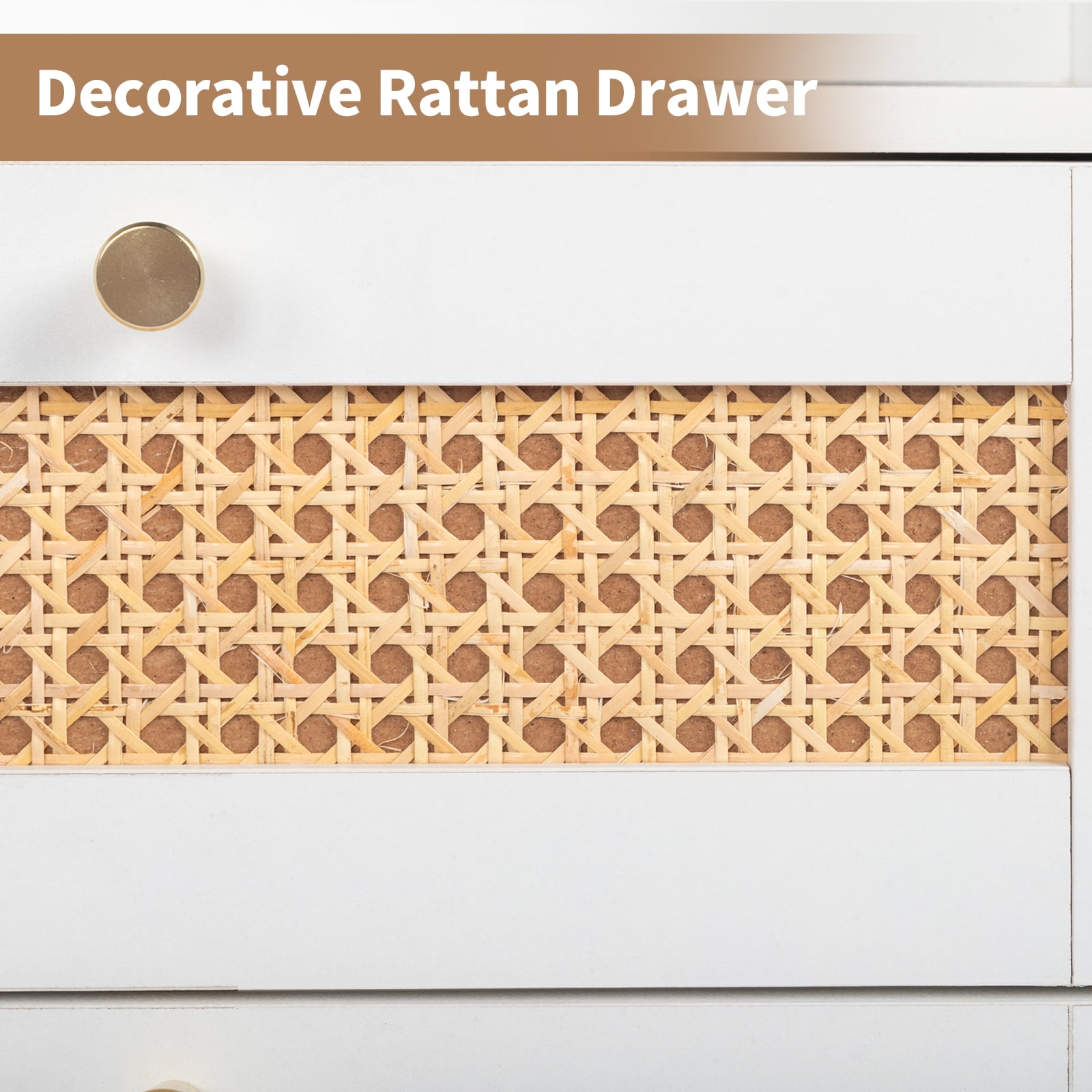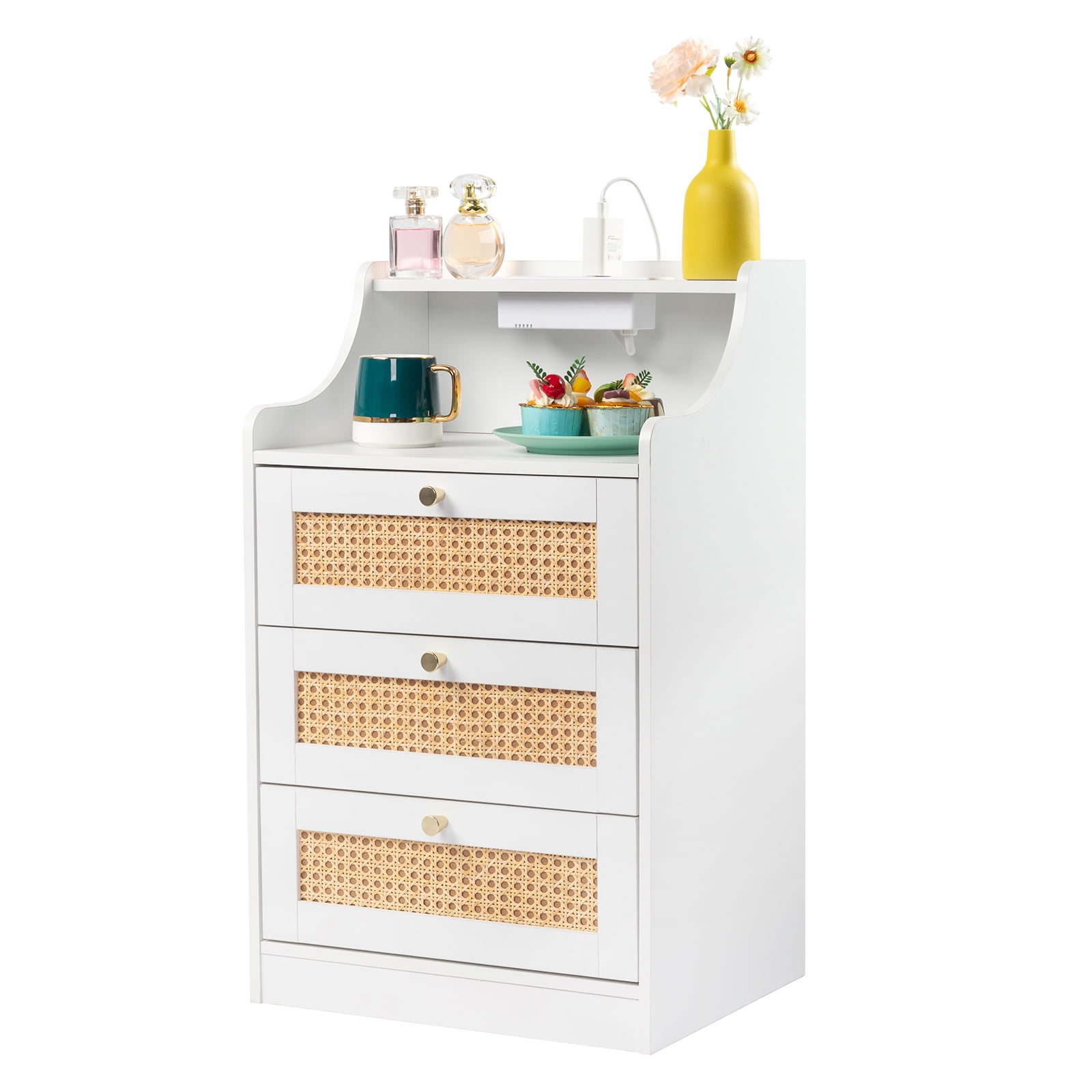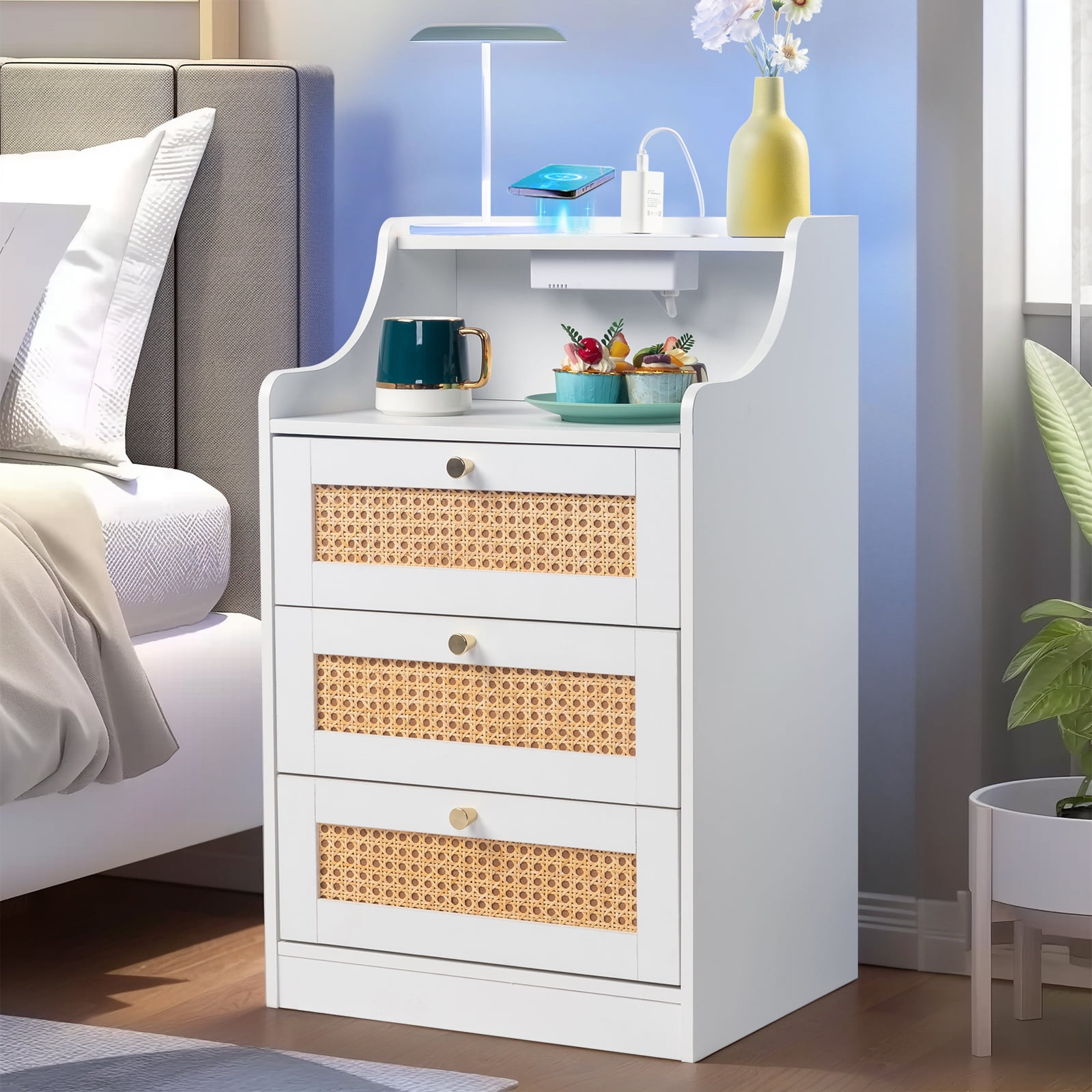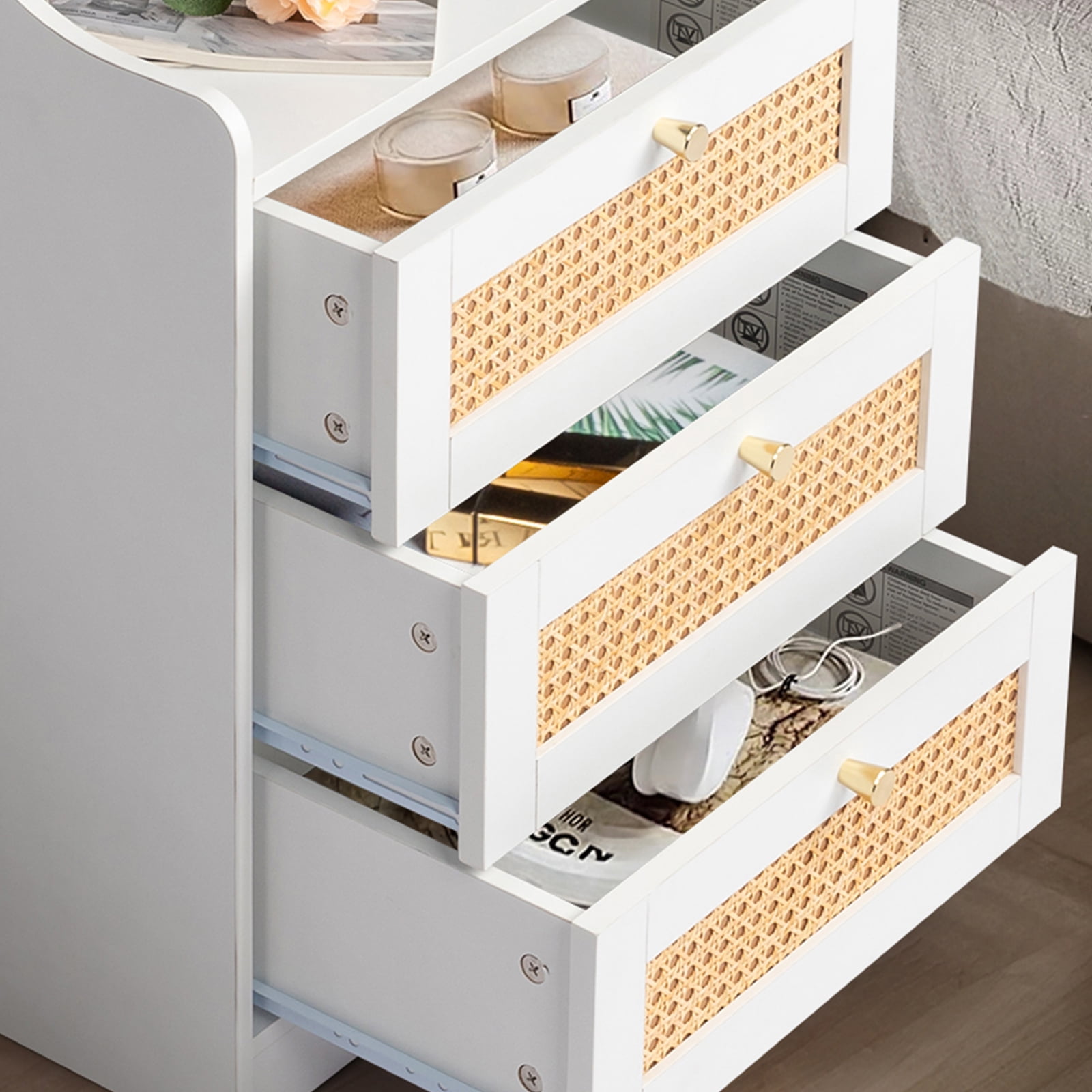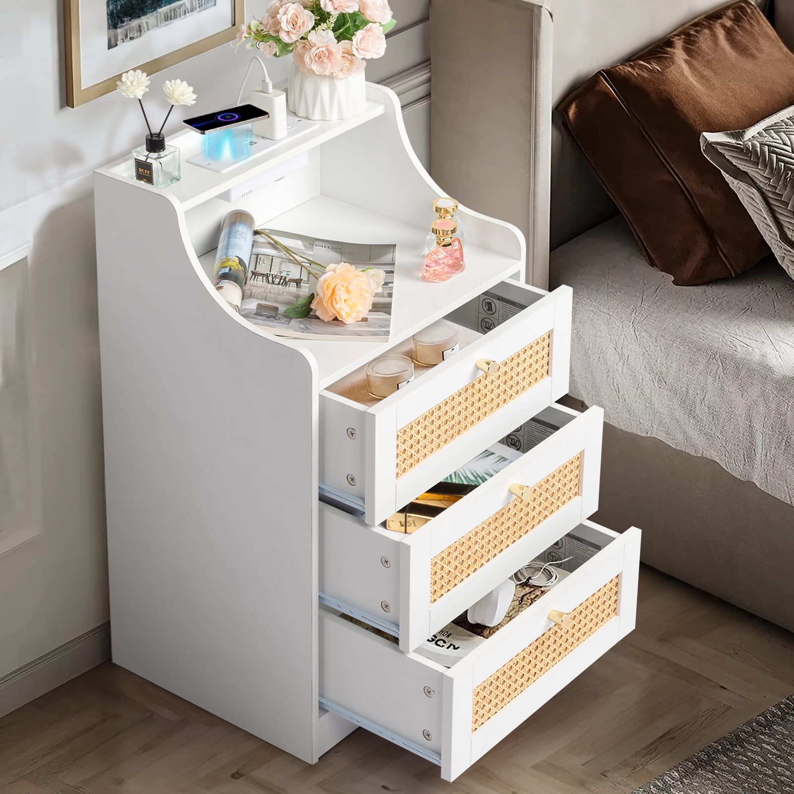 Wireless Convenience at Your Bedside Experience seamless device charging with our nightstand featuring integrated wireless charging, complemented by 2 standard plugs and 2 USB ports, ensuring all your devices stay powered through the night. Spacious Storage Solutions Our nightstand offers 3 drawers, providing ample space for storing essentials, making it the perfect addition to any bedside table setup. Extended Surface Area with Hutch Design Designed to maximize utility, this nightstand includes an extra hutch, expanding the tabletop area for additional items like a lamp or decorative objects, enhancing its functionality beyond that of a conventional night table. Versatile Placement Options Not just a night stand, this piece can double as an end table in your living room or serve as a simple storage cabinet in any space, offering flexibility in its application beyond the bedroom. Durable Metal Accents Featuring robust metal handles and drawer slides, our side table ensures smooth operation and durability, adding a modern industrial flair to your home decor. Aesthetic Rattan Drawer Faces The coffee table-inspired design is elevated by the inclusion of woven rattan drawer fronts, which add a layer of texture and visual interest to your room, blending seamlessly with various interior styles.