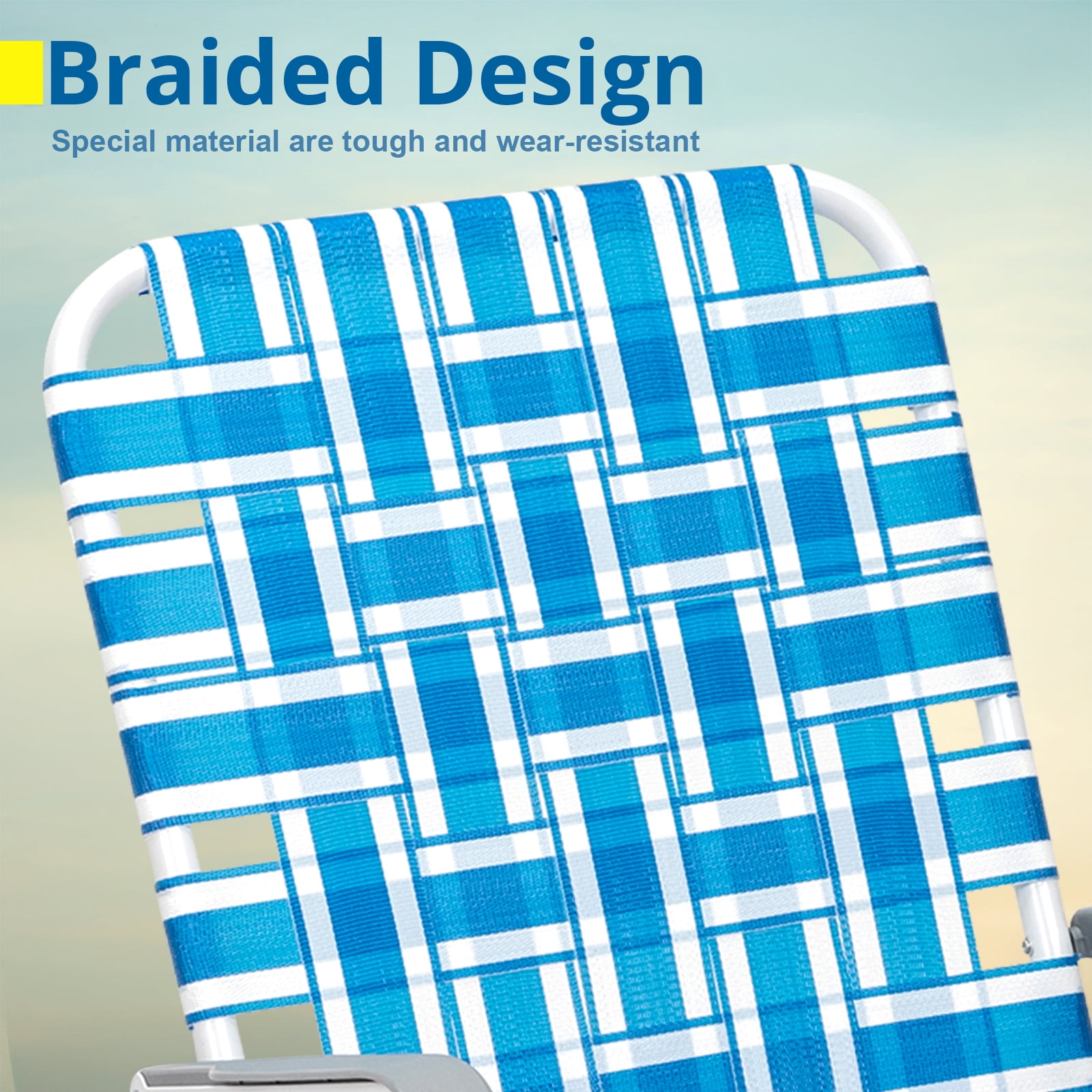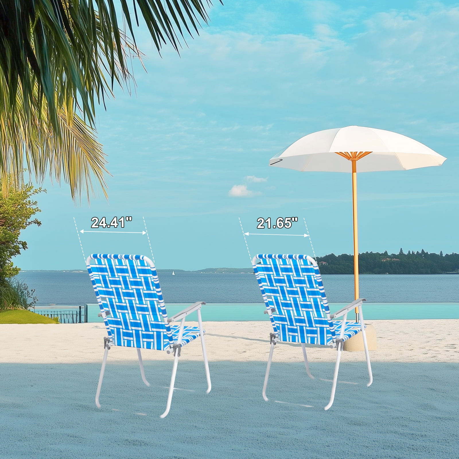 Features: UPGRADED COMFORT: Built with durable and breathable web, the camp chair is comfortable enough to use in every season. Updated higher backrest gives you more support when you lean back STABLE CONSTRUCTION: metal pipes add strength and durability to the folding lawn chairs. pads are used to protect the floor and prevent slip on the poolside PORTABLE&LIGHTWEIGHT: The compact folding design is convenient for storage and transportation. The weight of the patio lounge chair is 9 lbs, making it easy to carry and move Versatile: Whether indoor or outdoor, it always shows you good performance as a set of patio lawn chairs. You can unfold it in your garden or take it to outing, camping, or picnic. Foldable and Portable: As compact home furniture, its foldable design allows you can fold or unfold it easily to fit different space needs. In folding status, it can be taken away anywhere effortlessly. Strudy: Constructed with a metal frame and PE webbing, these patio lawn chairs could support up to 260 weights without shaking. No Assemble Required: Item comes with folding status, you can easily unfold it in a short time. If you have any questions regarding our product quality or any problem during use, please do not hesitate to contact us. Specifications: 1. Material: PP Braided Belt Steel Pipe 2. Style: Folded 3. Color: Blue 4. Folding Size: (22 x 2.8 x 34.5)” / (55.88 x 7.11 x 87.63)cm(L x W x H) 5. Expansion Size: (22 x 22 x 37.4)” / (55.88 x 55.88 x 95)cm(L x W x H) 6. Weight: 7.72lbs / 3.5kg 7. Chair Height: 17.7″ 8. Chair Depth: 16.5″ Package includes: 2 x Beach Chair