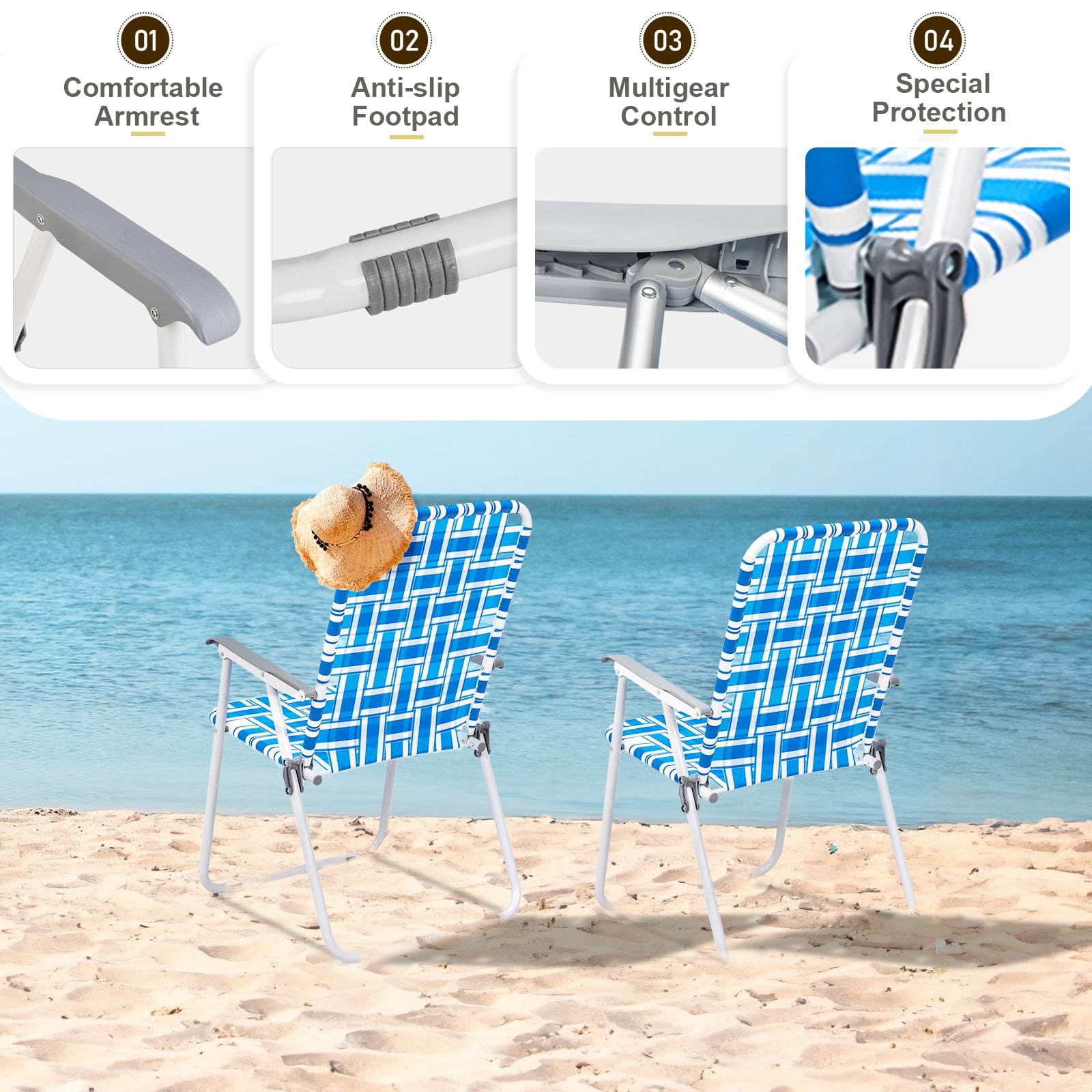Ktaxon 2Pcs Patio Folding Web Lawn Chair Set, Outdoor Beach Chair, Portable Seating for Camping Picnic Party Commercial, Light Blue