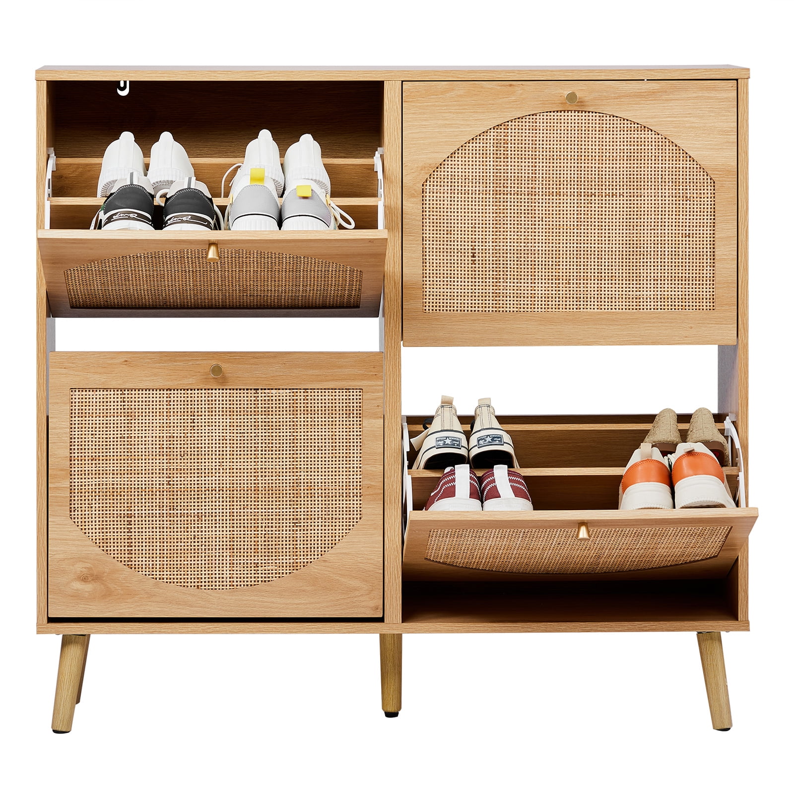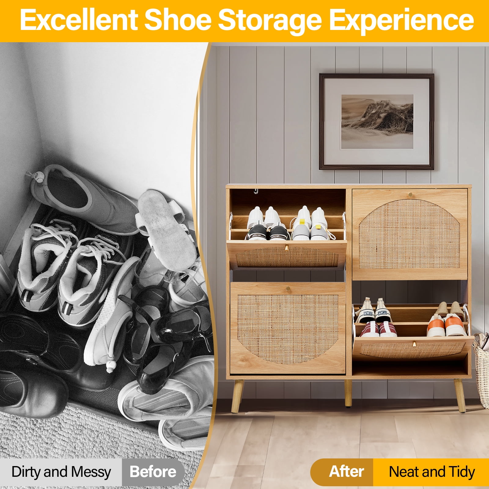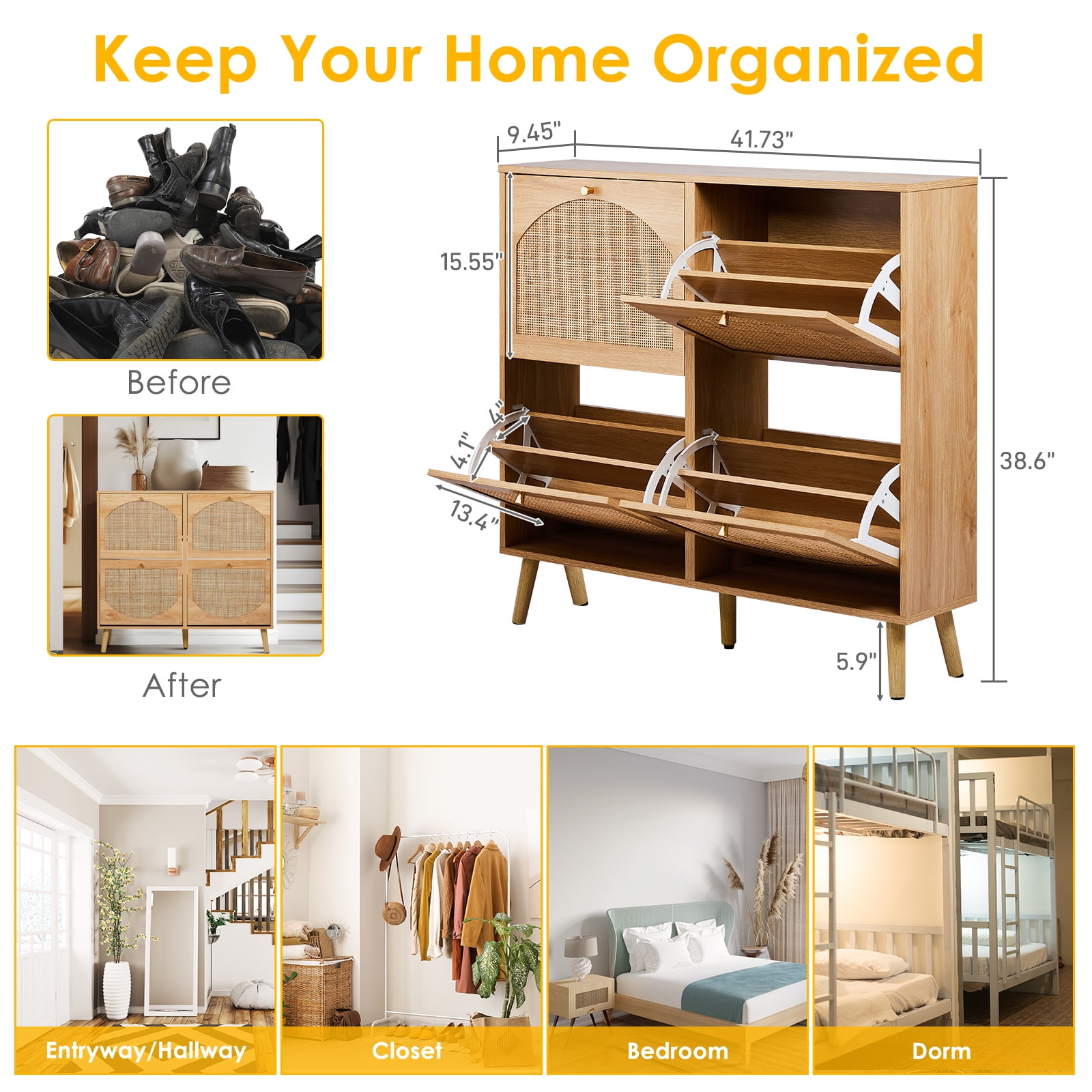 Introduction: If you are still looking for a powerful storage function and space-saving shoe cabinet, then don’t miss this rattan design 4-fold drawer shoe storage. Each drawer cabinet has 2 layers of shoe racks, and the entire 8-layer shoe cabinet can store at least 24 pairs of adult shoes, meeting the shoe storage needs of a family, and no longer have to worry about the mess of shoes. Features: 4 flip drawer shoe cabinet 8 layers of storage space Store at least 24 pairs of adult shoes and boots Rattan shoe rack shoe cabinet storage cabinet 4 flip drawers provide ample shoe storage space 9.5 inches deep The shoe cabinet can also fit in narrow hallways The modern design of the shoe cabinet will blend perfectly with modern and traditional decors You can put keys, wallets, etc. on the top of the cabinet for easy access ● WARM PROMPT: Please confirm the product size before purchasing, to make sure the size of our product is in line with your requirements! ● AFTER-SALE SERVICE: Since the satisfaction of customer is always our primary concern,so if you have any problem when using this product please don’t hesitate to contact us first! Specifications: Color: Natural Material / Finish: MDF / Rattan Dimensions: W41.4 x D9.5 x H38.6 in Load capacity: 120 lbs Package Includes: 1x Shoe Cabinet 1x Accessory Bag 1x Instruction