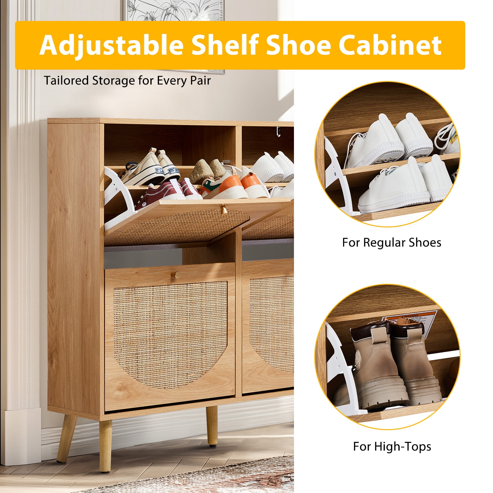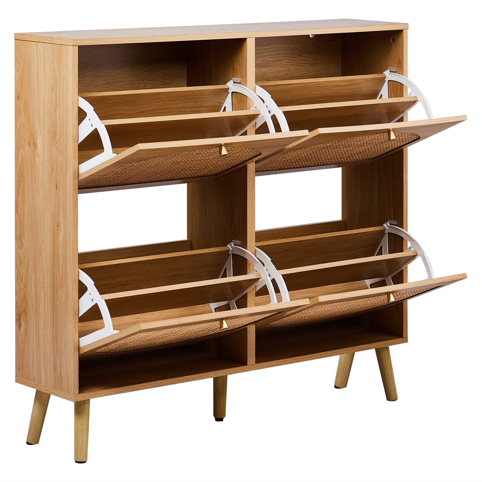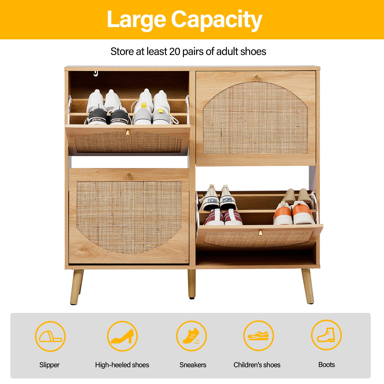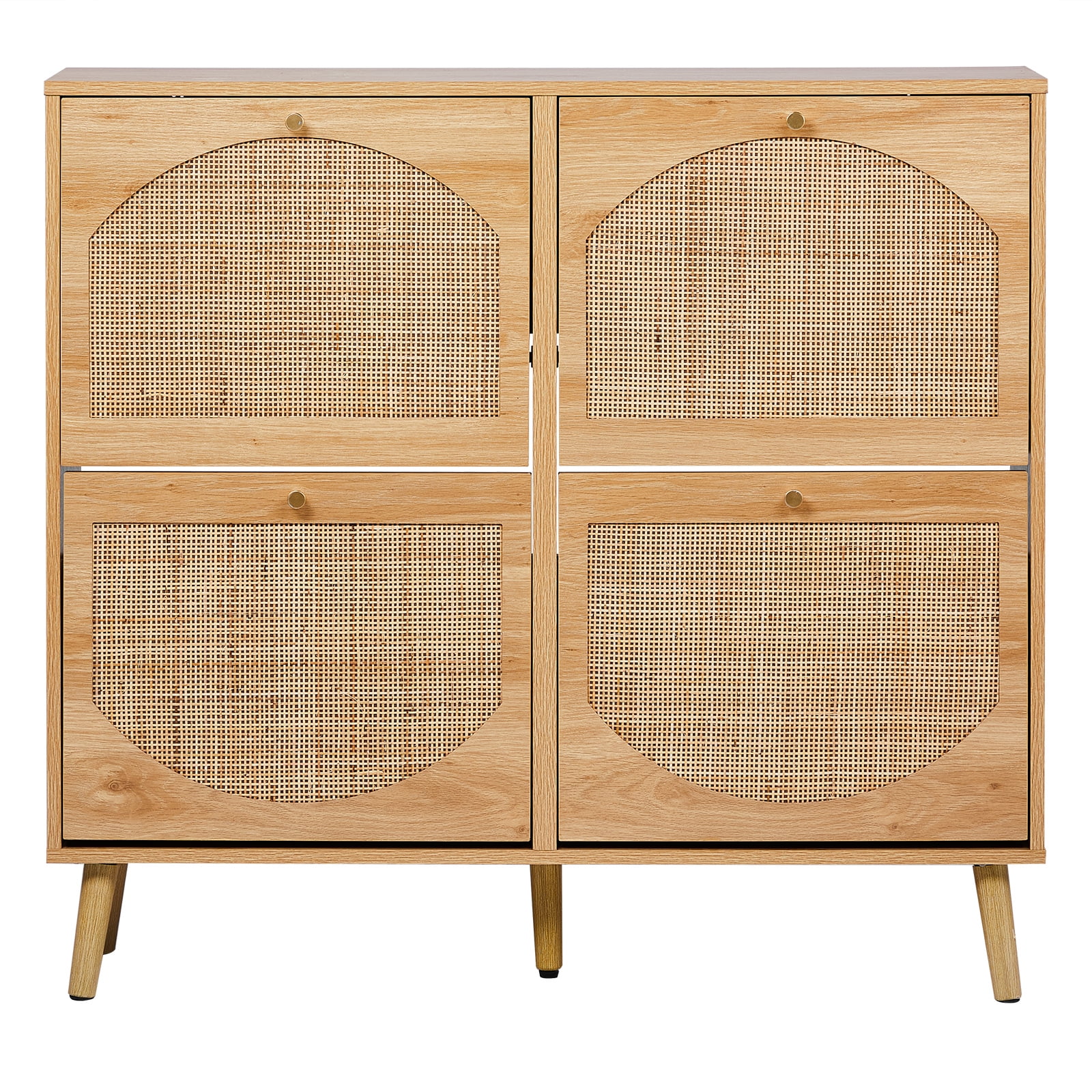 Introduction: If you are still looking for a powerful storage function and space-saving shoe cabinet, then don’t miss this rattan design 4-fold drawer shoe storage. Each drawer cabinet has 2 layers of shoe racks, and the entire 8-layer shoe cabinet can store at least 24 pairs of adult shoes, meeting the shoe storage needs of a family, and no longer have to worry about the mess of shoes. Features: 4 flip drawer shoe cabinet 8 layers of storage space Store at least 24 pairs of adult shoes and boots Rattan shoe rack shoe cabinet storage cabinet 4 flip drawers provide ample shoe storage space 9.5 inches deep The shoe cabinet can also fit in narrow hallways The modern design of the shoe cabinet will blend perfectly with modern and traditional decors You can put keys, wallets, etc. on the top of the cabinet for easy access ● WARM PROMPT: Please confirm the product size before purchasing, to make sure the size of our product is in line with your requirements! ● AFTER-SALE SERVICE: Since the satisfaction of customer is always our primary concern,so if you have any problem when using this product please don’t hesitate to contact us first! Specifications: Color: Natural Material / Finish: MDF / Rattan Dimensions: W41.4 x D9.5 x H38.6 in Load capacity: 120 lbs Package Includes: 1x Shoe Cabinet 1x Accessory Bag 1x Instruction