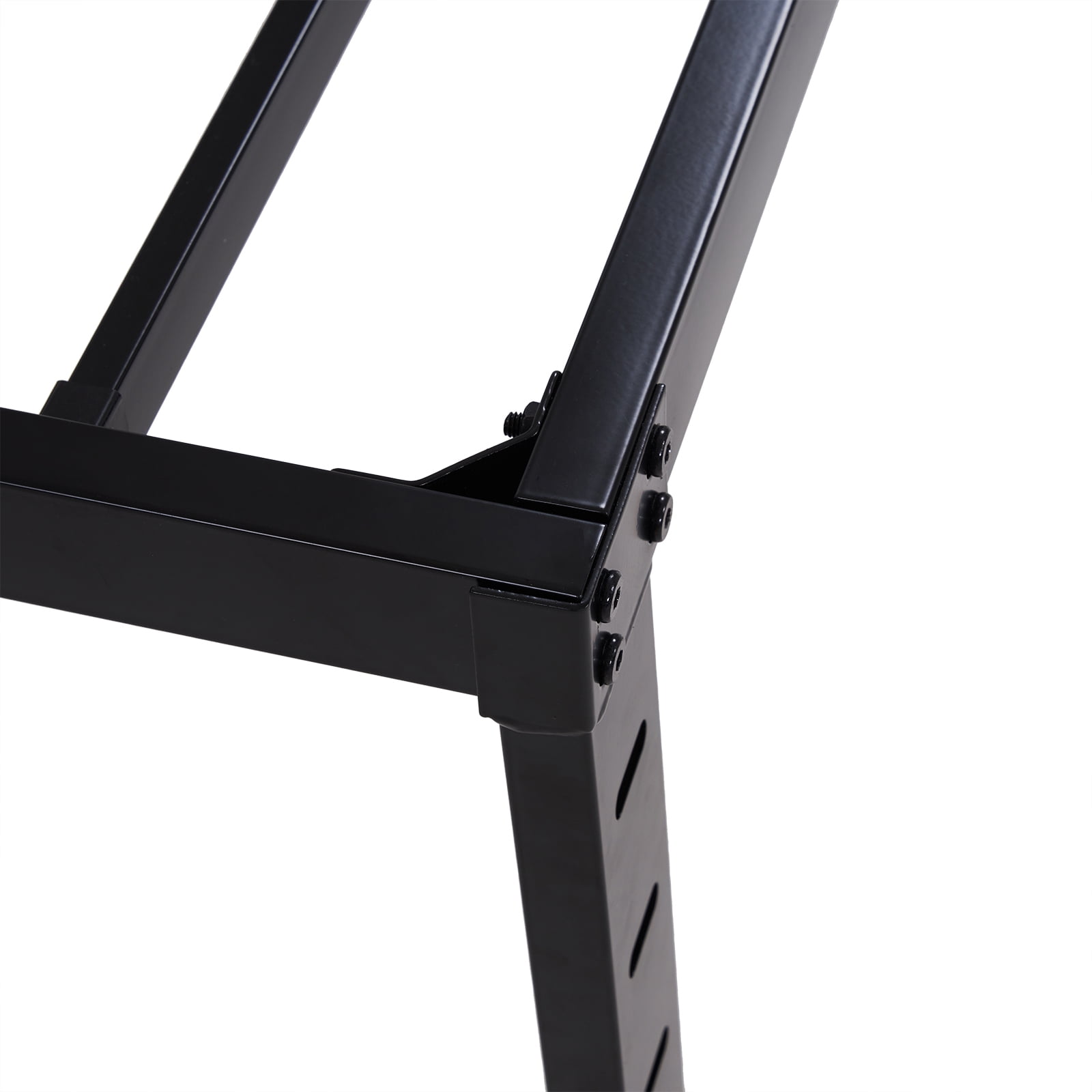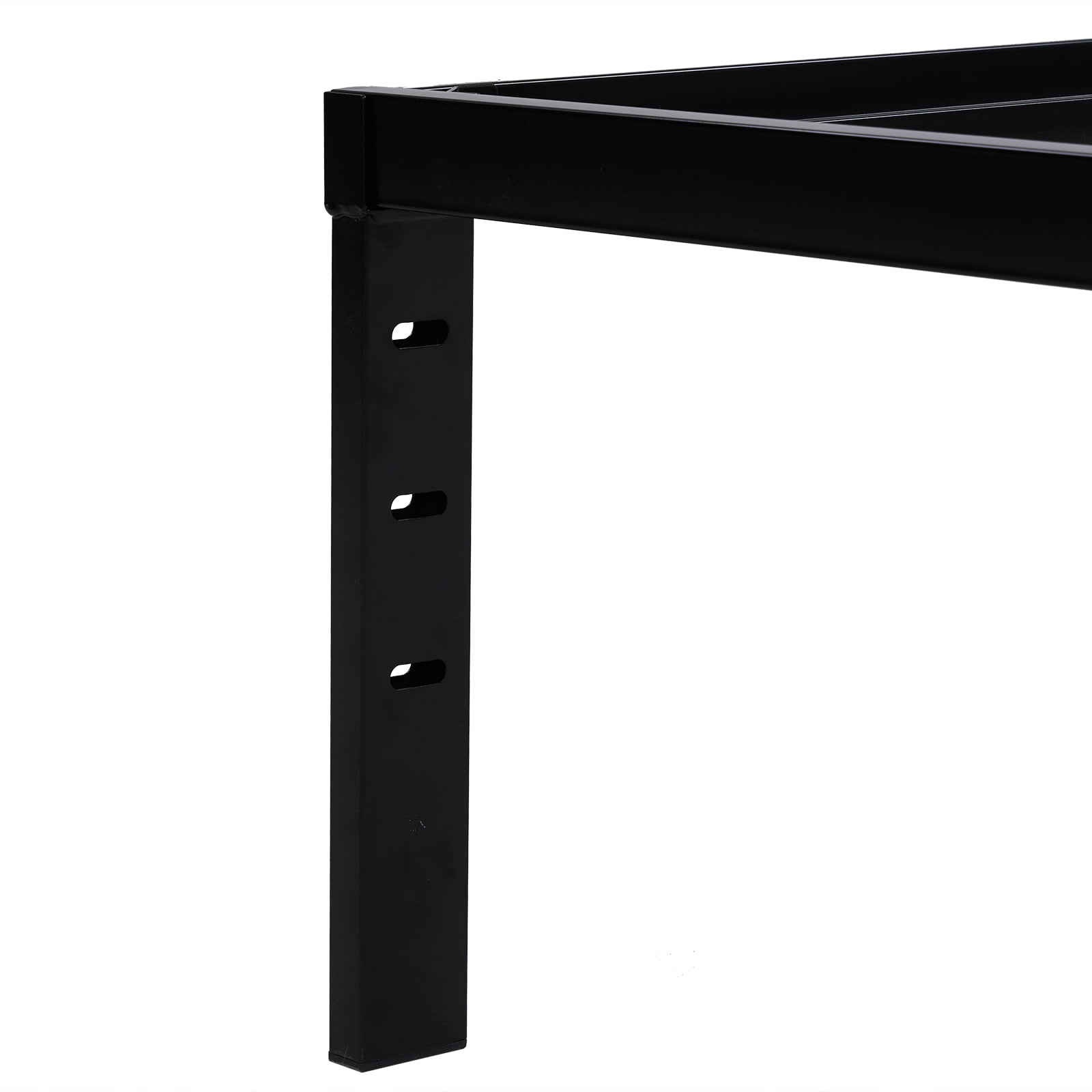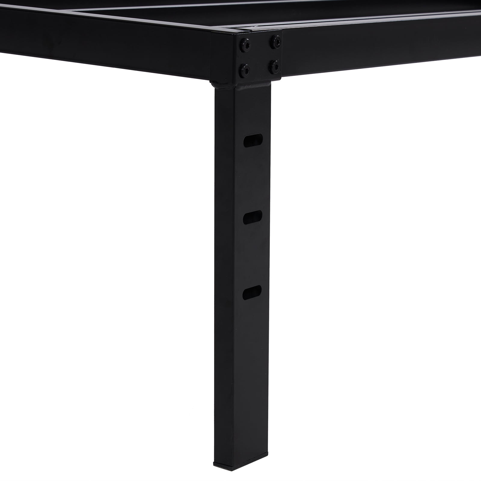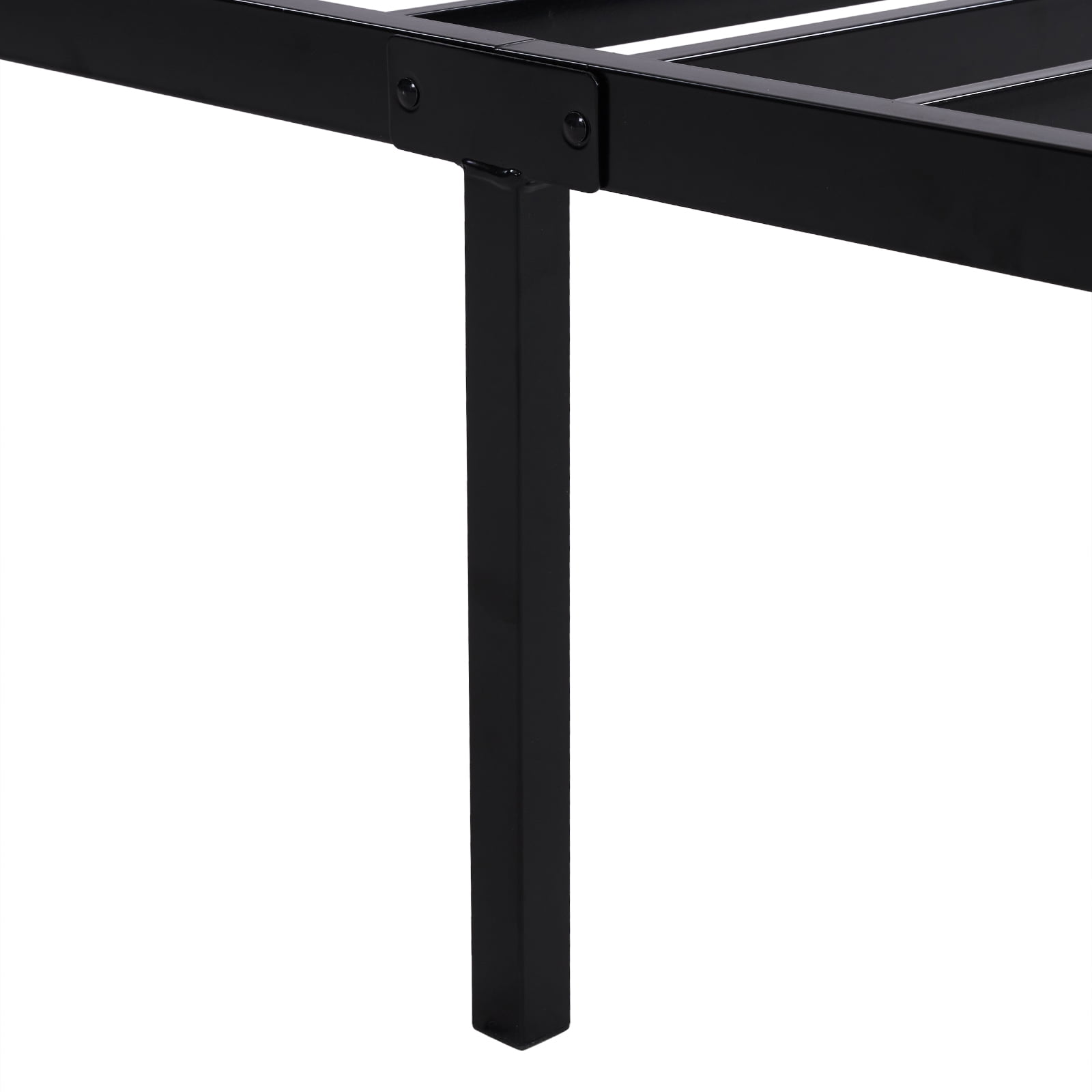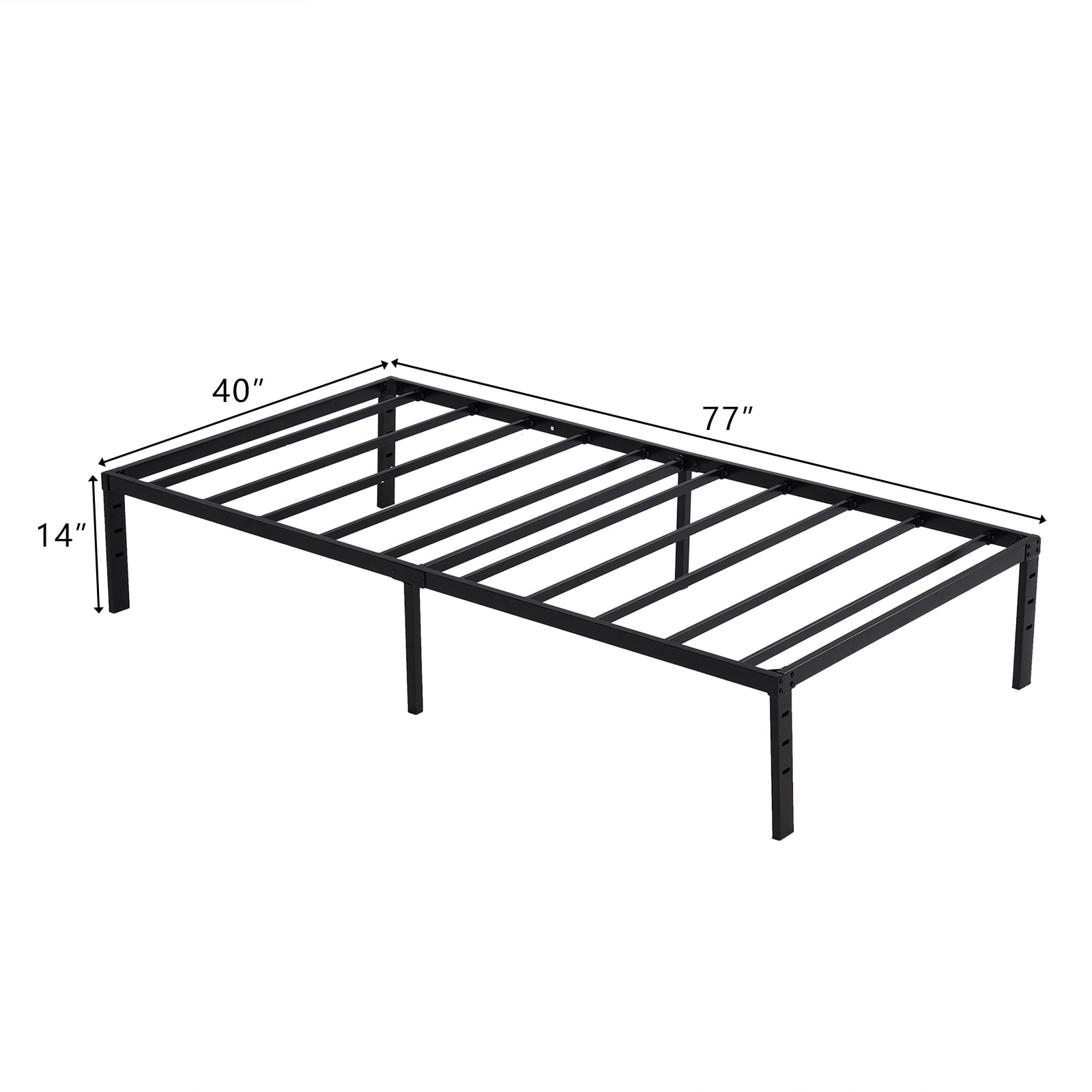 Features: 1. Sturdy and Durable: Crafted with an ultra-durable metal structure, this bed frame is built to last. Its solid construction ensures stability and support for a comfortable night’s sleep. 2. 12.9 Inches of Clearance: Make the most out of your bedroom space by utilizing the 12.9 inches of clearance under the frame. Store clothes, toys, or extra bedding in convenient storage boxes, creating an organized and spacious environment. 3. No Box Spring Needed: Bid farewell to the hassle and expense of a box spring. The metal foundation of this platform bed frame offers excellent support for memory foam, spring, and hybrid mattresses, providing optimal comfort. 4. 450lb Weight Capacity: This robust bed frame is capable of supporting up to 450lbs, making it suitable for a variety of mattress sizes. It ensures structural integrity, preventing unwanted denting and sagging for prolonged mattress durability. 5. Holes for Headboard/Footboard: Effortlessly attach your preferred headboard or footboard with the reserved holes on the legs. Designed for easy assembly within 15 minutes, all necessary hardware and tools are included in the package. Specifications: – Size: Twin – Color: Black – Dimensions:(77x40x14)”(LxWxH) – Material: High-quality metal – Weight Capacity: Supports up to 450 lbs – Assembly: Easy to assemble Package Includes: 1 bed frameļ¼Mattress not included)