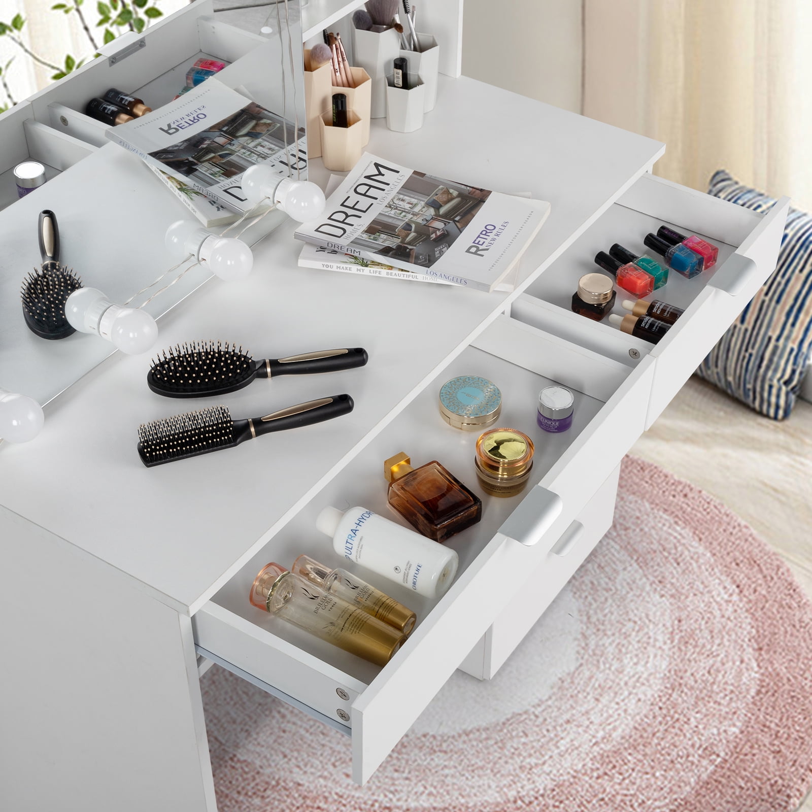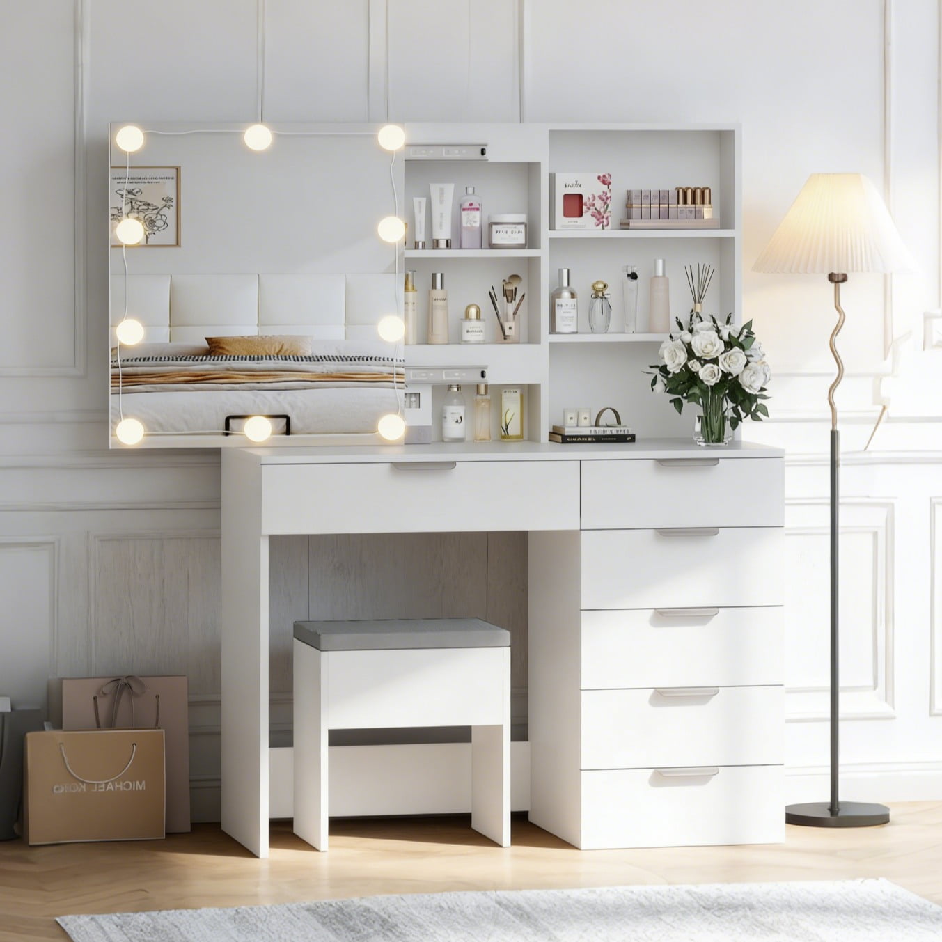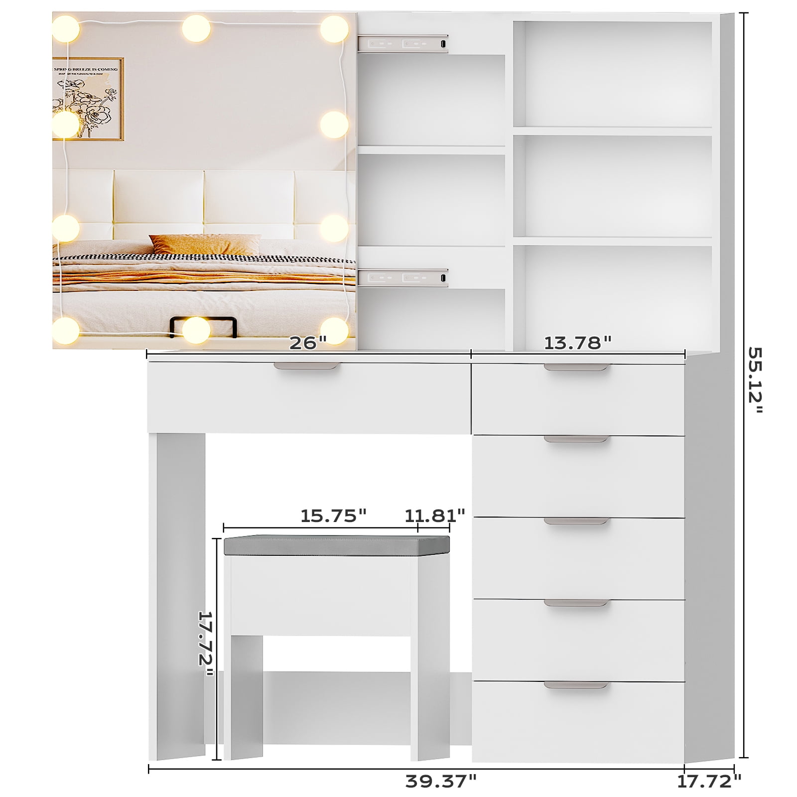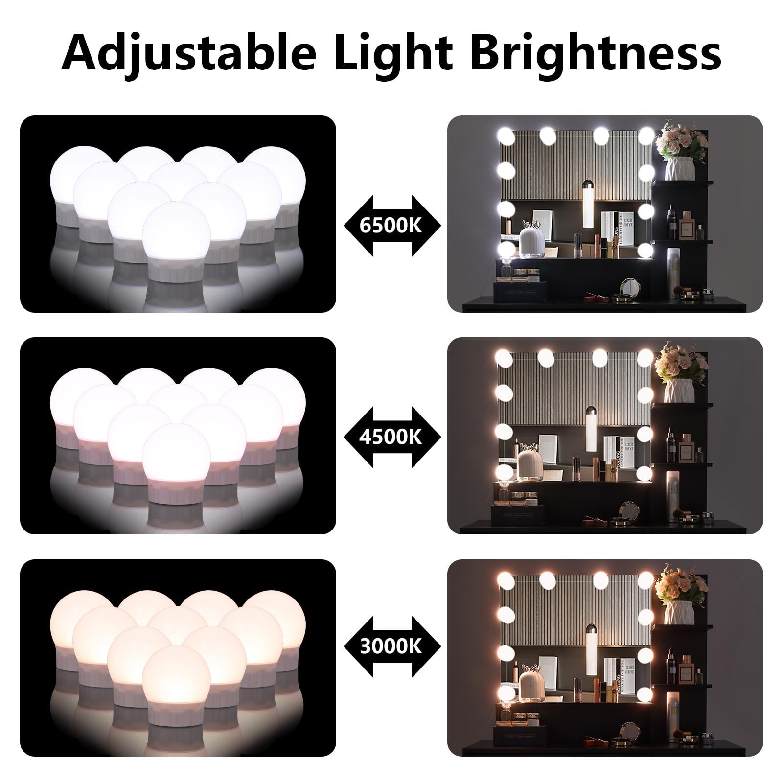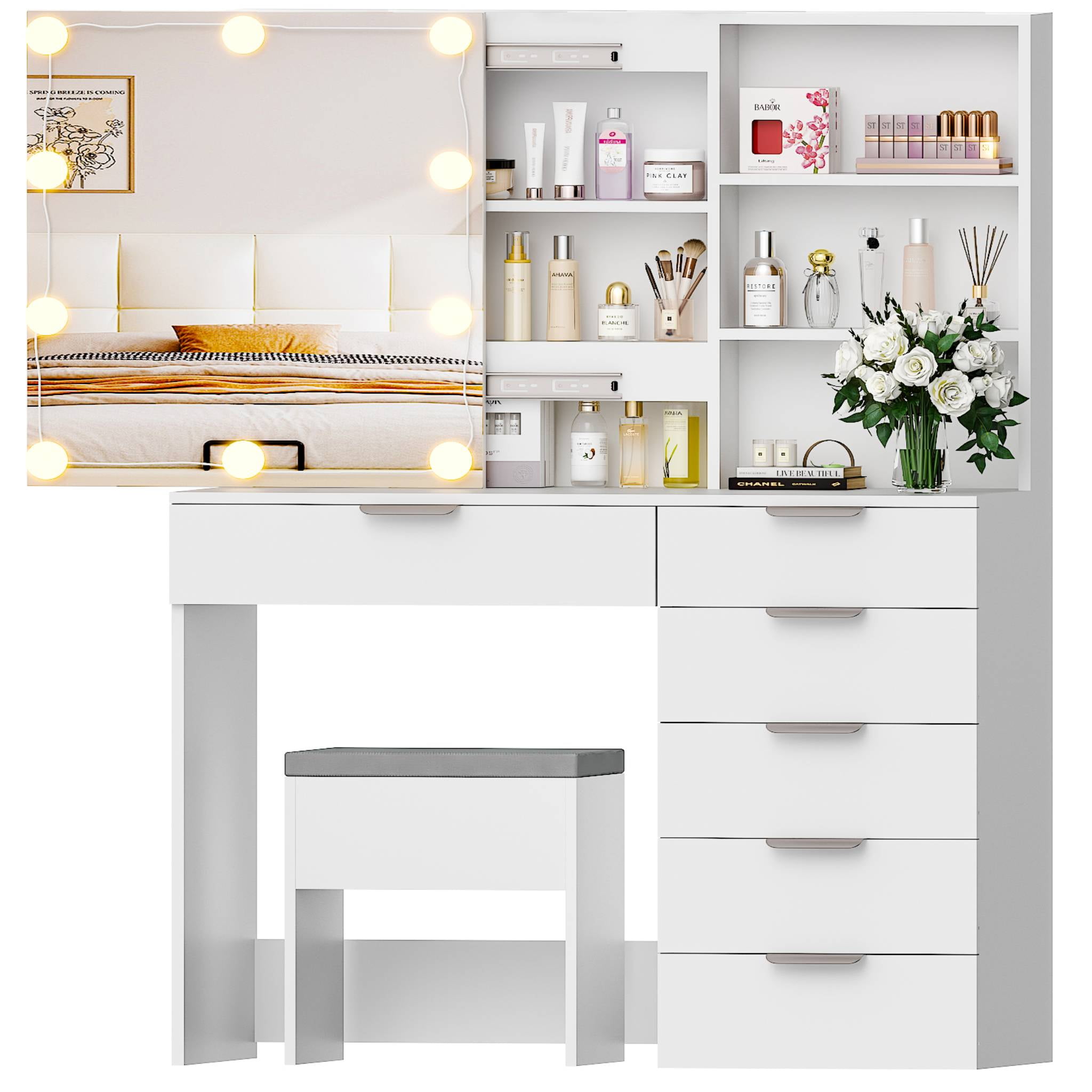 Large storage space:storage shelves,6 big drawer You can diy the location of the light Hide shelf creat a way to take your cosmetics and keep the all in organized. 10 bulbs with brightness adjustments satiate different makeup needs. Dresser with Slide Mirror