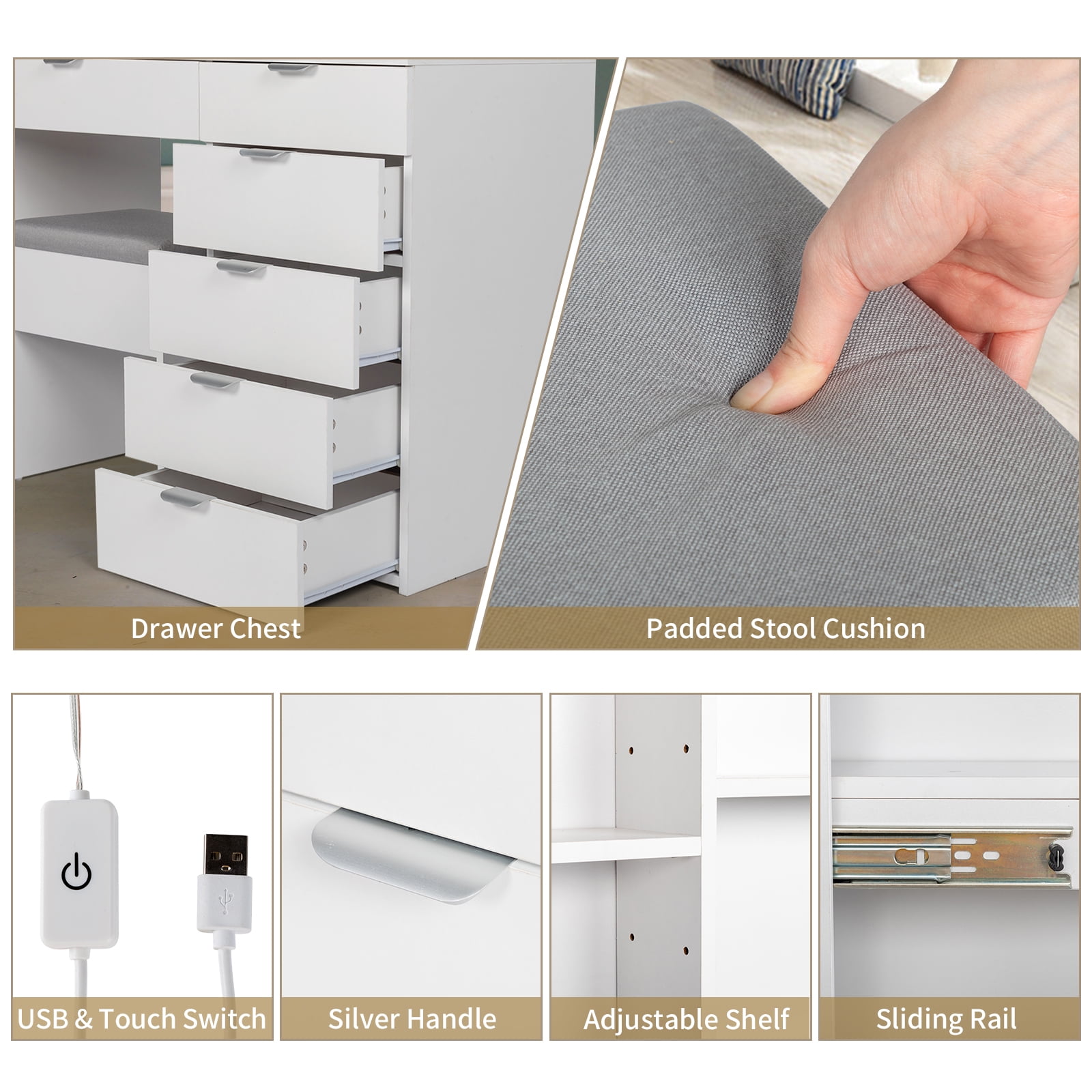 Introductions: This is a multi-functional dressing table. This model is made of high-quality plates, high-quality metal handles, and high-hardness installation accessories. The structure design of 6 drawers, 2 shelves and 1 mirror cabinet allows the storage of this product. The object space is greatly improved; 3 colors are adjustable, white light/warm white/warm light, which can be switched at will in different application scenarios. Features: 1.Gorgeous Hollywood style illuminated mirror – 10 LED bulbs on the mirror will illuminate evenly from all directions, helping you create the best look with your makeup. The color of the light is adjustable so you can get just the right lighting for you and your room. 2.Ample storage capacity – hide Shelves on table top are also a good place to showcase your picture frames, jewelry, flowers and more. Tiered storage in the cabinet makes items easy to find. 3.Higher level of craftsmanship and quality – Crafted from strong wood frame and top grade particle board, this makeup vanity with lights will serve you for years to come. 4.Stylish and functional – This vanity table has a versatile look that complements a wide variety of room decor. A large table top is ideal for keeping all your makeup, perfumes and trinkets within an arm’s reach. 5.Dresser with Slide Mirror – The mirror is designed as a sliding door, and the hidden storage compartment can be filled with cosmetics. Enough space for daily necessities to make your tabletop more clean and tidy. 6.The seats with sponge padding give you a more comfortable make-up and skin care experience. Specifications: Color: White 1. Overall Size: (39.4*17.7*55.1) Inches / (100*45*140)Cm(Length*Width*Height) 2. Dressing Table Size: (39.4*17.7*29.5)” / (100*45*75)Cm(Length*Width*Height) 3. Stool Size: (15.75*11.81*17.72)” / (40*30*45)Cm (Length*Width*Height) 4. Large Drawer Size: (20.9*11.2*2.2) Inches / (53*28.5*5.5) cm(Length*Width*Height) Small Drawer Size: (12.6*11*2.2) Inches / (32*28*5.5)(Length*Width*Height) Package Includes: 1 x Dresser 1 x Dressing Stool 1 x Accessories Package 1 x Installation Manual