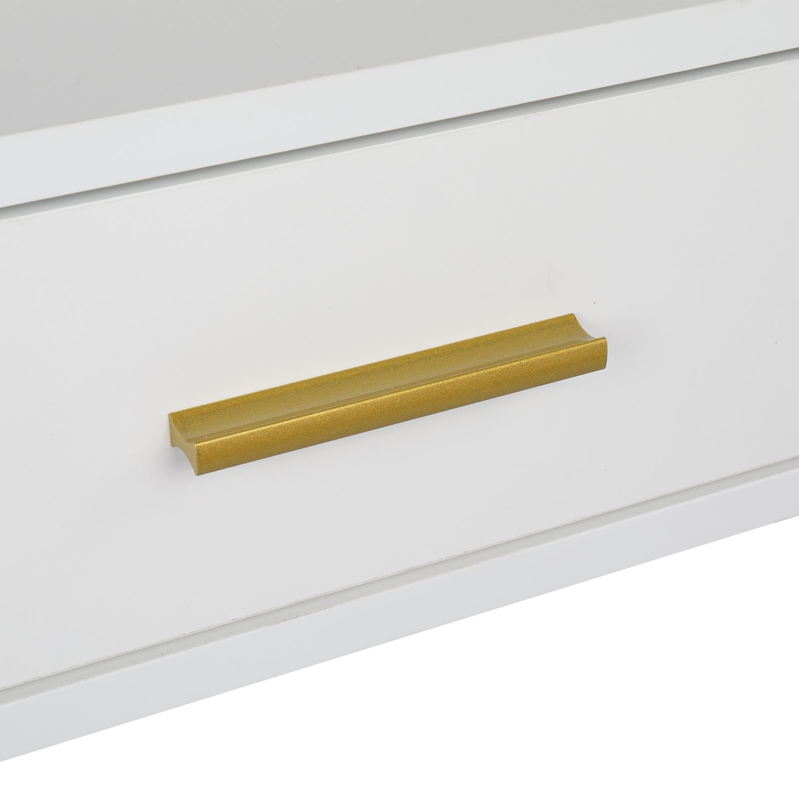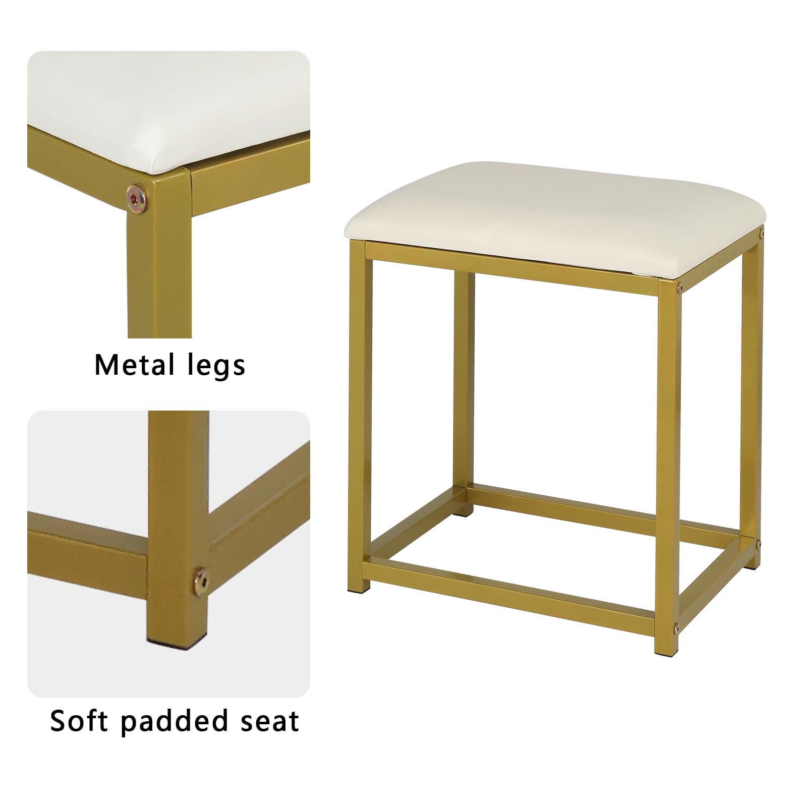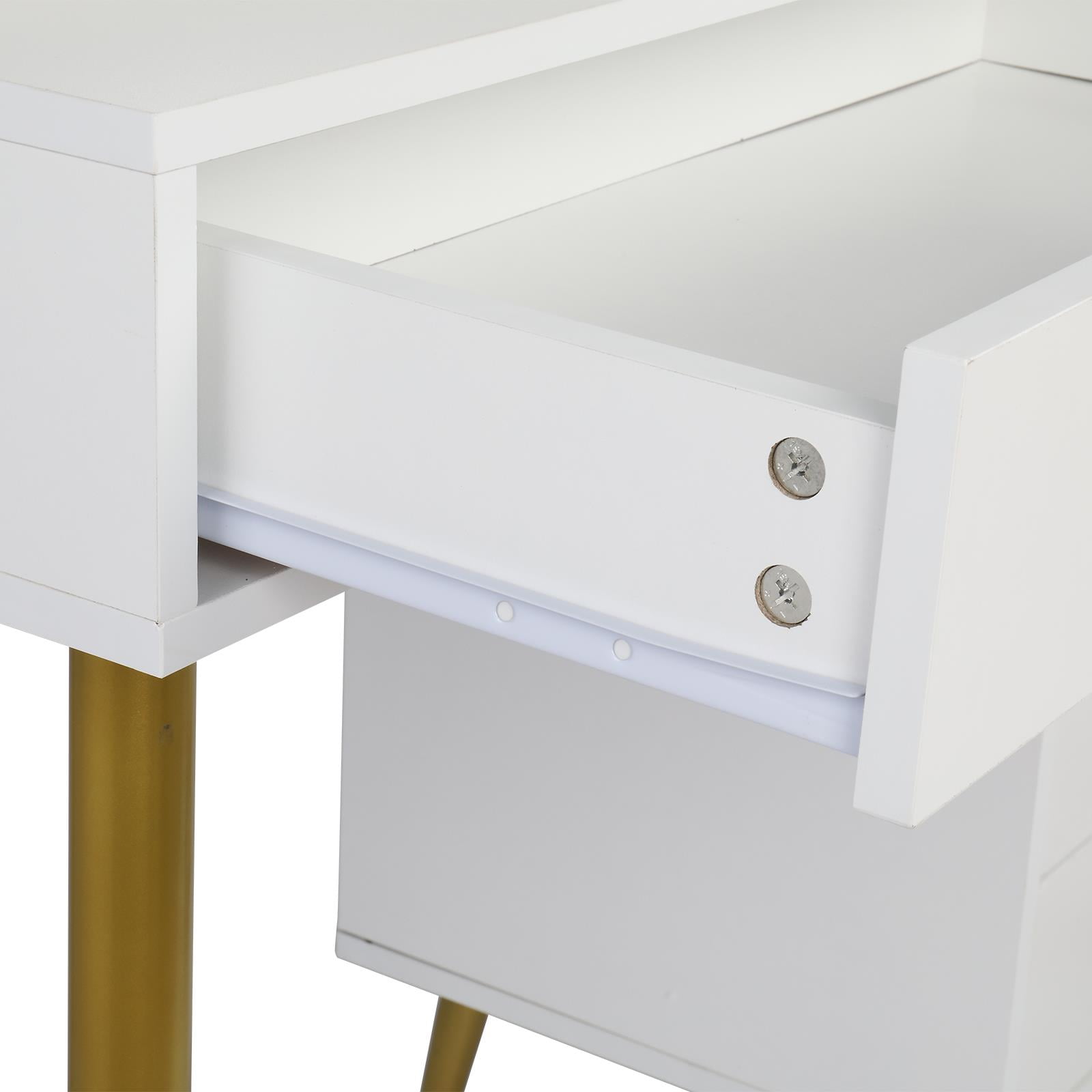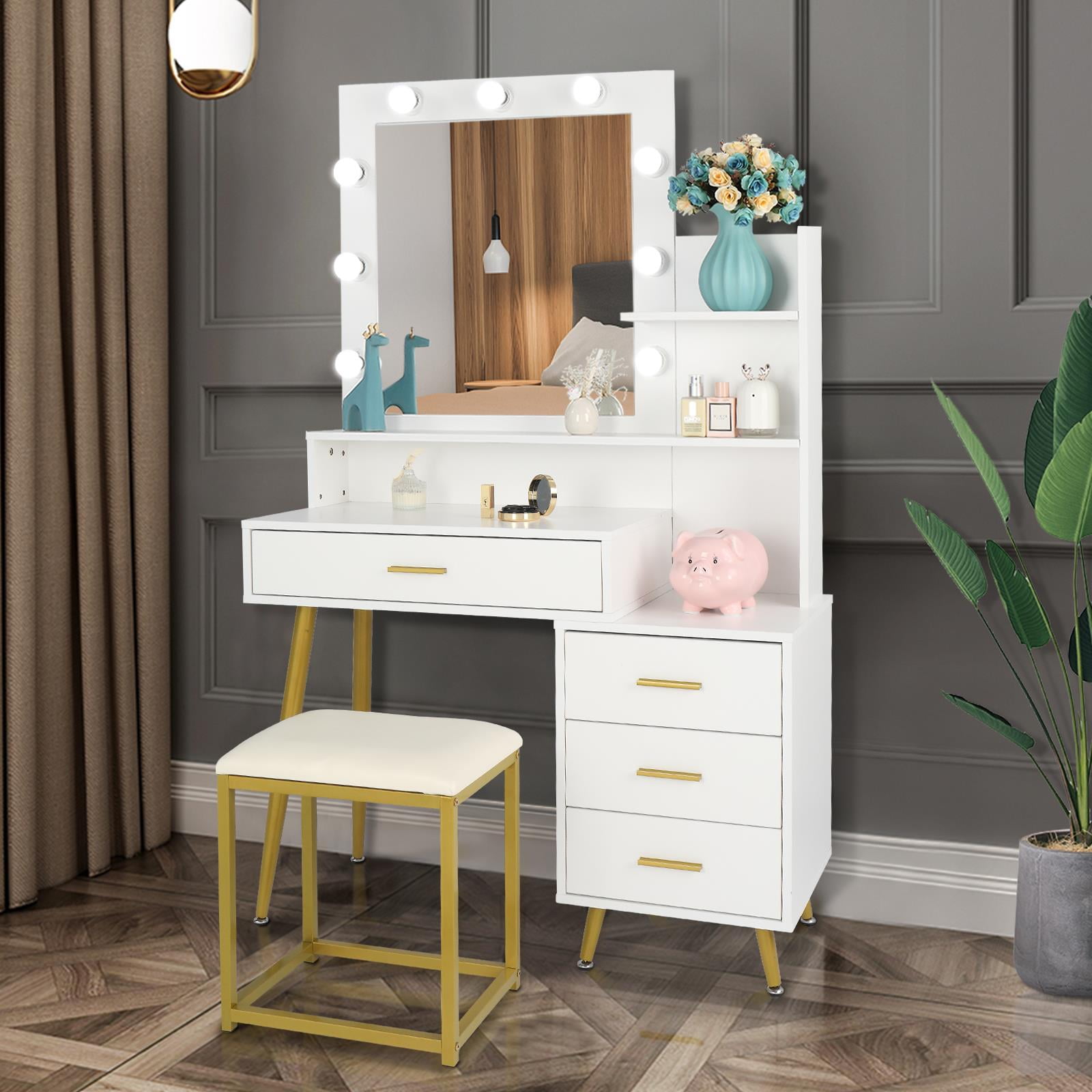 – Still trouble with the mess of your beauty products? This vanity set with shelves and drawers will help you. Open shelves next to the mirror, storage drawers and cabinet. You can always find a place for your cosmetics, jewelry, and hair accessories. – Big size, hollywood-style mirror well reflects your makeup and hair style. Equipped with 10 LED light bulbs, this makeup table will help you find your perfect viewing angle everytime and make you look glamorous for every date. – Comes with large mirror and 9 LED light bulbs. It helps you look more beautiful and light up. Help you resolve the trouble with the dim light when applying makup or skin care whether in the day or night. – This modern makeup vanity table is composed of a white and gold color, which is well blended in any home decoration style. Sleek linear design perfect shows simplicity and modern fashion in your bedroom. An ideal gift for your girl when birthday, Valentine’s Day, Mother’s Day, or Christmas GIFTS FOR WOMEN – Come with labeled pieces and and assembly manual. Just follow the steps and you will get a new dressing table set before you know it. In case you receive product with any flow or damageds, feel free to contact us with pictures for a kindly check firstly. It will save your time that we find the problem and provide the solutions according to your help. 4 Drawers