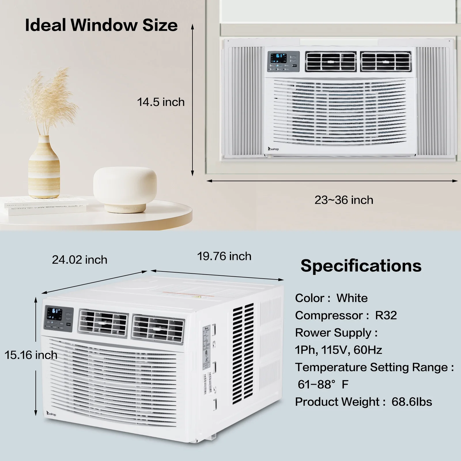 Introductions: Elevate your living space with Ktaxon Window Air Conditioner, a versatile and energy saving solution for year-round temperature control. Designed for medium to large-sized rooms, this unit not only cools but also provides heat and dehumidification, ensuring your environment is always just right. With its Wi-Fi enabled features, you can effortlessly control your indoor environment from anywhere using your smartphone. ❄️8000 BTU-Heater-WIFI❄️ Power Supply: 1Ph-115V-60Hz Cooling:RATED Capacity: 8000 Btu/h Heating:RATED Capacity: 4000 Btu/h,RATED Input (Heater): 1320W Power Cord Length: 4.9ft / 1500mm Application Area (Cooling EPA): 250-350 sq.ft. Operation temp Indoor (Cooling/Heating): 61-88°F /16-31°C Operation temp Outdoor (Cooling/Heating): 61-88°F/16-31°C Window Opening:Width (Min/Max): 26/36inch (66/91.4cm),Height (Min): 16inch / 40.6cm Dimensions: (19.76 x 24.02 x 15.16) in / (50.2x61x38.5)cm (LxWxH) Net Weight: 68.6 lbs / 31.1 kg ❄️12000 BTU-Heater-WIFI❄️ Power Supply: 1Ph, 230/208V~, 60Hz Cooling:RATED Capacity: 12000/11600 Btu/h Heating:RATED Capacity: 11000/9000 Btu/h,RATED Input (Heater): 3500/2800W Power Cord Length: 4.9ft / 1500mm Application Area (Cooling EPA): 450-550 sq.ft. Operation temp Indoor (Cooling/Heating): 61-88°F/16-31°C Operation temp Outdoor (Cooling/Heating): 61-88°F/16-31°C Window Opening:Width (Min/Max): 26/36inch (66/91.4cm),Height (Min): 16inch / 40.6cm Dimensions: (19.76 x 24.02 x 15.16) in / (50.2 x 61 x 38.5) cm (LxWxH) Net Weight: 78 lbs / 35.4 kg ❄️18000 BTU-Heater-WIFI❄️ Power Supply: 1Ph, 230/208V~,60Hz Cooling:RATED Capacity: 18000/17600 Btu/h Heating:RATED Capacity: 10600/8600 Btu/h,RATED Input (Heater): 3500/2800W Power Cord Length: 4.9ft/1500mm Application Area (Cooling EPA): 700-1000sq.ft. Operation temp Indoor (Cooling/Heating): 61-88°F / 16-31°C Operation temp Outdoor (Cooling/Heating): 61-88°F / 16-31°C Window Opening:Width (Min/Max): 28/41inch (712/104.1cm),Height (Min): 19inch/48.3cm Dimensions: (23.6×25.4×17.9) in/(60×64.5×45.5) cm (LxWxH) Net Weight: 108.7lbs/49.3 kg ❄️23000 BTU-Heater-WIFI❄️ Power Supply: 1Ph, 230/208V~, 60Hz Cooling:RATED Capacity: 23200/22700 Btu/h Heating:RATED Capacity: RATED Capacity: 10600/8600 Btu/h,RATED Input (Heater): 3500W Power Cord Length: 4.9ft / 1500mm Application Area (Cooling EPA): up to 1500 sq.ft. Operation temp Indoor (Cooling/Heating): 61-88°F / 16-31°C Operation temp Outdoor (Cooling/Heating): 61-88°F / 16-31°C Window Opening:Width (Min/Max): 30/41inch (76.2/104.1cm)Height (Min): 19.5inch / 49.5cm Dimensions: (26.4×26.9×18.7)in/(67.1×68.2×47.6) cm (L x W x H) Net Weight: 125.2 lbs/56.8 kg Package Includes: 1 x Air Conditioner 1 x Remote Control 1 x Window Installation Kit 1 x Set of Screws