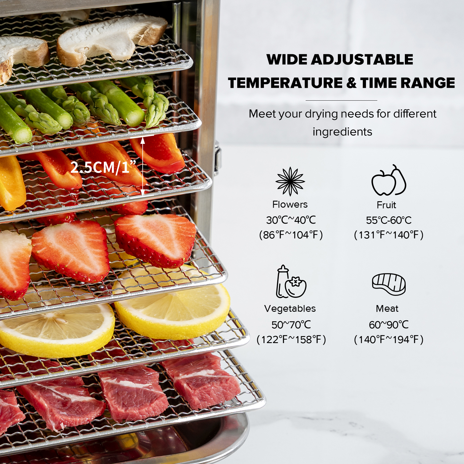 Features 【Food-Grade Stainless Steel】 Our food dehydrator made of BPA free food grade stainless steel for you to dry all kinds of vegetables, fruits, meat, fish and shrimp, and other foods. It can lock the minerals and vitamins in the food, Keep more nutritious. 【Drying System】 400W of heating power, 5-inch integrated air-circulating fan generates forced hot-air convection that evenly heats all the trays, which makes our food dehydrator more efficient. 【LED Smart Panel Operation】 You can set the drying timer from 0 to 24 hours and adjusted 30 minutes/time. The Temperature setting from 30℃/ 86℉ to 90℃/ 194℉, adjust the temperature difference every 5 ℃/ 9℉, better drying temperature. 【Glass Window】 The glass Window is convenient for you to track the progress of drying ingredients. 【EasyTo Clean & Free Recipes】 The racks and tray are totally dishwasher safe. You can use a wet cloth to clean the house easily. Our food dehydrator gives away free recipes to provide you with 67 kinds of ingredients so that you can enjoy the fun of handmade.