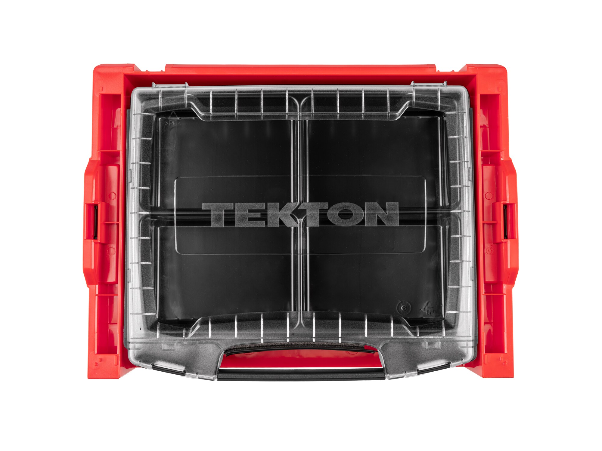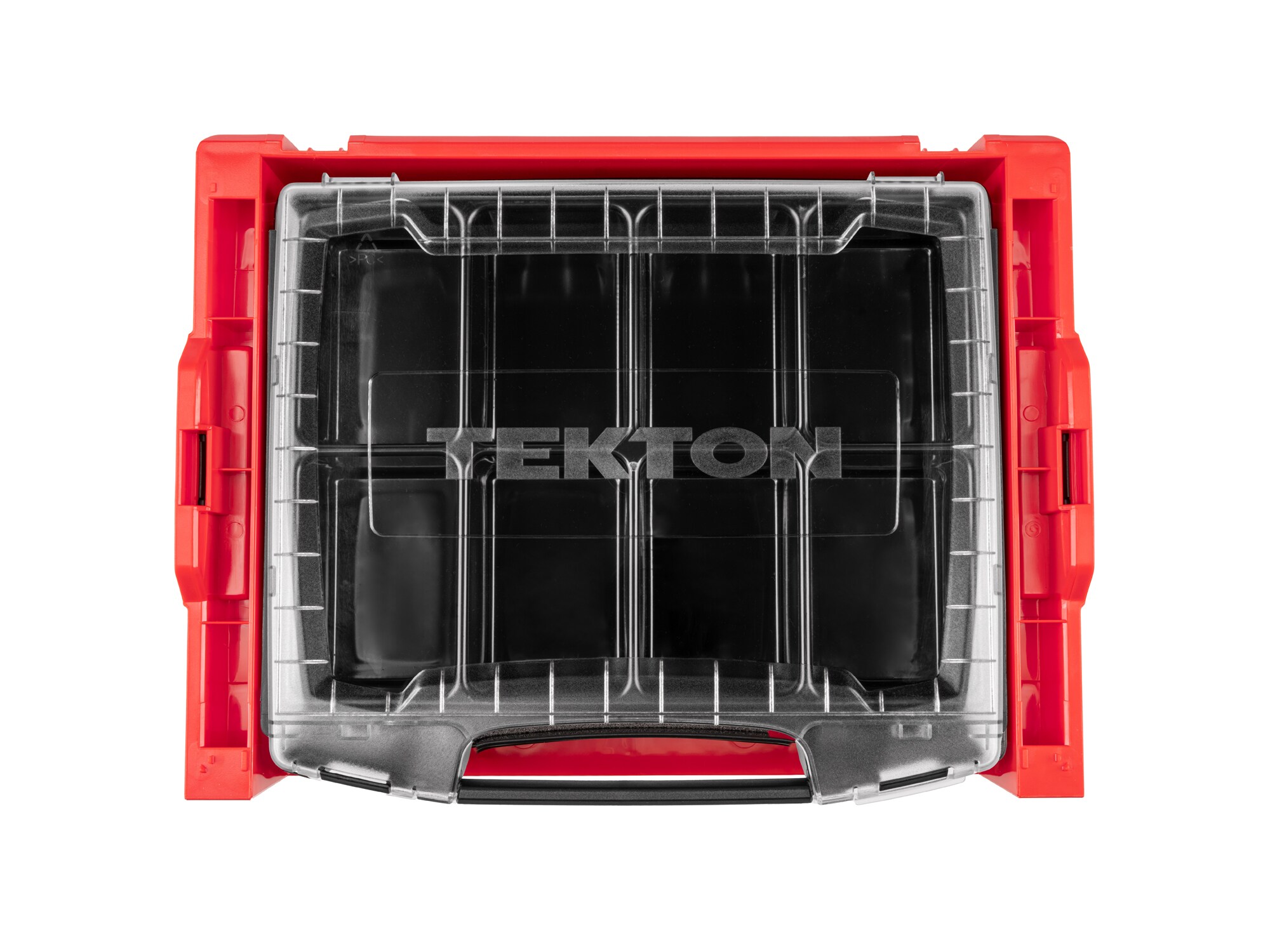 The Tekton Lidded Drawer with 12-Cavity Parts Tray is part of the L-BOXX Stacking Organization System and easily integrates with all other components in the L-BOXX family of products, providing virtually infinite options for configuring your own custom organization system. This set includes a lidded drawer with a 12-cavity parts tray. The lidded drawer offers quick access to drawer contents without taking apart your organization stack. The included weather-resistant vinyl label allows for easy identification of drawer contents and can be written on with pencil, pen, and felt-tip markers. Twelve cavities in the tray allow you to organize small parts the way you want, and the lid prevents tray contents from falling out of their compartments. Tabs on the rack rail keep the drawer in place. Lift the drawer up to pull it out of the rack. Handles on the side of the rack provide stability when latching components together. Press both side handles in and lift up to remove the rack from the stack.