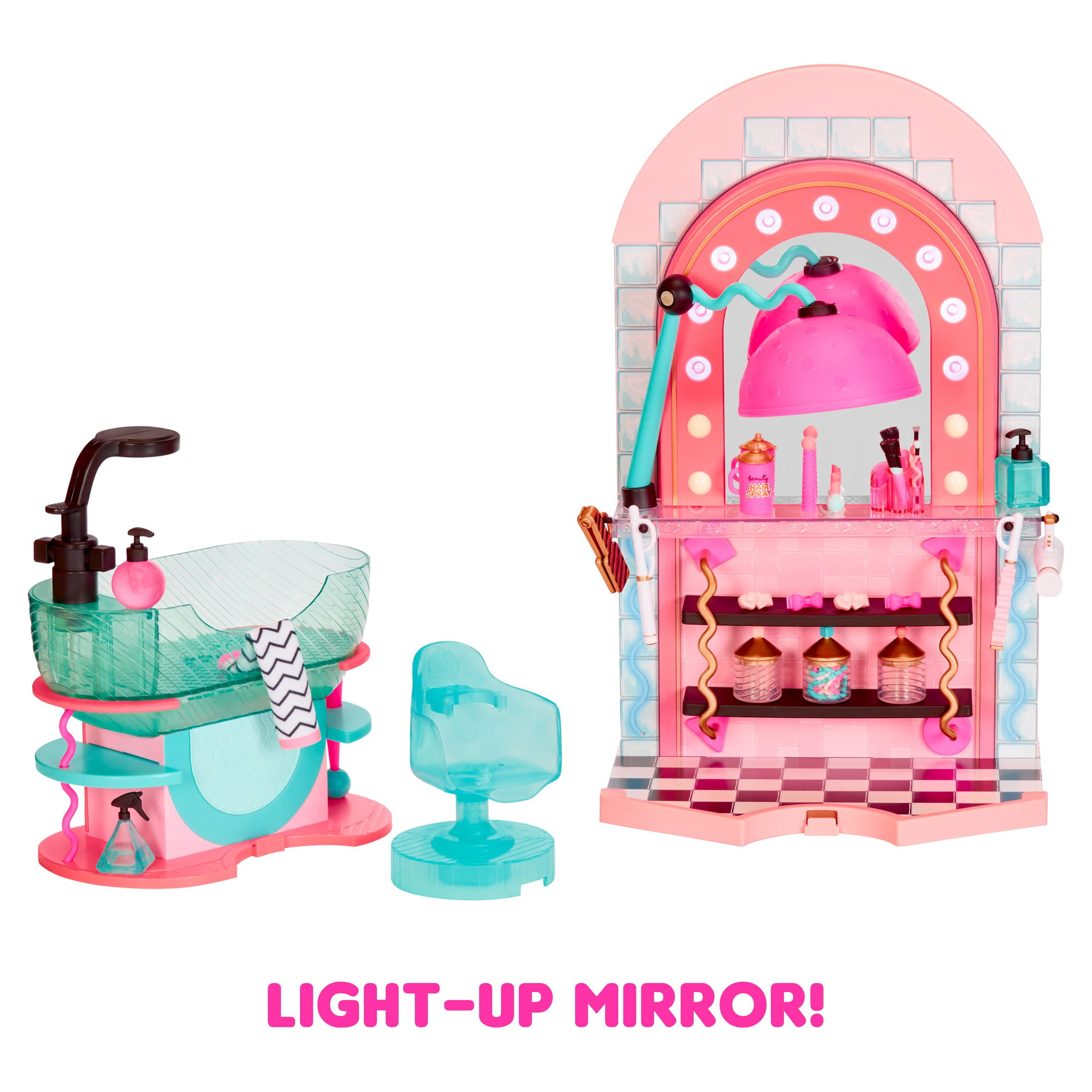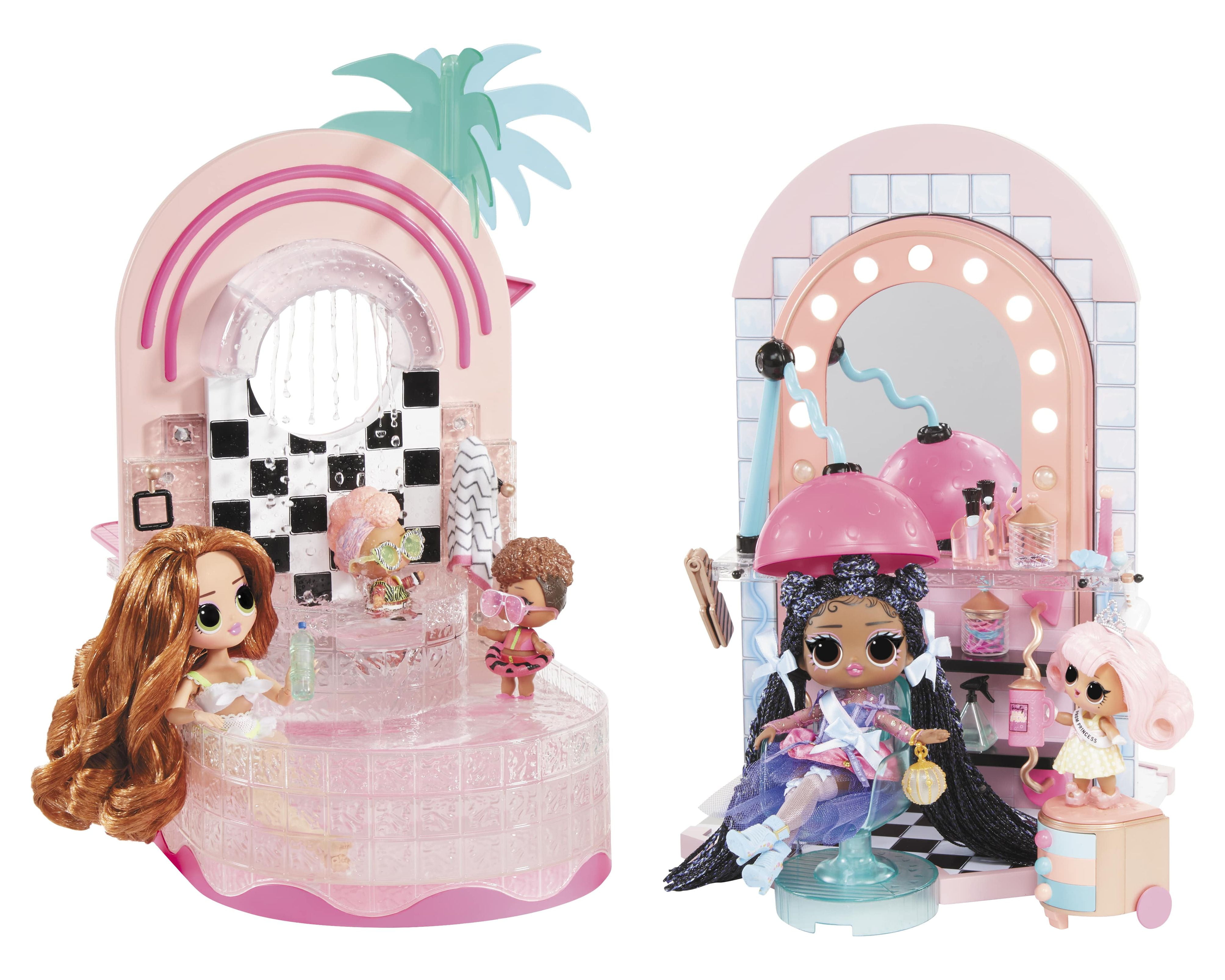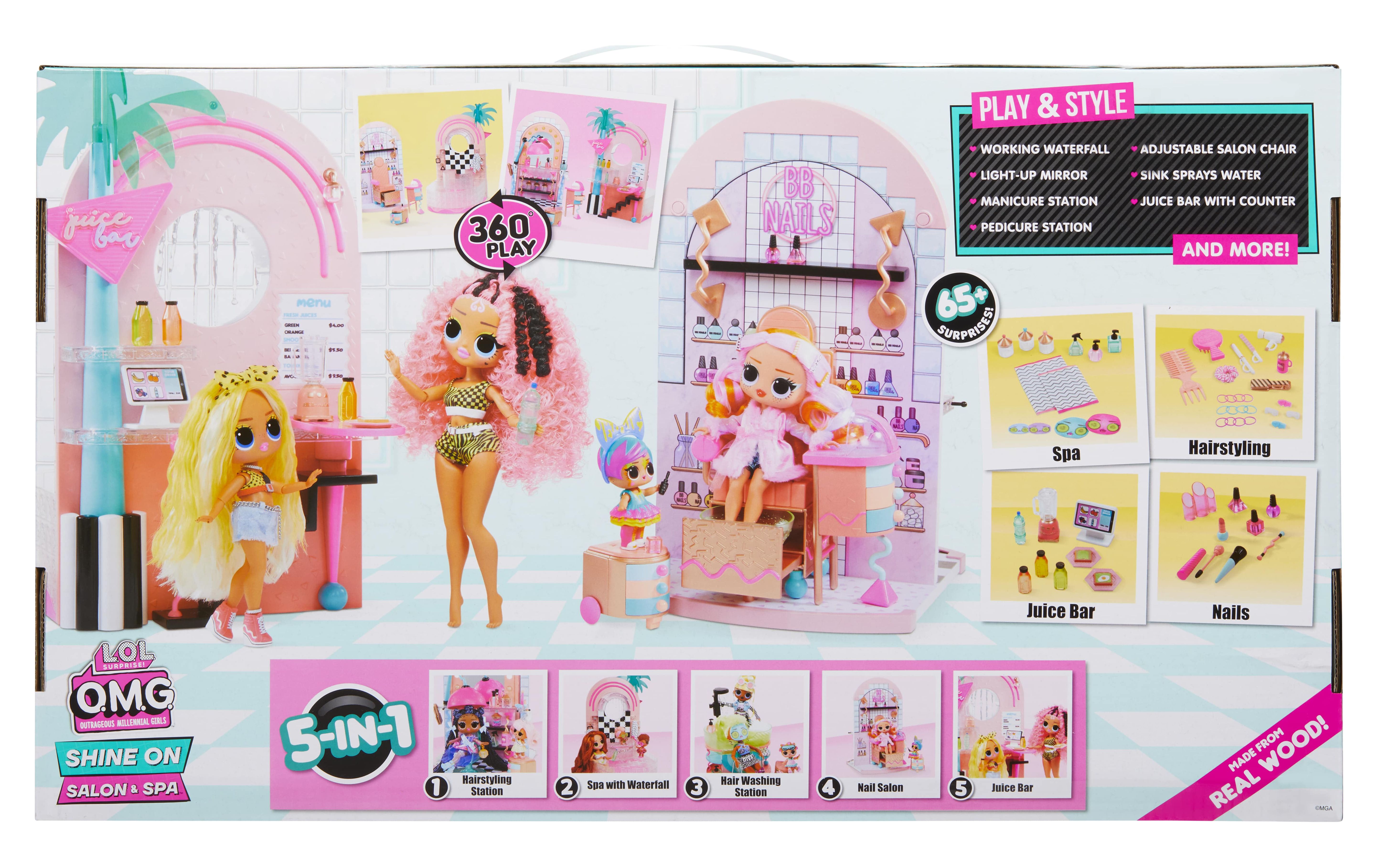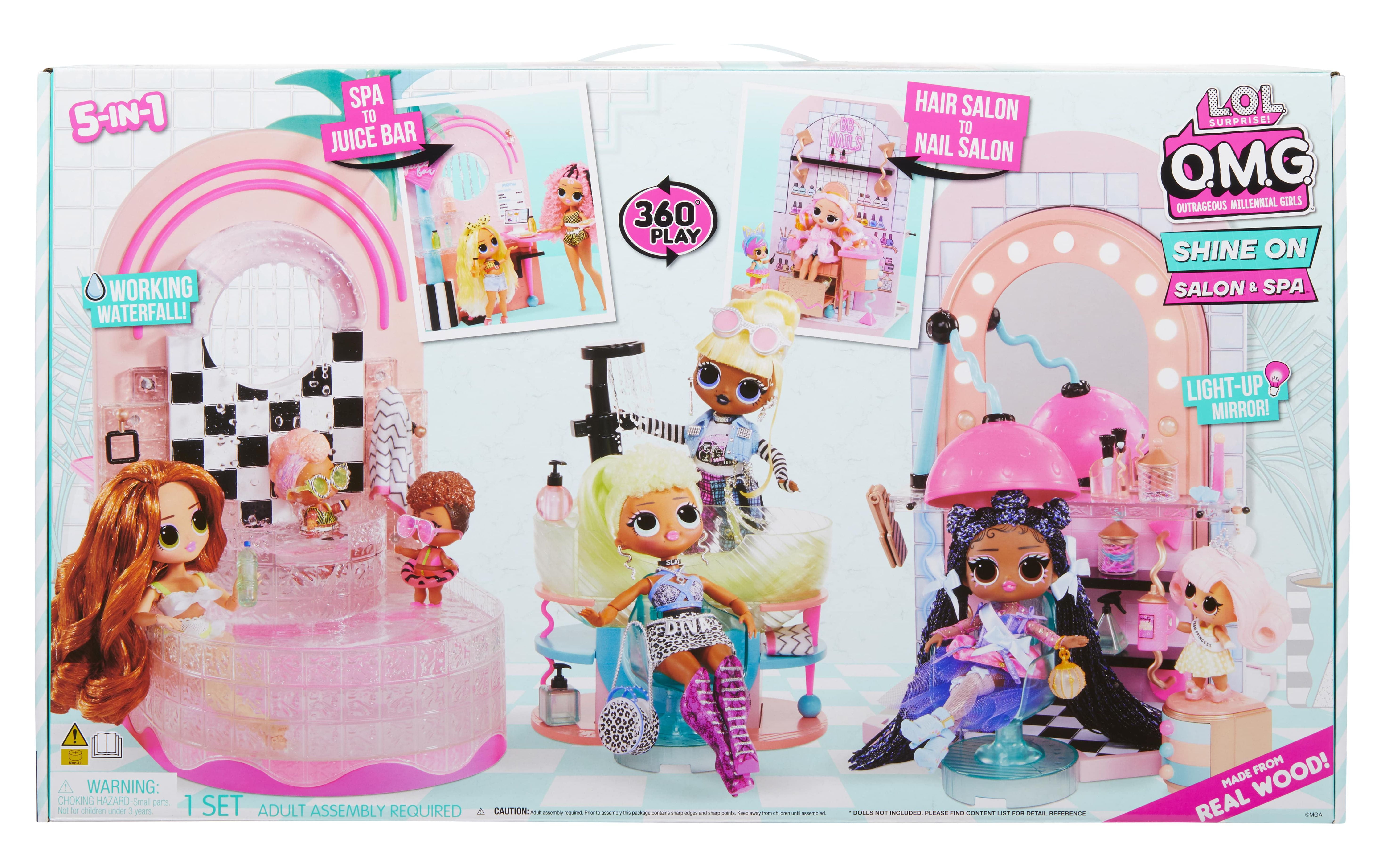 Ready for the ultimate spa day B.B.s? Check out the all-new L.O.L. Surprise Shine On Salon & Spa ™. This 5-n-1 playset includes: a spa with a working waterfall, a hair salon with a light-up mirror, a working hair washing station, a nail salon, and a juice bar. Unbox 65+ surprises including hair styling accessories, working face masks for your dolls, and more for the best experience in interactive glam play! Start out at the spa that fits both OMG fashion dolls and collectible dolls and check out the working waterfall. PRO TIP: Bring along your favorite color change doll to check out their transformation in real-time. Bad hair day? Head over to the hair salon, that includes multiple hair styling accessories and an adjustable salon chair. Slide the salon chair next to the working hair washing station to wash your doll’s hair. The mirror also lights up so you can check out your new ‘do too! No spa day is complete without a trip to the nail salon and juice bar. Grab a mani/pedi and then head over to the juice bar for some avocado toast and celery juice to re-fuel from a glam packed day. Pair this playset with the L.O.L. Surprise Mall of Surprises and the O.M.G. House of Surprises Dollhouse to create an entire world-of-play for all your fashion and collectible dolls!