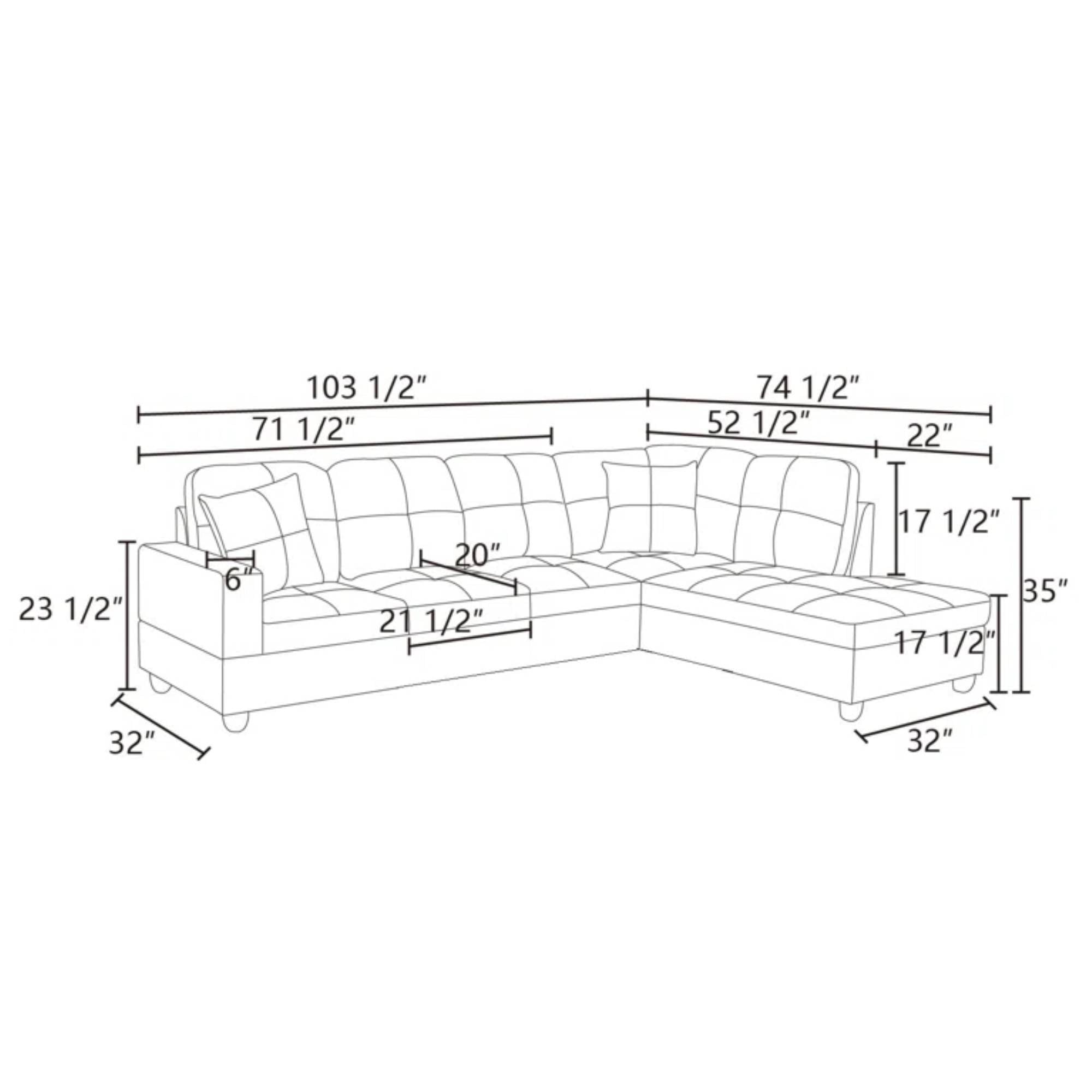 Transform your living room or family room with this L Shape sofa and chaise set. Built on a sturdy engineered wood frame, this sofa features luxurious faux leather upholstery, plush foam filling, and hand-tied springs for ultimate comfort. The sofa couch ’s design includes tufted back cushions, square armrests, and a loose back for a relaxed look. Elevated by block feet, this sofa also comes with two decorative toss pillows for added coziness. Unwind on the chaise after a long day, or invite friends over to comfortably seat up to four people for movie nights. At 103” wide, this sectional sofa set is perfect for spacious living areas. Feature: