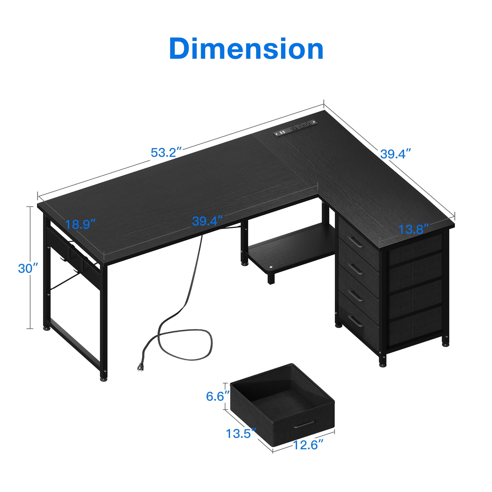 L Shaped Computer Desk with Charging Station , 53 inch PC Table Study Desk 4 Tier Drawers, Modern Simple Style Laptop Desk for Bedroom, Gaming