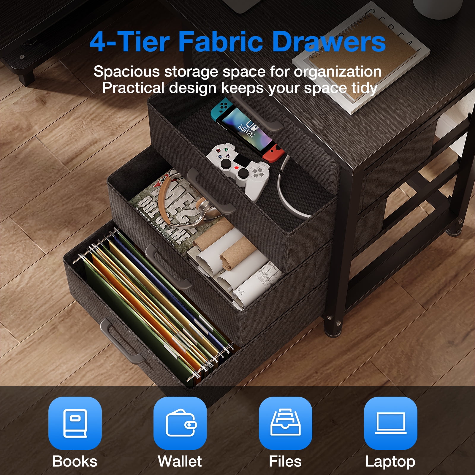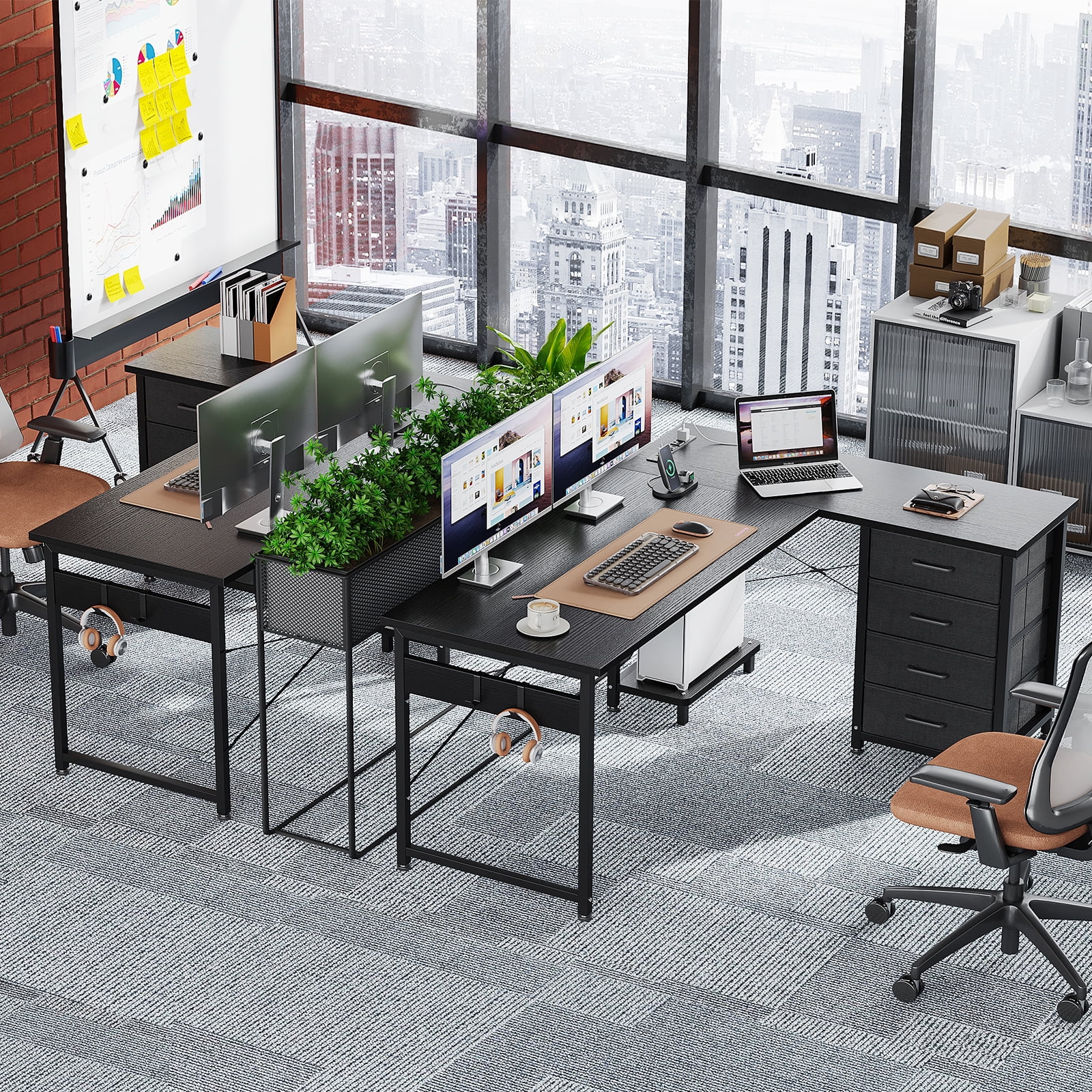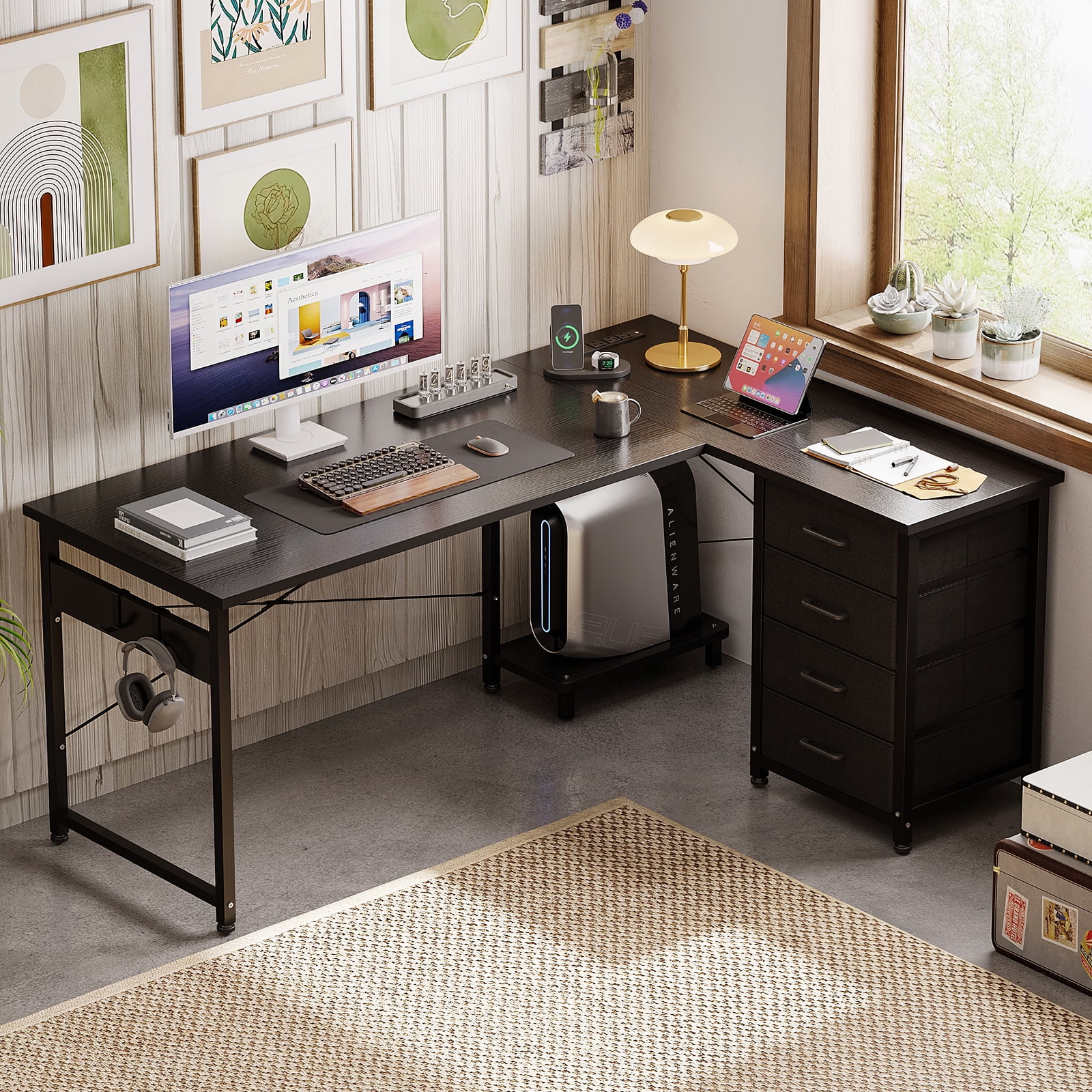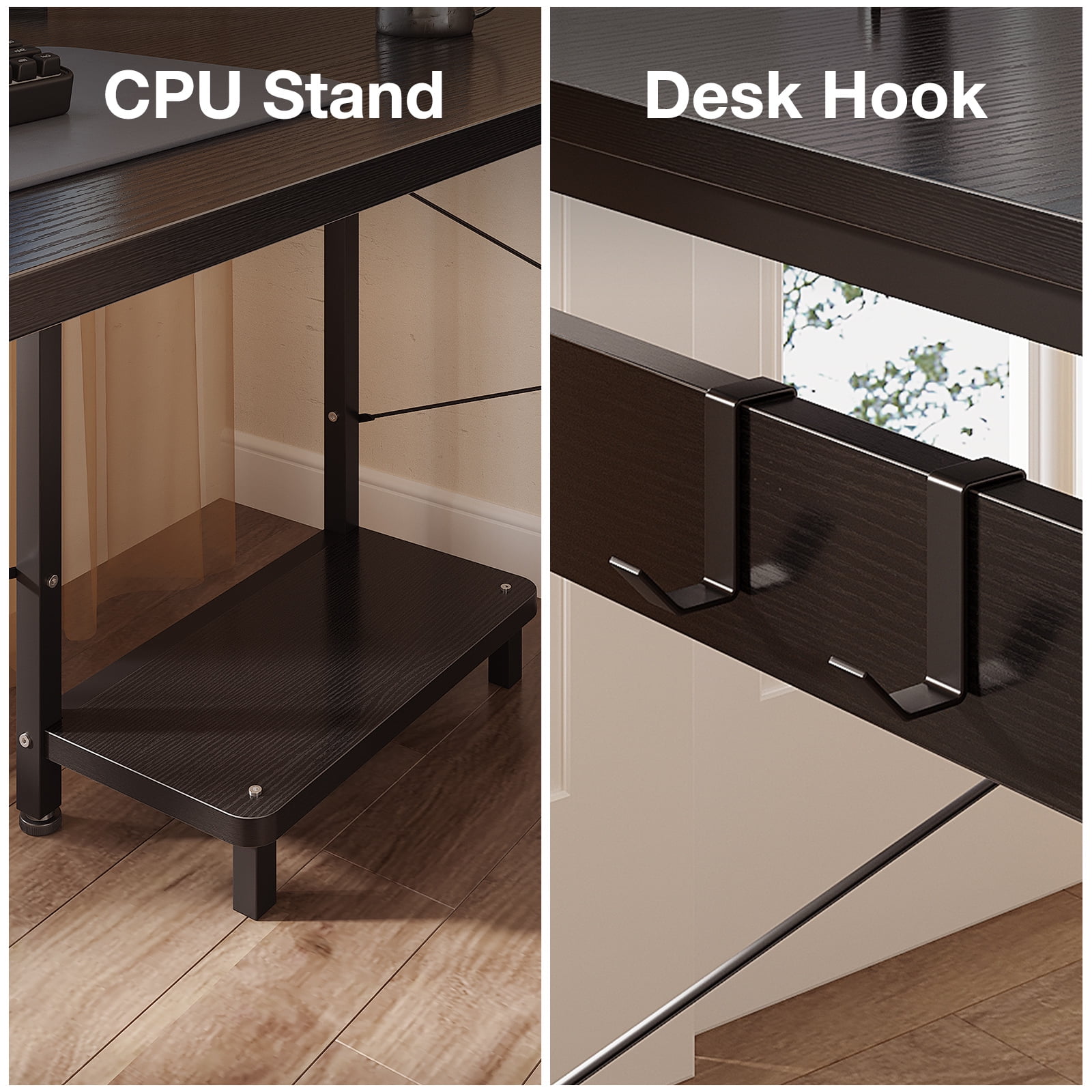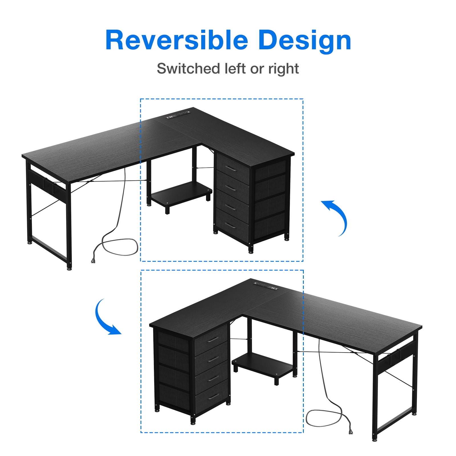 Smart Storage with 4 Drawers & Hooks – Organize documents, gadgets, and cables with 4 smooth-glide drawers and 2 iron hooks, keeping your desktop clutter-free. Built-in Power Outlet & Reversible Layout – Charge all your devices with 3 AC outlets and 2 USB ports. The L-shape design can be reversed for left or right corner setups. Durable Materials & Host Stand Design – Waterproof desktop and sturdy metal frame ensure long-lasting use. Raised CPU stand improves ventilation and saves under-desk space.