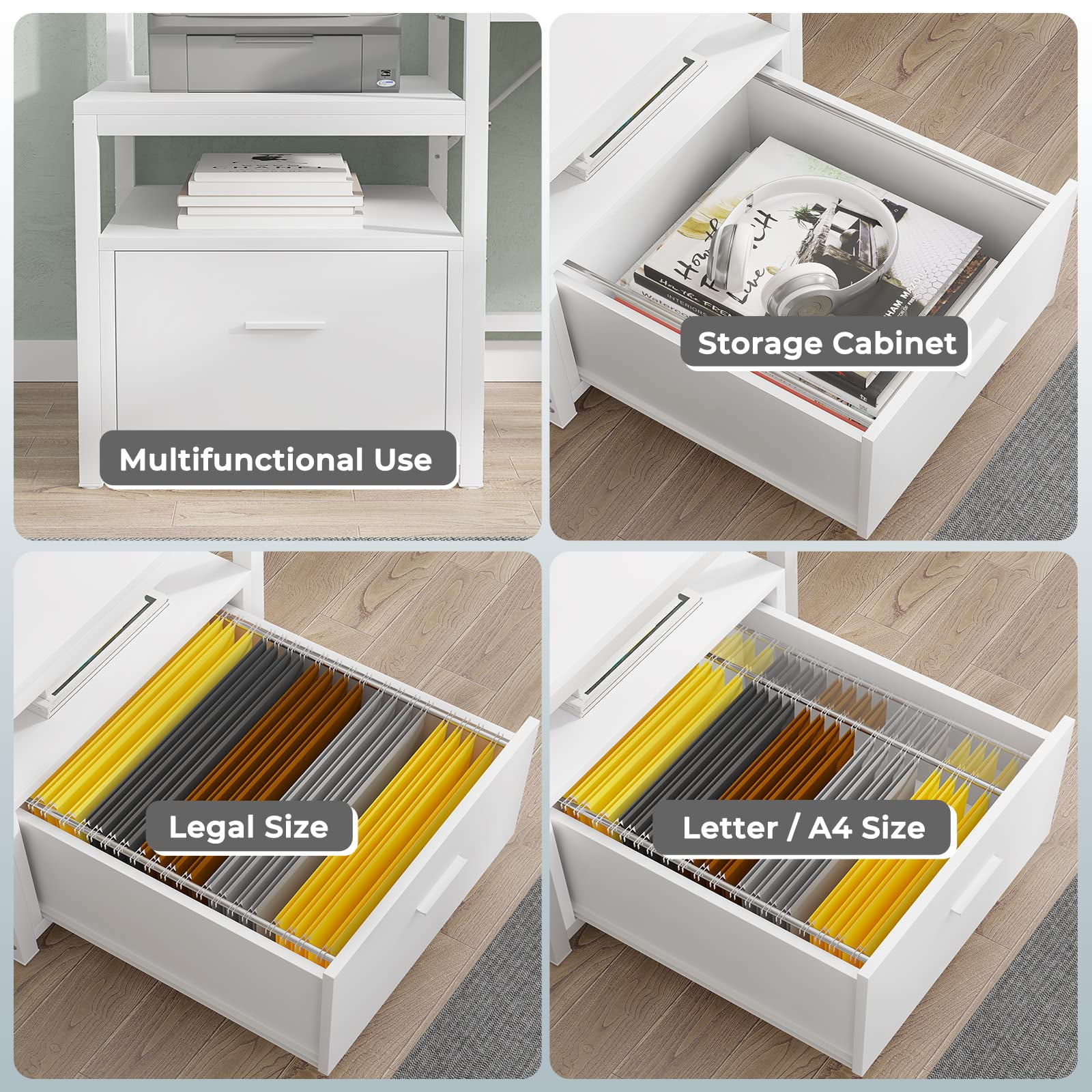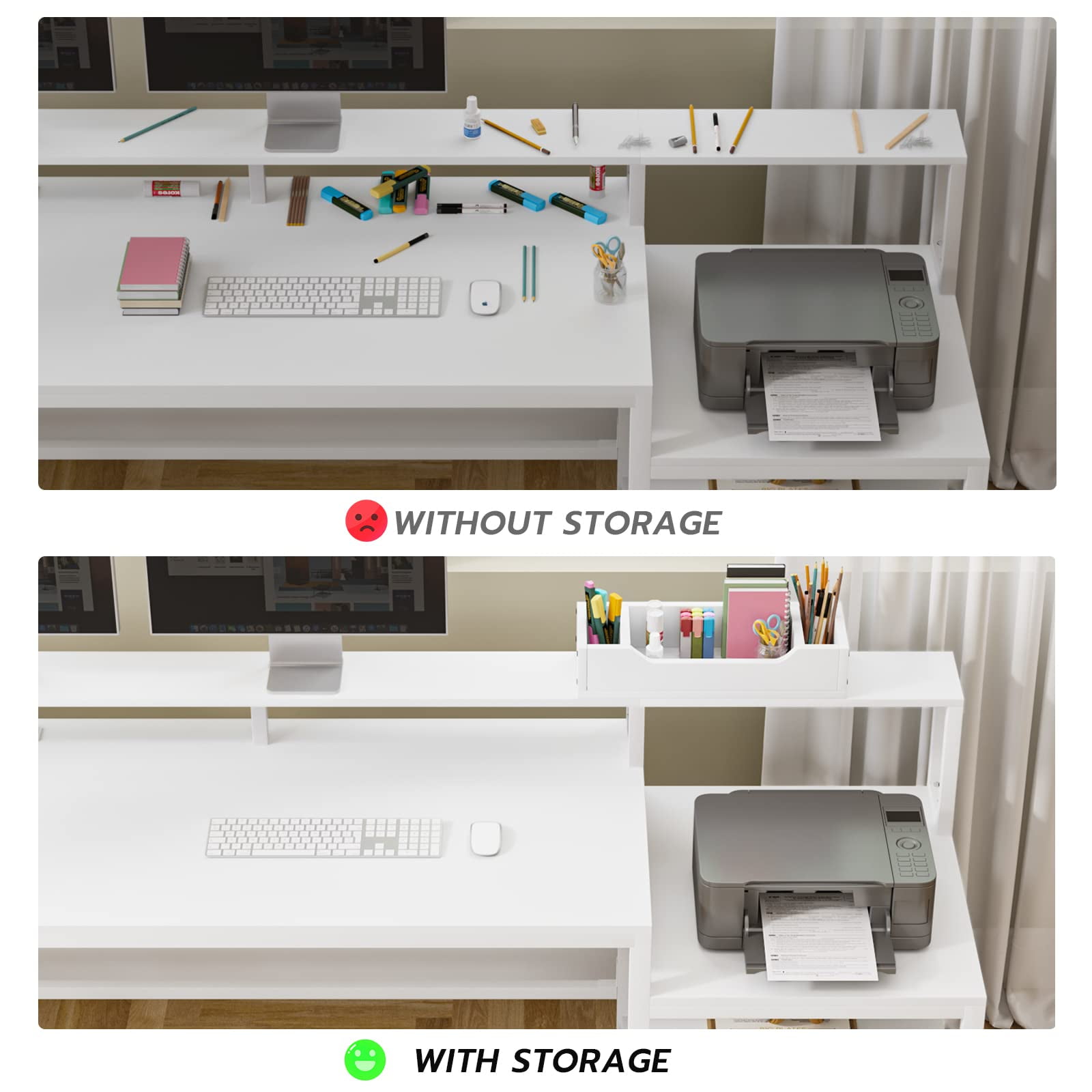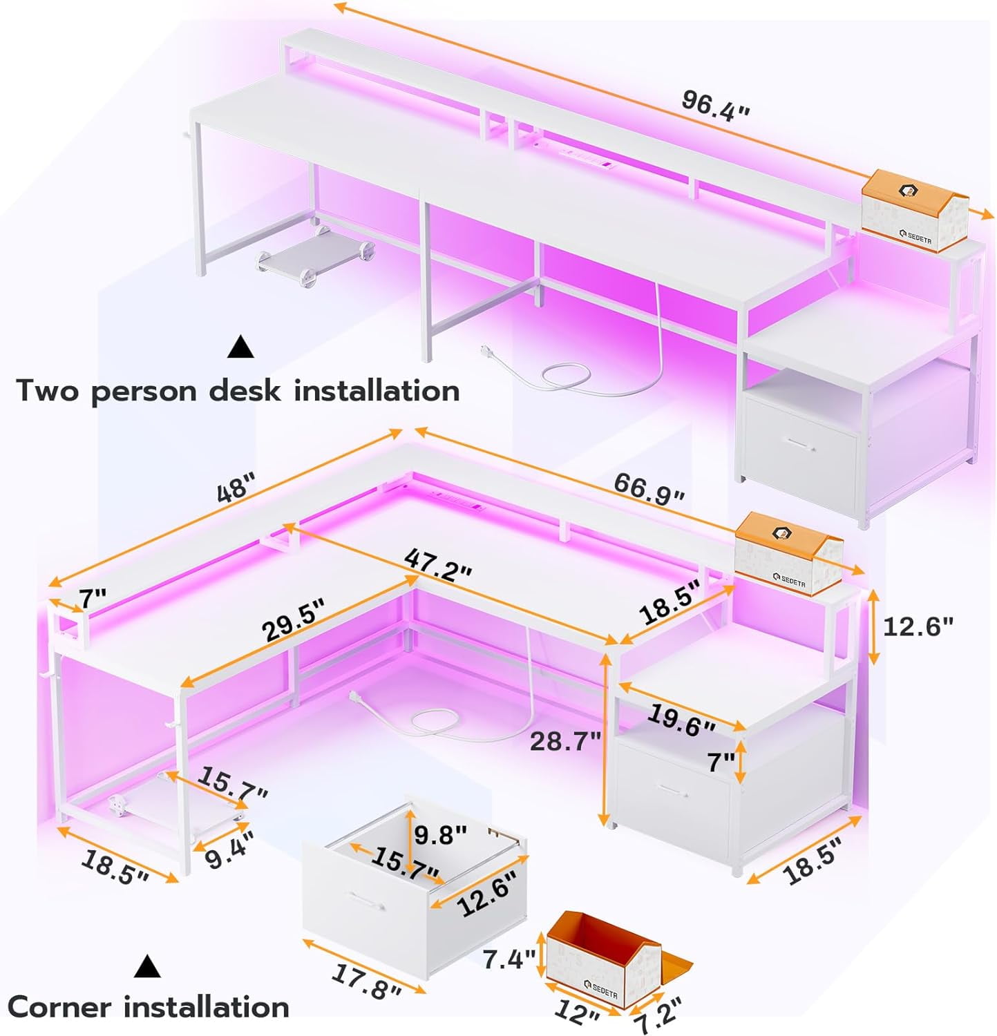Specification: Color: White Style: Modern Shape: L-Shape Desk design: Computer Desk Product Dimensions: 48″D x 66.9″W x 34.6″H Top Material Type: Engineered Wood Special Feature: Built-In Monitor Stand, Ergonomic Room Type: Office Number of Drawers: 1 Feature: 【Reversible Desk】Reversible 67 inch corner desk or 96.4 inch two person desk: The L shaped computer desk could hold three desktop computers and one notebook computer. 【Ample Storage Space】Coming with a file drawer, printer cabinet and 2 tier storage shelves, with powerful storage space. File cabinet can hold letter /A4/ legal size files. This solid constructed L shaped computer desk could hold printers, scanners, fax machines and any other office machines. 【Multipurpose Desktop Organizer】This storage organizer is perfect for desk accessories, pencils, pens, painting pens, correction tape,scissors ,TV Remote and more. Our storage organizer will allow for you to save space and keep an organized and neat feel for your desktop. 【Cool & Smart Led Light Strips 】The gaming desk comes with RGB LED light strip, remote control via APP, Over 60000 colors and 29 flashing modes for your to choose. Led light strip with music sync function, built-in sensitivity adjustable mic, led light color will change with the rhythm of the sound and music. 【For Health】The monitor shelf conforms to the ergonomic structure, which effectively reduces the pressure on the back and neck, so that you don’t need to worry too much about health problems when you were working.