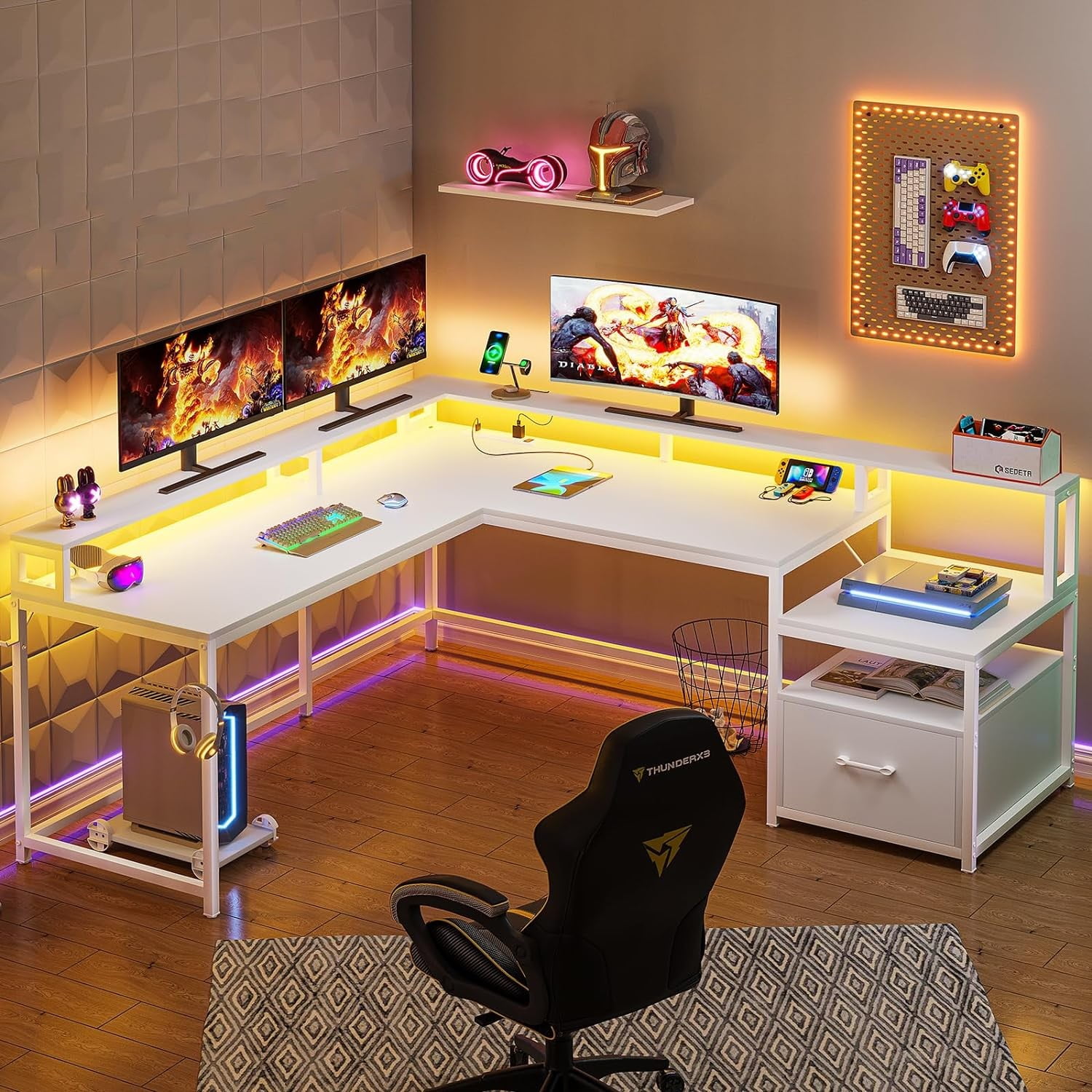 L Shaped Desk with LED Lights, Corner Computer Desk with File Drawer and Power Outlet, Gaming Desk for Home Office, White