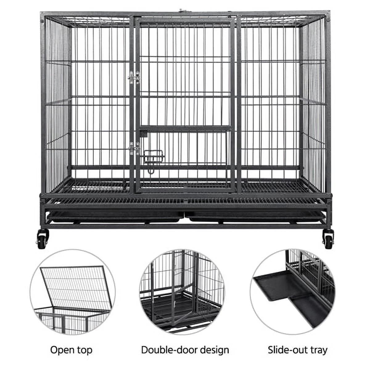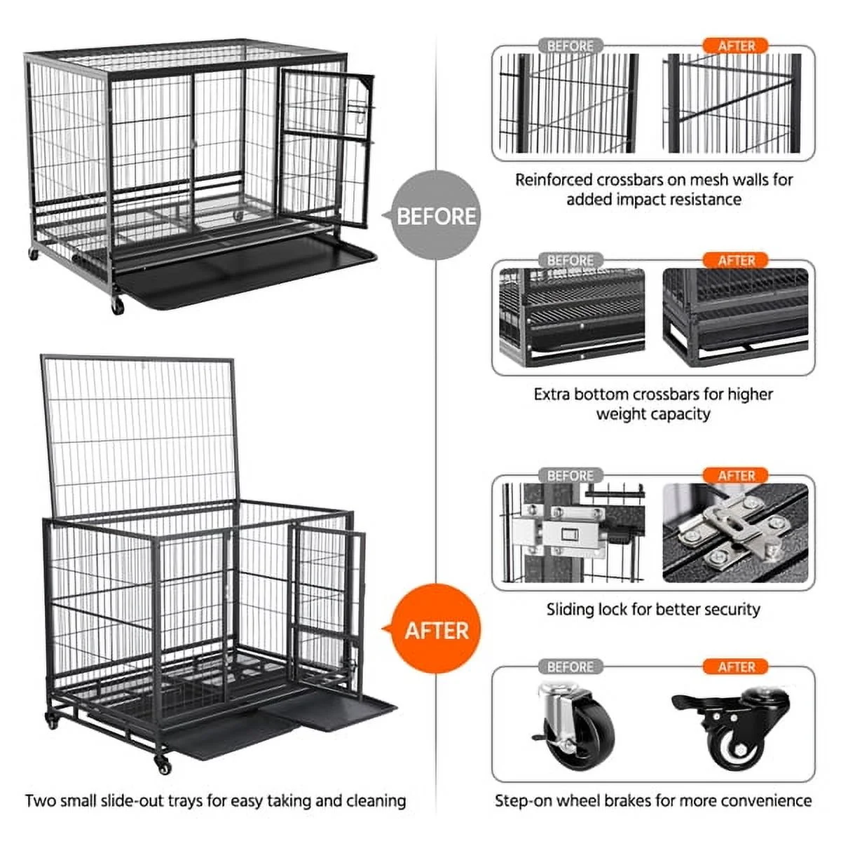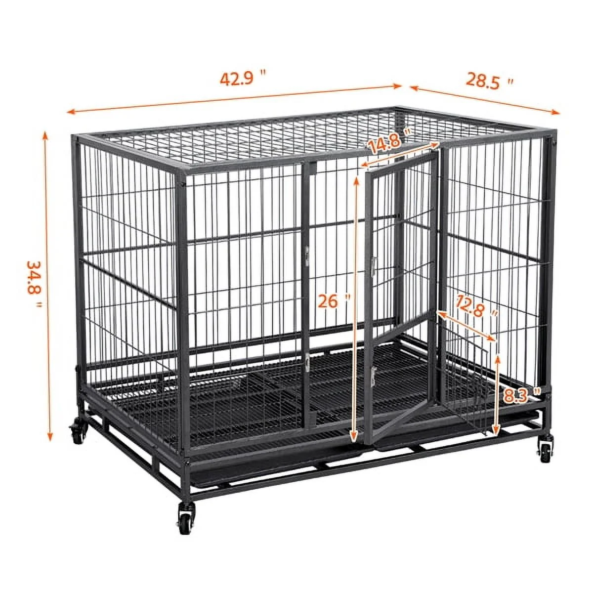 *Features: Guaranteed durability: Our robust dog crate is constructed of quality metal frame covered with non-toxic hammertone paint and durable ABS litter pan. Rust-resistance and solid construction render this dog cage strong and safe for your pets to use. Double door design: The deluxe dog crate has a side-opening door and a flip-up top, which allows for easy entry in virtually any location. Good mobility: This large dog crate features four 360-degree industrial casters to guarantee the smooth, convenient and effortless rolling, 2 casters with brakes makes it easy to lock the crate in place. Spacious for large dog: Since comfort is always key,dog cage measures 110cm/43 inches long, 28.7 inches wide, and 35 inches high, providing adequate space for medium and large dogs to stand up in, stretch out and lay down in as comfy as they can be. Safe latching system: We applied a 2-step lock to avoid your little talents opening the doors, which can effectively secure your pets when you can’t be there to supervise them. Extra feeding door: A small built-in door on the door that can be opened separately renders convenience for feeding. Make cleaning a breeze: Two separated slide-out pans beneath the cage can be removed and easily washed with water and mild cleanser; the grate between pets and pans prevents pets from walking/lying directly on the litter pans, ensuring your pets’ hygiene and the tidiness of the crate. Simple assembly required: This dog cage is delivered in a flat package. It only required a few minutes of easy assembly under the illustrated manual and a sturdy metal dog cage is ready for use! Necessary hardware and tools are included. Foldable design: Our dog crate can fold down into a compact size for storing in slim and narrow areas when not in use, and of course, sets up within seconds for easy use. Suitable dog breeds: Our large dog cage is recommended for large dog like German Shepherd, Golden Retriever, Rottweiler, German Shorthaired Pointer, Alaskan Malamute and medium dogs such as Labrador Retriever, Bulldog, Poodle, Siberian Husky, Australian Shepherd, Shiba Inu.